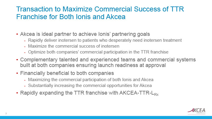 The collaboration allows for a very meaningful economics for both Akcea and for Ionis. It fast tracks our ability to grow the company, and it allows for the drug inotersen to be in a commercial-ready position as quickly as possible to successfully launch that product.