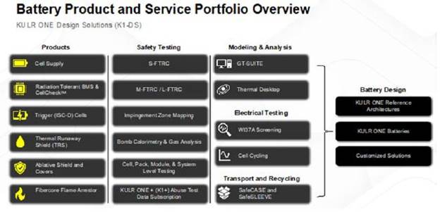 To address the need for a holistic approach, KULR developed a battery product and service portfolio over the course of the last decade that provides products, safety testing services, modeling and analysis services, electrical testing services, transport and recycling packaging and logistics, and battery design solutions. Collectively, this is referred to as KULR ONE Design Solutions (K1-DS), which is actively leveraged by the Company to facilitate engagement with customers no matter the battery life cycle phase they are in.