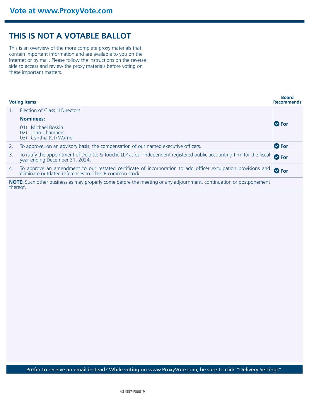THIS IS NOT A VOTABLE BALLOT This is an overview of the more complete proxy materials that contain important information and are available to you on the Internet or by mail. Please follow the instructions on the reverse side to access and review the proxy materials before voting on these important matters. Vote at www.ProxyVote.com Prefer to receive an email instead? While voting on www.ProxyVote.com, be sure to click “Delivery Settings”. Voting Items Board Recommends V31557-P06619 1. Election of Class III Directors For Nominees: 01) Michael Boskin 02) John Chambers 03) Cynthia (CJ) Warner 2. To approve, on an advisory basis, the compensation of our named executive officers. For 3. To ratify the appointment of Deloitte & Touche LLP as our independent registered public accounting firm for the fiscal year ending December 31, 2024. For 4. To approve an amendment to our restated certificate of incorporation to add officer exculpation provisions and eliminate outdated references to Class B common stock. For NOTE: Such other business as may properly come before the meeting or any adjournment, continuation or postponement thereof.