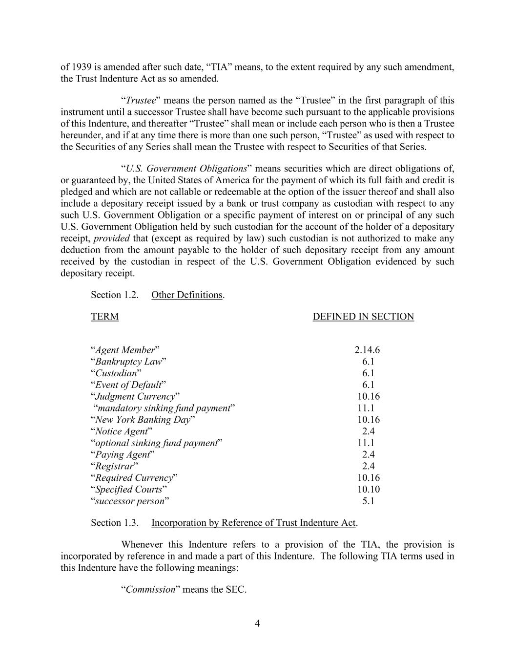 4 of 1939 is amended after such date, “TIA” means, to the extent required by any such amendment, the Trust Indenture Act as so amended. “Trustee” means the person named as the “Trustee” in the first paragraph of this instrument until a successor Trustee shall have become such pursuant to the applicable provisions of this Indenture, and thereafter “Trustee” shall mean or include each person who is then a Trustee hereunder, and if at any time there is more than one such person, “Trustee” as used with respect to the Securities of any Series shall mean the Trustee with respect to Securities of that Series. “U.S. Government Obligations” means securities which are direct obligations of, or guaranteed by, the United States of America for the payment of which its full faith and credit is pledged and which are not callable or redeemable at the option of the issuer thereof and shall also include a depositary receipt issued by a bank or trust company as custodian with respect to any such U.S. Government Obligation or a specific payment of interest on or principal of any such U.S. Government Obligation held by such custodian for the account of the holder of a depositary receipt, provided that (except as required by law) such custodian is not authorized to make any deduction from the amount payable to the holder of such depositary receipt from any amount received by the custodian in respect of the U.S. Government Obligation evidenced by such depositary receipt. Section 1.2. Other Definitions. TERM DEFINED IN SECTION “Agent Member” 2.14.6 “Bankruptcy Law” 6.1 “Custodian” 6.1 “Event of Default” 6.1 “Judgment Currency” 10.16 “mandatory sinking fund payment” 11.1 “New York Banking Day” 10.16 “Notice Agent” 2.4 “optional sinking fund payment” 11.1 “Paying Agent” 2.4 “Registrar” 2.4 “Required Currency” 10.16 “Specified Courts” 10.10 “successor person” 5.1 Section 1.3. Incorporation by Reference of Trust Indenture Act. Whenever this Indenture refers to a provision of the TIA, the provision is incorporated by reference in and made a part of this Indenture. The following TIA terms used in this Indenture have the following meanings: “Commission” means the SEC.