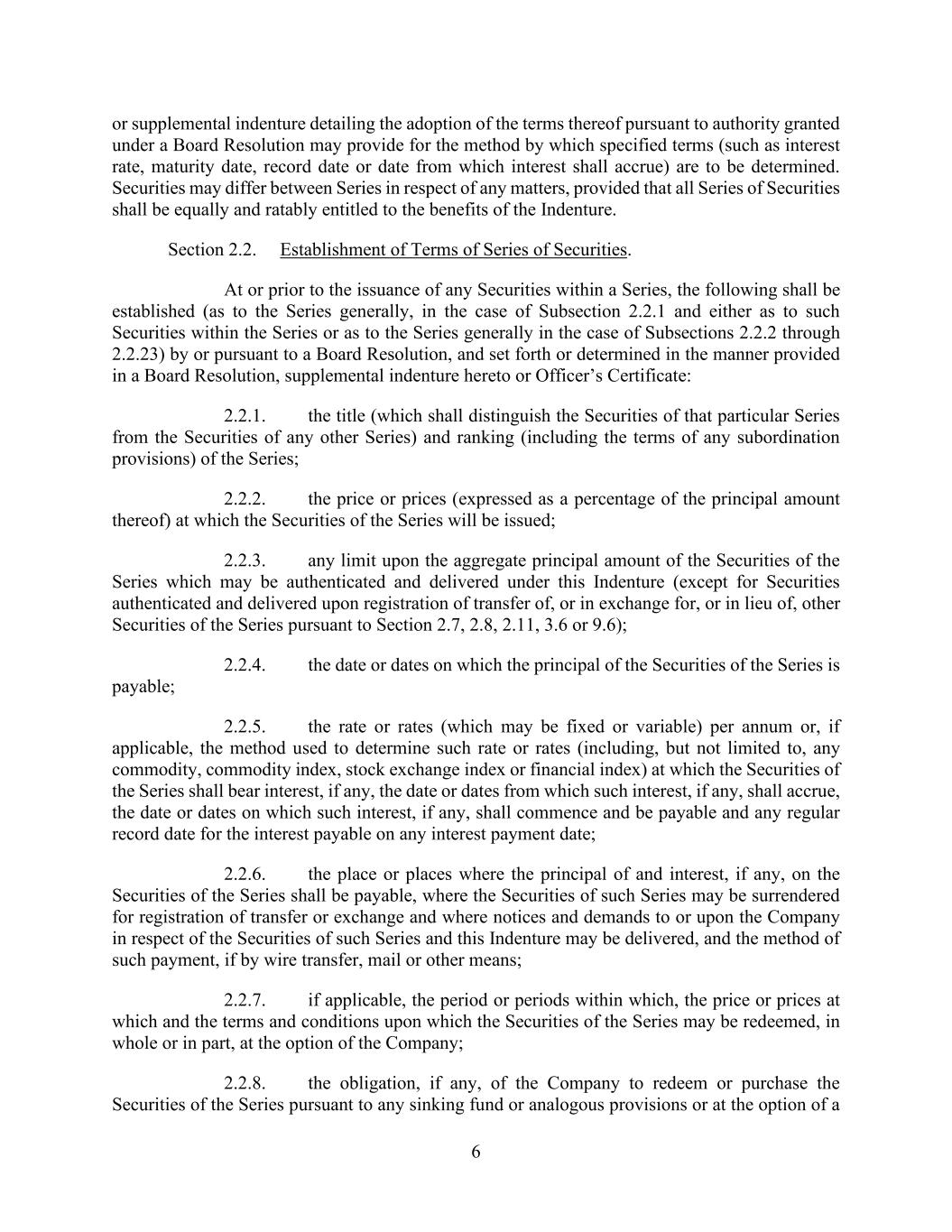 6 or supplemental indenture detailing the adoption of the terms thereof pursuant to authority granted under a Board Resolution may provide for the method by which specified terms (such as interest rate, maturity date, record date or date from which interest shall accrue) are to be determined. Securities may differ between Series in respect of any matters, provided that all Series of Securities shall be equally and ratably entitled to the benefits of the Indenture. Section 2.2. Establishment of Terms of Series of Securities. At or prior to the issuance of any Securities within a Series, the following shall be established (as to the Series generally, in the case of Subsection 2.2.1 and either as to such Securities within the Series or as to the Series generally in the case of Subsections 2.2.2 through 2.2.23) by or pursuant to a Board Resolution, and set forth or determined in the manner provided in a Board Resolution, supplemental indenture hereto or Officer’s Certificate: 2.2.1. the title (which shall distinguish the Securities of that particular Series from the Securities of any other Series) and ranking (including the terms of any subordination provisions) of the Series; 2.2.2. the price or prices (expressed as a percentage of the principal amount thereof) at which the Securities of the Series will be issued; 2.2.3. any limit upon the aggregate principal amount of the Securities of the Series which may be authenticated and delivered under this Indenture (except for Securities authenticated and delivered upon registration of transfer of, or in exchange for, or in lieu of, other Securities of the Series pursuant to Section 2.7, 2.8, 2.11, 3.6 or 9.6); 2.2.4. the date or dates on which the principal of the Securities of the Series is payable; 2.2.5. the rate or rates (which may be fixed or variable) per annum or, if applicable, the method used to determine such rate or rates (including, but not limited to, any commodity, commodity index, stock exchange index or financial index) at which the Securities of the Series shall bear interest, if any, the date or dates from which such interest, if any, shall accrue, the date or dates on which such interest, if any, shall commence and be payable and any regular record date for the interest payable on any interest payment date; 2.2.6. the place or places where the principal of and interest, if any, on the Securities of the Series shall be payable, where the Securities of such Series may be surrendered for registration of transfer or exchange and where notices and demands to or upon the Company in respect of the Securities of such Series and this Indenture may be delivered, and the method of such payment, if by wire transfer, mail or other means; 2.2.7. if applicable, the period or periods within which, the price or prices at which and the terms and conditions upon which the Securities of the Series may be redeemed, in whole or in part, at the option of the Company; 2.2.8. the obligation, if any, of the Company to redeem or purchase the Securities of the Series pursuant to any sinking fund or analogous provisions or at the option of a