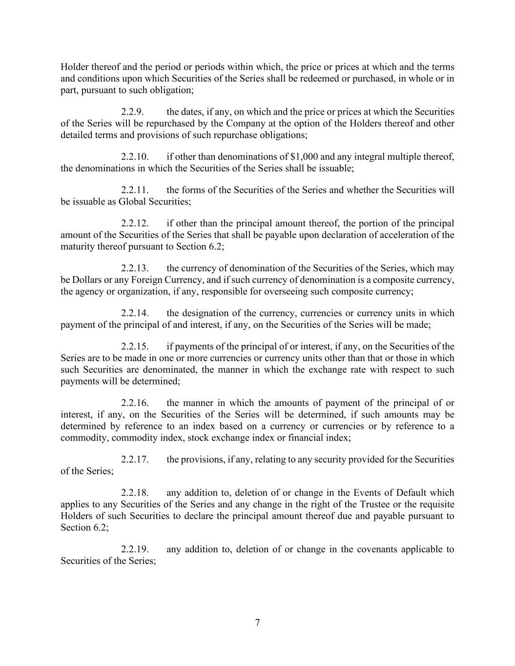 7 Holder thereof and the period or periods within which, the price or prices at which and the terms and conditions upon which Securities of the Series shall be redeemed or purchased, in whole or in part, pursuant to such obligation; 2.2.9. the dates, if any, on which and the price or prices at which the Securities of the Series will be repurchased by the Company at the option of the Holders thereof and other detailed terms and provisions of such repurchase obligations; 2.2.10. if other than denominations of $1,000 and any integral multiple thereof, the denominations in which the Securities of the Series shall be issuable; 2.2.11. the forms of the Securities of the Series and whether the Securities will be issuable as Global Securities; 2.2.12. if other than the principal amount thereof, the portion of the principal amount of the Securities of the Series that shall be payable upon declaration of acceleration of the maturity thereof pursuant to Section 6.2; 2.2.13. the currency of denomination of the Securities of the Series, which may be Dollars or any Foreign Currency, and if such currency of denomination is a composite currency, the agency or organization, if any, responsible for overseeing such composite currency; 2.2.14. the designation of the currency, currencies or currency units in which payment of the principal of and interest, if any, on the Securities of the Series will be made; 2.2.15. if payments of the principal of or interest, if any, on the Securities of the Series are to be made in one or more currencies or currency units other than that or those in which such Securities are denominated, the manner in which the exchange rate with respect to such payments will be determined; 2.2.16. the manner in which the amounts of payment of the principal of or interest, if any, on the Securities of the Series will be determined, if such amounts may be determined by reference to an index based on a currency or currencies or by reference to a commodity, commodity index, stock exchange index or financial index; 2.2.17. the provisions, if any, relating to any security provided for the Securities of the Series; 2.2.18. any addition to, deletion of or change in the Events of Default which applies to any Securities of the Series and any change in the right of the Trustee or the requisite Holders of such Securities to declare the principal amount thereof due and payable pursuant to Section 6.2; 2.2.19. any addition to, deletion of or change in the covenants applicable to Securities of the Series;