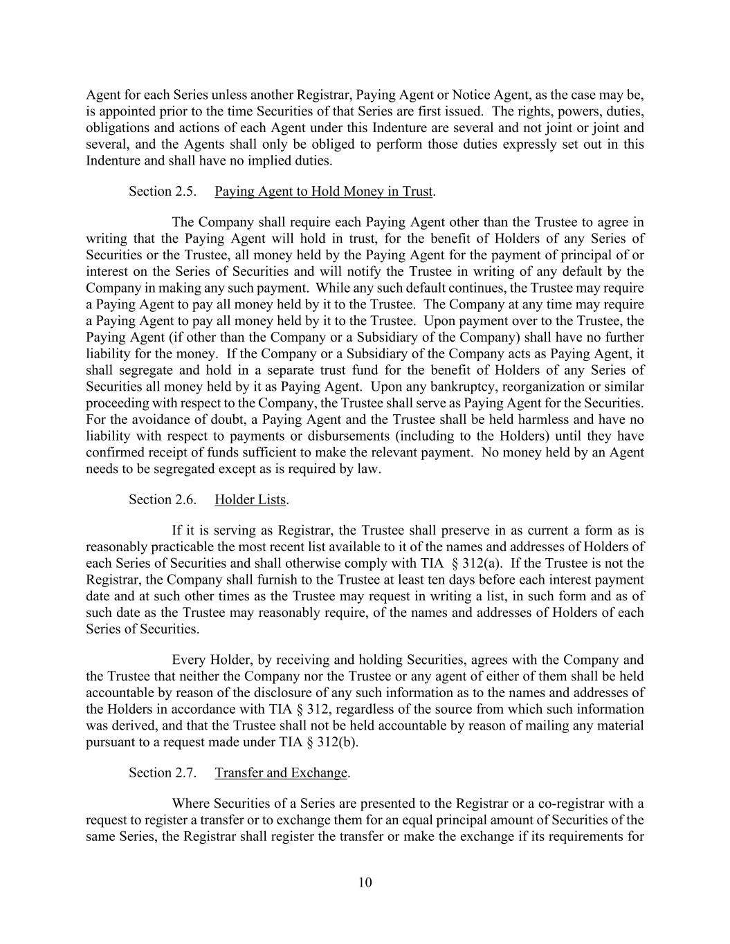 10 Agent for each Series unless another Registrar, Paying Agent or Notice Agent, as the case may be, is appointed prior to the time Securities of that Series are first issued. The rights, powers, duties, obligations and actions of each Agent under this Indenture are several and not joint or joint and several, and the Agents shall only be obliged to perform those duties expressly set out in this Indenture and shall have no implied duties. Section 2.5. Paying Agent to Hold Money in Trust. The Company shall require each Paying Agent other than the Trustee to agree in writing that the Paying Agent will hold in trust, for the benefit of Holders of any Series of Securities or the Trustee, all money held by the Paying Agent for the payment of principal of or interest on the Series of Securities and will notify the Trustee in writing of any default by the Company in making any such payment. While any such default continues, the Trustee may require a Paying Agent to pay all money held by it to the Trustee. The Company at any time may require a Paying Agent to pay all money held by it to the Trustee. Upon payment over to the Trustee, the Paying Agent (if other than the Company or a Subsidiary of the Company) shall have no further liability for the money. If the Company or a Subsidiary of the Company acts as Paying Agent, it shall segregate and hold in a separate trust fund for the benefit of Holders of any Series of Securities all money held by it as Paying Agent. Upon any bankruptcy, reorganization or similar proceeding with respect to the Company, the Trustee shall serve as Paying Agent for the Securities. For the avoidance of doubt, a Paying Agent and the Trustee shall be held harmless and have no liability with respect to payments or disbursements (including to the Holders) until they have confirmed receipt of funds sufficient to make the relevant payment. No money held by an Agent needs to be segregated except as is required by law. Section 2.6. Holder Lists. If it is serving as Registrar, the Trustee shall preserve in as current a form as is reasonably practicable the most recent list available to it of the names and addresses of Holders of each Series of Securities and shall otherwise comply with TIA § 312(a). If the Trustee is not the Registrar, the Company shall furnish to the Trustee at least ten days before each interest payment date and at such other times as the Trustee may request in writing a list, in such form and as of such date as the Trustee may reasonably require, of the names and addresses of Holders of each Series of Securities. Every Holder, by receiving and holding Securities, agrees with the Company and the Trustee that neither the Company nor the Trustee or any agent of either of them shall be held accountable by reason of the disclosure of any such information as to the names and addresses of the Holders in accordance with TIA § 312, regardless of the source from which such information was derived, and that the Trustee shall not be held accountable by reason of mailing any material pursuant to a request made under TIA § 312(b). Section 2.7. Transfer and Exchange. Where Securities of a Series are presented to the Registrar or a co-registrar with a request to register a transfer or to exchange them for an equal principal amount of Securities of the same Series, the Registrar shall register the transfer or make the exchange if its requirements for