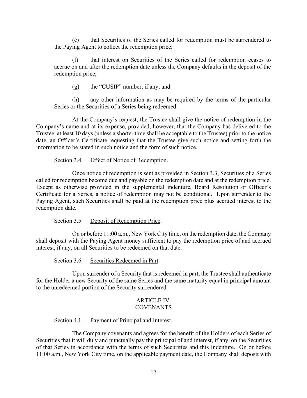 17 (e) that Securities of the Series called for redemption must be surrendered to the Paying Agent to collect the redemption price; (f) that interest on Securities of the Series called for redemption ceases to accrue on and after the redemption date unless the Company defaults in the deposit of the redemption price; (g) the “CUSIP” number, if any; and (h) any other information as may be required by the terms of the particular Series or the Securities of a Series being redeemed. At the Company’s request, the Trustee shall give the notice of redemption in the Company’s name and at its expense, provided, however, that the Company has delivered to the Trustee, at least 10 days (unless a shorter time shall be acceptable to the Trustee) prior to the notice date, an Officer’s Certificate requesting that the Trustee give such notice and setting forth the information to be stated in such notice and the form of such notice. Section 3.4. Effect of Notice of Redemption. Once notice of redemption is sent as provided in Section 3.3, Securities of a Series called for redemption become due and payable on the redemption date and at the redemption price. Except as otherwise provided in the supplemental indenture, Board Resolution or Officer’s Certificate for a Series, a notice of redemption may not be conditional. Upon surrender to the Paying Agent, such Securities shall be paid at the redemption price plus accrued interest to the redemption date. Section 3.5. Deposit of Redemption Price. On or before 11:00 a.m., New York City time, on the redemption date, the Company shall deposit with the Paying Agent money sufficient to pay the redemption price of and accrued interest, if any, on all Securities to be redeemed on that date. Section 3.6. Securities Redeemed in Part. Upon surrender of a Security that is redeemed in part, the Trustee shall authenticate for the Holder a new Security of the same Series and the same maturity equal in principal amount to the unredeemed portion of the Security surrendered. ARTICLE IV. COVENANTS Section 4.1. Payment of Principal and Interest. The Company covenants and agrees for the benefit of the Holders of each Series of Securities that it will duly and punctually pay the principal of and interest, if any, on the Securities of that Series in accordance with the terms of such Securities and this Indenture. On or before 11:00 a.m., New York City time, on the applicable payment date, the Company shall deposit with