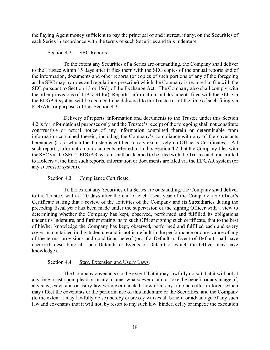 18 the Paying Agent money sufficient to pay the principal of and interest, if any, on the Securities of each Series in accordance with the terms of such Securities and this Indenture. Section 4.2. SEC Reports. To the extent any Securities of a Series are outstanding, the Company shall deliver to the Trustee within 15 days after it files them with the SEC copies of the annual reports and of the information, documents and other reports (or copies of such portions of any of the foregoing as the SEC may by rules and regulations prescribe) which the Company is required to file with the SEC pursuant to Section 13 or 15(d) of the Exchange Act. The Company also shall comply with the other provisions of TIA § 314(a). Reports, information and documents filed with the SEC via the EDGAR system will be deemed to be delivered to the Trustee as of the time of such filing via EDGAR for purposes of this Section 4.2. Delivery of reports, information and documents to the Trustee under this Section 4.2 is for informational purposes only and the Trustee’s receipt of the foregoing shall not constitute constructive or actual notice of any information contained therein or determinable from information contained therein, including the Company’s compliance with any of the covenants hereunder (as to which the Trustee is entitled to rely exclusively on Officer’s Certificates). All such reports, information or documents referred to in this Section 4.2 that the Company files with the SEC via the SEC’s EDGAR system shall be deemed to be filed with the Trustee and transmitted to Holders at the time such reports, information or documents are filed via the EDGAR system (or any successor system). Section 4.3. Compliance Certificate. To the extent any Securities of a Series are outstanding, the Company shall deliver to the Trustee, within 120 days after the end of each fiscal year of the Company, an Officer’s Certificate stating that a review of the activities of the Company and its Subsidiaries during the preceding fiscal year has been made under the supervision of the signing Officer with a view to determining whether the Company has kept, observed, performed and fulfilled its obligations under this Indenture, and further stating, as to such Officer signing such certificate, that to the best of his/her knowledge the Company has kept, observed, performed and fulfilled each and every covenant contained in this Indenture and is not in default in the performance or observance of any of the terms, provisions and conditions hereof (or, if a Default or Event of Default shall have occurred, describing all such Defaults or Events of Default of which the Officer may have knowledge). Section 4.4. Stay, Extension and Usury Laws. The Company covenants (to the extent that it may lawfully do so) that it will not at any time insist upon, plead or in any manner whatsoever claim or take the benefit or advantage of, any stay, extension or usury law wherever enacted, now or at any time hereafter in force, which may affect the covenants or the performance of this Indenture or the Securities; and the Company (to the extent it may lawfully do so) hereby expressly waives all benefit or advantage of any such law and covenants that it will not, by resort to any such law, hinder, delay or impede the execution