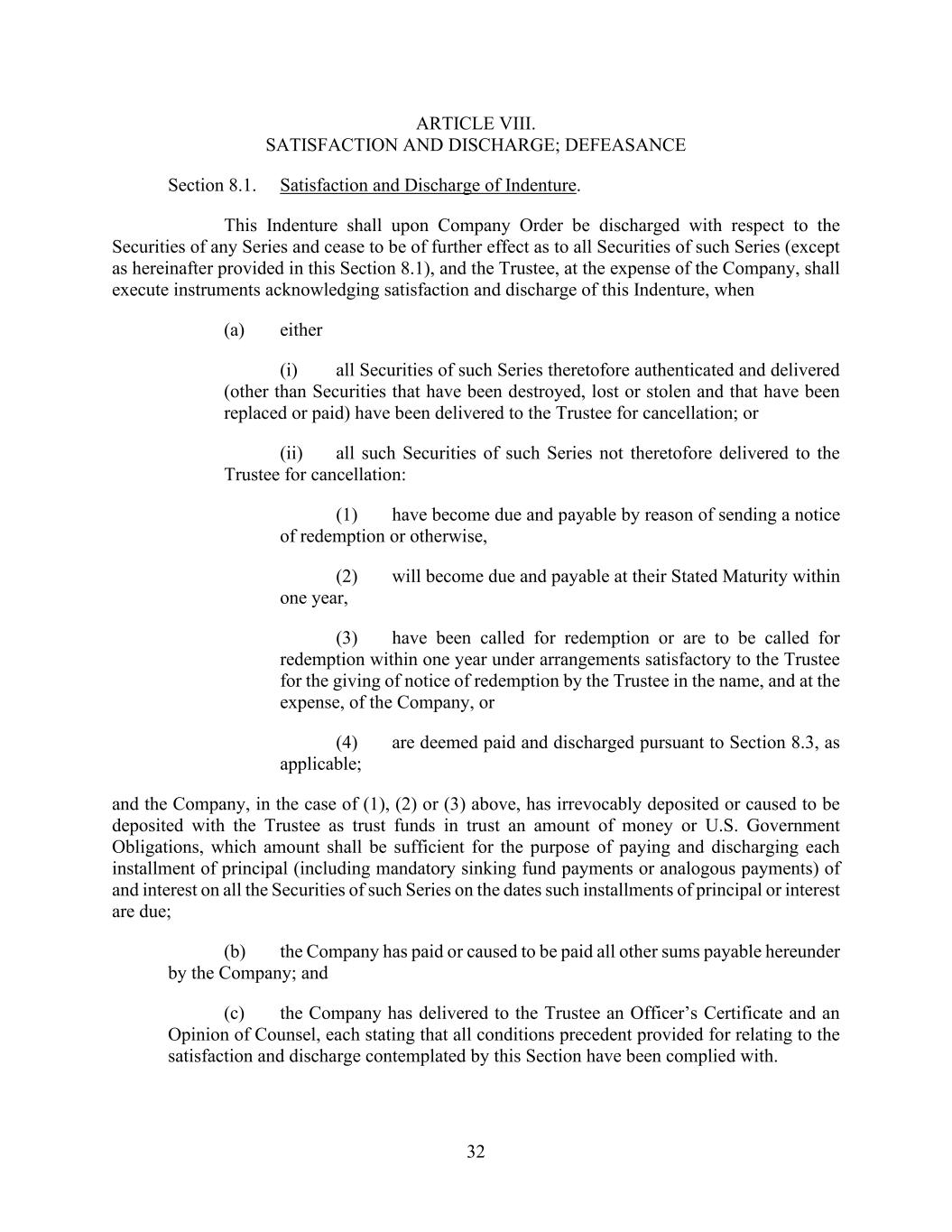 32 ARTICLE VIII. SATISFACTION AND DISCHARGE; DEFEASANCE Section 8.1. Satisfaction and Discharge of Indenture. This Indenture shall upon Company Order be discharged with respect to the Securities of any Series and cease to be of further effect as to all Securities of such Series (except as hereinafter provided in this Section 8.1), and the Trustee, at the expense of the Company, shall execute instruments acknowledging satisfaction and discharge of this Indenture, when (a) either (i) all Securities of such Series theretofore authenticated and delivered (other than Securities that have been destroyed, lost or stolen and that have been replaced or paid) have been delivered to the Trustee for cancellation; or (ii) all such Securities of such Series not theretofore delivered to the Trustee for cancellation: (1) have become due and payable by reason of sending a notice of redemption or otherwise, (2) will become due and payable at their Stated Maturity within one year, (3) have been called for redemption or are to be called for redemption within one year under arrangements satisfactory to the Trustee for the giving of notice of redemption by the Trustee in the name, and at the expense, of the Company, or (4) are deemed paid and discharged pursuant to Section 8.3, as applicable; and the Company, in the case of (1), (2) or (3) above, has irrevocably deposited or caused to be deposited with the Trustee as trust funds in trust an amount of money or U.S. Government Obligations, which amount shall be sufficient for the purpose of paying and discharging each installment of principal (including mandatory sinking fund payments or analogous payments) of and interest on all the Securities of such Series on the dates such installments of principal or interest are due; (b) the Company has paid or caused to be paid all other sums payable hereunder by the Company; and (c) the Company has delivered to the Trustee an Officer’s Certificate and an Opinion of Counsel, each stating that all conditions precedent provided for relating to the satisfaction and discharge contemplated by this Section have been complied with.
