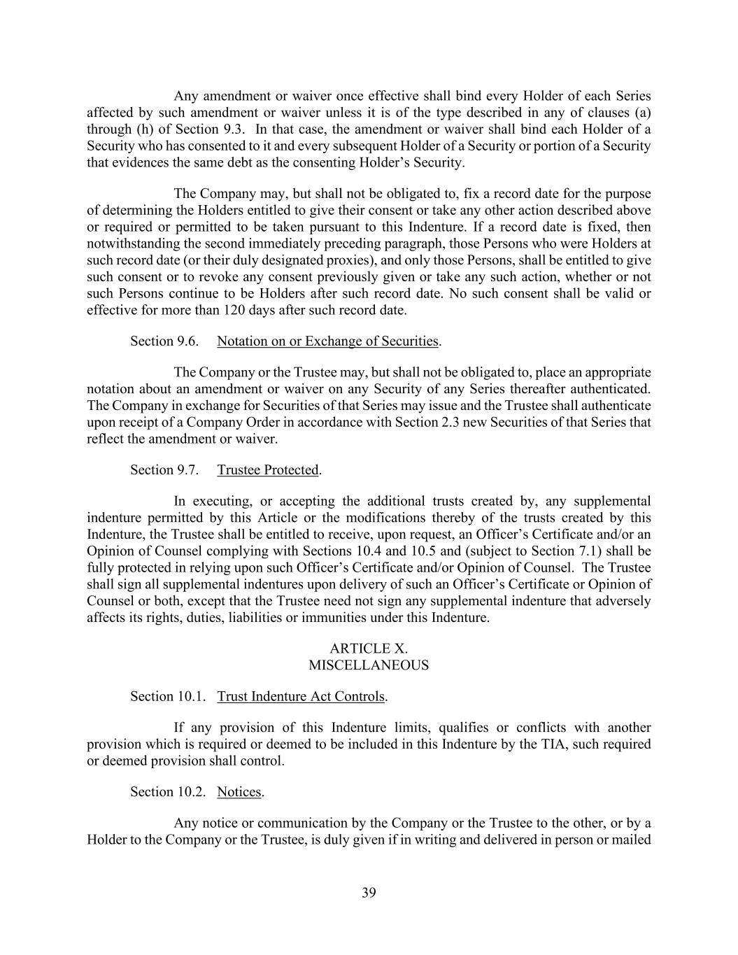 39 Any amendment or waiver once effective shall bind every Holder of each Series affected by such amendment or waiver unless it is of the type described in any of clauses (a) through (h) of Section 9.3. In that case, the amendment or waiver shall bind each Holder of a Security who has consented to it and every subsequent Holder of a Security or portion of a Security that evidences the same debt as the consenting Holder’s Security. The Company may, but shall not be obligated to, fix a record date for the purpose of determining the Holders entitled to give their consent or take any other action described above or required or permitted to be taken pursuant to this Indenture. If a record date is fixed, then notwithstanding the second immediately preceding paragraph, those Persons who were Holders at such record date (or their duly designated proxies), and only those Persons, shall be entitled to give such consent or to revoke any consent previously given or take any such action, whether or not such Persons continue to be Holders after such record date. No such consent shall be valid or effective for more than 120 days after such record date. Section 9.6. Notation on or Exchange of Securities. The Company or the Trustee may, but shall not be obligated to, place an appropriate notation about an amendment or waiver on any Security of any Series thereafter authenticated. The Company in exchange for Securities of that Series may issue and the Trustee shall authenticate upon receipt of a Company Order in accordance with Section 2.3 new Securities of that Series that reflect the amendment or waiver. Section 9.7. Trustee Protected. In executing, or accepting the additional trusts created by, any supplemental indenture permitted by this Article or the modifications thereby of the trusts created by this Indenture, the Trustee shall be entitled to receive, upon request, an Officer’s Certificate and/or an Opinion of Counsel complying with Sections 10.4 and 10.5 and (subject to Section 7.1) shall be fully protected in relying upon such Officer’s Certificate and/or Opinion of Counsel. The Trustee shall sign all supplemental indentures upon delivery of such an Officer’s Certificate or Opinion of Counsel or both, except that the Trustee need not sign any supplemental indenture that adversely affects its rights, duties, liabilities or immunities under this Indenture. ARTICLE X. MISCELLANEOUS Section 10.1. Trust Indenture Act Controls. If any provision of this Indenture limits, qualifies or conflicts with another provision which is required or deemed to be included in this Indenture by the TIA, such required or deemed provision shall control. Section 10.2. Notices. Any notice or communication by the Company or the Trustee to the other, or by a Holder to the Company or the Trustee, is duly given if in writing and delivered in person or mailed