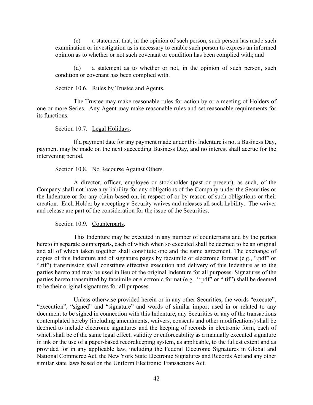 42 (c) a statement that, in the opinion of such person, such person has made such examination or investigation as is necessary to enable such person to express an informed opinion as to whether or not such covenant or condition has been complied with; and (d) a statement as to whether or not, in the opinion of such person, such condition or covenant has been complied with. Section 10.6. Rules by Trustee and Agents. The Trustee may make reasonable rules for action by or a meeting of Holders of one or more Series. Any Agent may make reasonable rules and set reasonable requirements for its functions. Section 10.7. Legal Holidays. If a payment date for any payment made under this Indenture is not a Business Day, payment may be made on the next succeeding Business Day, and no interest shall accrue for the intervening period. Section 10.8. No Recourse Against Others. A director, officer, employee or stockholder (past or present), as such, of the Company shall not have any liability for any obligations of the Company under the Securities or the Indenture or for any claim based on, in respect of or by reason of such obligations or their creation. Each Holder by accepting a Security waives and releases all such liability. The waiver and release are part of the consideration for the issue of the Securities. Section 10.9. Counterparts. This Indenture may be executed in any number of counterparts and by the parties hereto in separate counterparts, each of which when so executed shall be deemed to be an original and all of which taken together shall constitute one and the same agreement. The exchange of copies of this Indenture and of signature pages by facsimile or electronic format (e.g., “.pdf” or “.tif”) transmission shall constitute effective execution and delivery of this Indenture as to the parties hereto and may be used in lieu of the original Indenture for all purposes. Signatures of the parties hereto transmitted by facsimile or electronic format (e.g., “.pdf” or “.tif”) shall be deemed to be their original signatures for all purposes. Unless otherwise provided herein or in any other Securities, the words “execute”, “execution”, “signed” and “signature” and words of similar import used in or related to any document to be signed in connection with this Indenture, any Securities or any of the transactions contemplated hereby (including amendments, waivers, consents and other modifications) shall be deemed to include electronic signatures and the keeping of records in electronic form, each of which shall be of the same legal effect, validity or enforceability as a manually executed signature in ink or the use of a paper-based recordkeeping system, as applicable, to the fullest extent and as provided for in any applicable law, including the Federal Electronic Signatures in Global and National Commerce Act, the New York State Electronic Signatures and Records Act and any other similar state laws based on the Uniform Electronic Transactions Act.