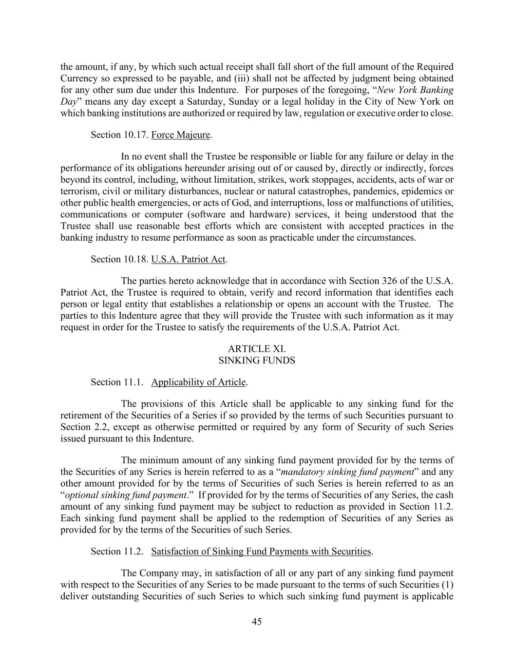 45 the amount, if any, by which such actual receipt shall fall short of the full amount of the Required Currency so expressed to be payable, and (iii) shall not be affected by judgment being obtained for any other sum due under this Indenture. For purposes of the foregoing, “New York Banking Day” means any day except a Saturday, Sunday or a legal holiday in the City of New York on which banking institutions are authorized or required by law, regulation or executive order to close. Section 10.17. Force Majeure. In no event shall the Trustee be responsible or liable for any failure or delay in the performance of its obligations hereunder arising out of or caused by, directly or indirectly, forces beyond its control, including, without limitation, strikes, work stoppages, accidents, acts of war or terrorism, civil or military disturbances, nuclear or natural catastrophes, pandemics, epidemics or other public health emergencies, or acts of God, and interruptions, loss or malfunctions of utilities, communications or computer (software and hardware) services, it being understood that the Trustee shall use reasonable best efforts which are consistent with accepted practices in the banking industry to resume performance as soon as practicable under the circumstances. Section 10.18. U.S.A. Patriot Act. The parties hereto acknowledge that in accordance with Section 326 of the U.S.A. Patriot Act, the Trustee is required to obtain, verify and record information that identifies each person or legal entity that establishes a relationship or opens an account with the Trustee. The parties to this Indenture agree that they will provide the Trustee with such information as it may request in order for the Trustee to satisfy the requirements of the U.S.A. Patriot Act. ARTICLE XI. SINKING FUNDS Section 11.1. Applicability of Article. The provisions of this Article shall be applicable to any sinking fund for the retirement of the Securities of a Series if so provided by the terms of such Securities pursuant to Section 2.2, except as otherwise permitted or required by any form of Security of such Series issued pursuant to this Indenture. The minimum amount of any sinking fund payment provided for by the terms of the Securities of any Series is herein referred to as a “mandatory sinking fund payment” and any other amount provided for by the terms of Securities of such Series is herein referred to as an “optional sinking fund payment.” If provided for by the terms of Securities of any Series, the cash amount of any sinking fund payment may be subject to reduction as provided in Section 11.2. Each sinking fund payment shall be applied to the redemption of Securities of any Series as provided for by the terms of the Securities of such Series. Section 11.2. Satisfaction of Sinking Fund Payments with Securities. The Company may, in satisfaction of all or any part of any sinking fund payment with respect to the Securities of any Series to be made pursuant to the terms of such Securities (1) deliver outstanding Securities of such Series to which such sinking fund payment is applicable