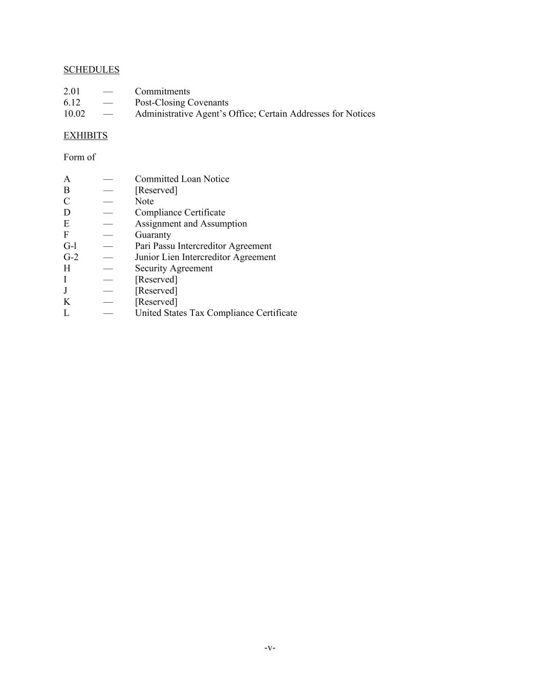 -v- SCHEDULES 2.01 — Commitments 6.12 — Post-Closing Covenants 10.02 — Administrative Agent’s Office; Certain Addresses for Notices EXHIBITS Form of A — Committed Loan Notice B — [Reserved] C — Note D — Compliance Certificate E — Assignment and Assumption F — Guaranty G-l — Pari Passu Intercreditor Agreement G-2 — Junior Lien Intercreditor Agreement H — Security Agreement I — [Reserved] J — [Reserved] K — [Reserved] L — United States Tax Compliance Certificate