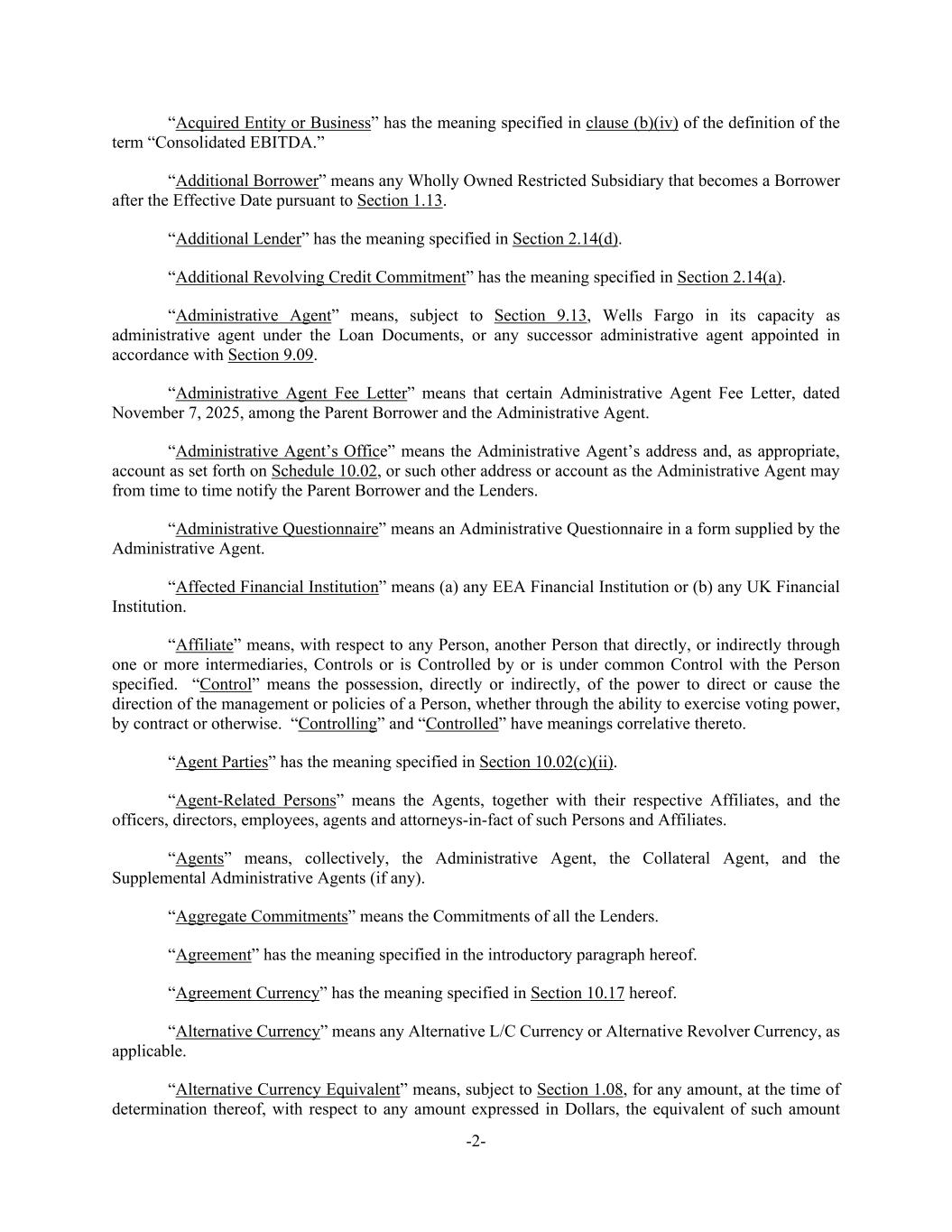 -2- “Acquired Entity or Business” has the meaning specified in clause (b)(iv) of the definition of the term “Consolidated EBITDA.” “Additional Borrower” means any Wholly Owned Restricted Subsidiary that becomes a Borrower after the Effective Date pursuant to Section 1.13. “Additional Lender” has the meaning specified in Section 2.14(d). “Additional Revolving Credit Commitment” has the meaning specified in Section 2.14(a). “Administrative Agent” means, subject to Section 9.13, Wells Fargo in its capacity as administrative agent under the Loan Documents, or any successor administrative agent appointed in accordance with Section 9.09. “Administrative Agent Fee Letter” means that certain Administrative Agent Fee Letter, dated November 7, 2025, among the Parent Borrower and the Administrative Agent. “Administrative Agent’s Office” means the Administrative Agent’s address and, as appropriate, account as set forth on Schedule 10.02, or such other address or account as the Administrative Agent may from time to time notify the Parent Borrower and the Lenders. “Administrative Questionnaire” means an Administrative Questionnaire in a form supplied by the Administrative Agent. “Affected Financial Institution” means (a) any EEA Financial Institution or (b) any UK Financial Institution. “Affiliate” means, with respect to any Person, another Person that directly, or indirectly through one or more intermediaries, Controls or is Controlled by or is under common Control with the Person specified. “Control” means the possession, directly or indirectly, of the power to direct or cause the direction of the management or policies of a Person, whether through the ability to exercise voting power, by contract or otherwise. “Controlling” and “Controlled” have meanings correlative thereto. “Agent Parties” has the meaning specified in Section 10.02(c)(ii). “Agent-Related Persons” means the Agents, together with their respective Affiliates, and the officers, directors, employees, agents and attorneys-in-fact of such Persons and Affiliates. “Agents” means, collectively, the Administrative Agent, the Collateral Agent, and the Supplemental Administrative Agents (if any). “Aggregate Commitments” means the Commitments of all the Lenders. “Agreement” has the meaning specified in the introductory paragraph hereof. “Agreement Currency” has the meaning specified in Section 10.17 hereof. “Alternative Currency” means any Alternative L/C Currency or Alternative Revolver Currency, as applicable. “Alternative Currency Equivalent” means, subject to Section 1.08, for any amount, at the time of determination thereof, with respect to any amount expressed in Dollars, the equivalent of such amount