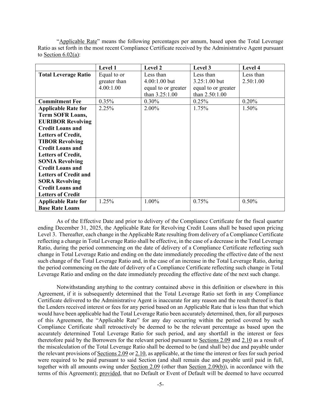 -5- “Applicable Rate” means the following percentages per annum, based upon the Total Leverage Ratio as set forth in the most recent Compliance Certificate received by the Administrative Agent pursuant to Section 6.02(a): Level 1 Level 2 Level 3 Level 4 Total Leverage Ratio Equal to or greater than 4.00:1.00 Less than 4.00:1.00 but equal to or greater than 3.25:1.00 Less than 3.25:1.00 but equal to or greater than 2.50:1.00 Less than 2.50:1.00 Commitment Fee 0.35% 0.30% 0.25% 0.20% Applicable Rate for Term SOFR Loans, EURIBOR Revolving Credit Loans and Letters of Credit, TIBOR Revolving Credit Loans and Letters of Credit, SONIA Revolving Credit Loans and Letters of Credit and SORA Revolving Credit Loans and Letters of Credit 2.25% 2.00% 1.75% 1.50% Applicable Rate for Base Rate Loans 1.25% 1.00% 0.75% 0.50% As of the Effective Date and prior to delivery of the Compliance Certificate for the fiscal quarter ending December 31, 2025, the Applicable Rate for Revolving Credit Loans shall be based upon pricing Level 3. Thereafter, each change in the Applicable Rate resulting from delivery of a Compliance Certificate reflecting a change in Total Leverage Ratio shall be effective, in the case of a decrease in the Total Leverage Ratio, during the period commencing on the date of delivery of a Compliance Certificate reflecting such change in Total Leverage Ratio and ending on the date immediately preceding the effective date of the next such change of the Total Leverage Ratio and, in the case of an increase in the Total Leverage Ratio, during the period commencing on the date of delivery of a Compliance Certificate reflecting such change in Total Leverage Ratio and ending on the date immediately preceding the effective date of the next such change. Notwithstanding anything to the contrary contained above in this definition or elsewhere in this Agreement, if it is subsequently determined that the Total Leverage Ratio set forth in any Compliance Certificate delivered to the Administrative Agent is inaccurate for any reason and the result thereof is that the Lenders received interest or fees for any period based on an Applicable Rate that is less than that which would have been applicable had the Total Leverage Ratio been accurately determined, then, for all purposes of this Agreement, the “Applicable Rate” for any day occurring within the period covered by such Compliance Certificate shall retroactively be deemed to be the relevant percentage as based upon the accurately determined Total Leverage Ratio for such period, and any shortfall in the interest or fees theretofore paid by the Borrowers for the relevant period pursuant to Sections 2.09 and 2.10 as a result of the miscalculation of the Total Leverage Ratio shall be deemed to be (and shall be) due and payable under the relevant provisions of Sections 2.09 or 2.10, as applicable, at the time the interest or fees for such period were required to be paid pursuant to said Section (and shall remain due and payable until paid in full, together with all amounts owing under Section 2.09 (other than Section 2.09(b)), in accordance with the terms of this Agreement); provided, that no Default or Event of Default will be deemed to have occurred