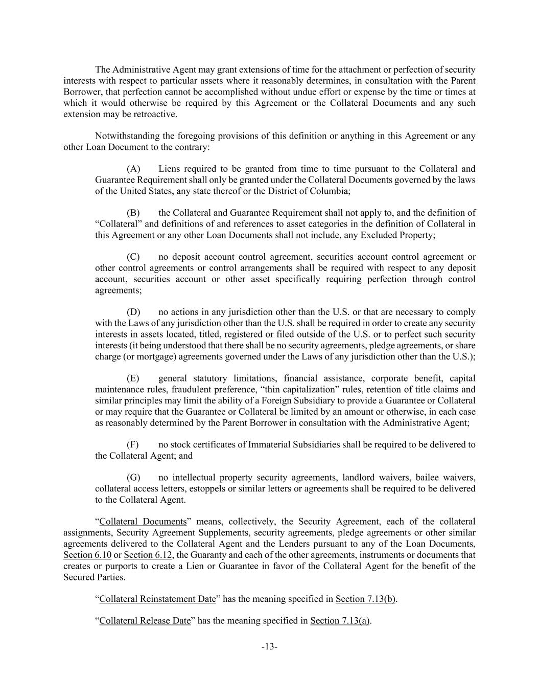 -13- The Administrative Agent may grant extensions of time for the attachment or perfection of security interests with respect to particular assets where it reasonably determines, in consultation with the Parent Borrower, that perfection cannot be accomplished without undue effort or expense by the time or times at which it would otherwise be required by this Agreement or the Collateral Documents and any such extension may be retroactive. Notwithstanding the foregoing provisions of this definition or anything in this Agreement or any other Loan Document to the contrary: (A) Liens required to be granted from time to time pursuant to the Collateral and Guarantee Requirement shall only be granted under the Collateral Documents governed by the laws of the United States, any state thereof or the District of Columbia; (B) the Collateral and Guarantee Requirement shall not apply to, and the definition of “Collateral” and definitions of and references to asset categories in the definition of Collateral in this Agreement or any other Loan Documents shall not include, any Excluded Property; (C) no deposit account control agreement, securities account control agreement or other control agreements or control arrangements shall be required with respect to any deposit account, securities account or other asset specifically requiring perfection through control agreements; (D) no actions in any jurisdiction other than the U.S. or that are necessary to comply with the Laws of any jurisdiction other than the U.S. shall be required in order to create any security interests in assets located, titled, registered or filed outside of the U.S. or to perfect such security interests (it being understood that there shall be no security agreements, pledge agreements, or share charge (or mortgage) agreements governed under the Laws of any jurisdiction other than the U.S.); (E) general statutory limitations, financial assistance, corporate benefit, capital maintenance rules, fraudulent preference, “thin capitalization” rules, retention of title claims and similar principles may limit the ability of a Foreign Subsidiary to provide a Guarantee or Collateral or may require that the Guarantee or Collateral be limited by an amount or otherwise, in each case as reasonably determined by the Parent Borrower in consultation with the Administrative Agent; (F) no stock certificates of Immaterial Subsidiaries shall be required to be delivered to the Collateral Agent; and (G) no intellectual property security agreements, landlord waivers, bailee waivers, collateral access letters, estoppels or similar letters or agreements shall be required to be delivered to the Collateral Agent. “Collateral Documents” means, collectively, the Security Agreement, each of the collateral assignments, Security Agreement Supplements, security agreements, pledge agreements or other similar agreements delivered to the Collateral Agent and the Lenders pursuant to any of the Loan Documents, Section 6.10 or Section 6.12, the Guaranty and each of the other agreements, instruments or documents that creates or purports to create a Lien or Guarantee in favor of the Collateral Agent for the benefit of the Secured Parties. “Collateral Reinstatement Date” has the meaning specified in Section 7.13(b). “Collateral Release Date” has the meaning specified in Section 7.13(a).