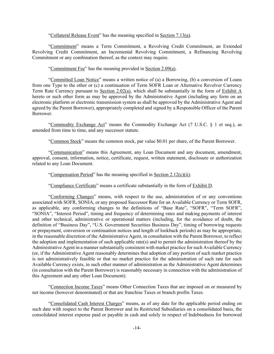 -14- “Collateral Release Event” has the meaning specified in Section 7.13(a). “Commitment” means a Term Commitment, a Revolving Credit Commitment, an Extended Revolving Credit Commitment, an Incremental Revolving Commitment, a Refinancing Revolving Commitment or any combination thereof, as the context may require. “Commitment Fee” has the meaning provided in Section 2.09(a). “Committed Loan Notice” means a written notice of (a) a Borrowing, (b) a conversion of Loans from one Type to the other or (c) a continuation of Term SOFR Loan or Alternative Revolver Currency Term Rate Currency pursuant to Section 2.02(a), which shall be substantially in the form of Exhibit A hereto or such other form as may be approved by the Administrative Agent (including any form on an electronic platform or electronic transmission system as shall be approved by the Administrative Agent and agreed by the Parent Borrower), appropriately completed and signed by a Responsible Officer of the Parent Borrower. “Commodity Exchange Act” means the Commodity Exchange Act (7 U.S.C. § 1 et seq.), as amended from time to time, and any successor statute. “Common Stock” means the common stock, par value $0.01 per share, of the Parent Borrower. “Communication” means this Agreement, any Loan Document and any document, amendment, approval, consent, information, notice, certificate, request, written statement, disclosure or authorization related to any Loan Document. “Compensation Period” has the meaning specified in Section 2.12(c)(ii). “Compliance Certificate” means a certificate substantially in the form of Exhibit D. “Conforming Changes” means, with respect to the use, administration of or any conventions associated with SOFR, SONIA, or any proposed Successor Rate for an Available Currency or Term SOFR, as applicable, any conforming changes to the definitions of “Base Rate”, “SOFR”, “Term SOFR”, “SONIA”, “Interest Period”, timing and frequency of determining rates and making payments of interest and other technical, administrative or operational matters (including, for the avoidance of doubt, the definition of “Business Day”, “U.S. Government Securities Business Day”, timing of borrowing requests or prepayment, conversion or continuation notices and length of lookback periods) as may be appropriate, in the reasonable discretion of the Administrative Agent, in consultation with the Parent Borrower, to reflect the adoption and implementation of such applicable rate(s) and to permit the administration thereof by the Administrative Agent in a manner substantially consistent with market practice for such Available Currency (or, if the Administrative Agent reasonably determines that adoption of any portion of such market practice is not administratively feasible or that no market practice for the administration of such rate for such Available Currency exists, in such other manner of administration as the Administrative Agent determines (in consultation with the Parent Borrower) is reasonably necessary in connection with the administration of this Agreement and any other Loan Document). “Connection Income Taxes” means Other Connection Taxes that are imposed on or measured by net income (however denominated) or that are franchise Taxes or branch profits Taxes. “Consolidated Cash Interest Charges” means, as of any date for the applicable period ending on such date with respect to the Parent Borrower and its Restricted Subsidiaries on a consolidated basis, the consolidated interest expense paid or payable in cash and solely in respect of Indebtedness for borrowed