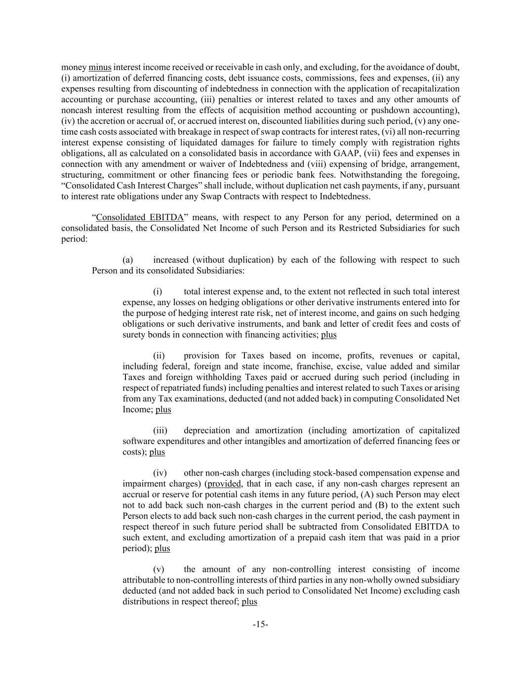 -15- money minus interest income received or receivable in cash only, and excluding, for the avoidance of doubt, (i) amortization of deferred financing costs, debt issuance costs, commissions, fees and expenses, (ii) any expenses resulting from discounting of indebtedness in connection with the application of recapitalization accounting or purchase accounting, (iii) penalties or interest related to taxes and any other amounts of noncash interest resulting from the effects of acquisition method accounting or pushdown accounting), (iv) the accretion or accrual of, or accrued interest on, discounted liabilities during such period, (v) any one- time cash costs associated with breakage in respect of swap contracts for interest rates, (vi) all non-recurring interest expense consisting of liquidated damages for failure to timely comply with registration rights obligations, all as calculated on a consolidated basis in accordance with GAAP, (vii) fees and expenses in connection with any amendment or waiver of Indebtedness and (viii) expensing of bridge, arrangement, structuring, commitment or other financing fees or periodic bank fees. Notwithstanding the foregoing, “Consolidated Cash Interest Charges” shall include, without duplication net cash payments, if any, pursuant to interest rate obligations under any Swap Contracts with respect to Indebtedness. “Consolidated EBITDA” means, with respect to any Person for any period, determined on a consolidated basis, the Consolidated Net Income of such Person and its Restricted Subsidiaries for such period: (a) increased (without duplication) by each of the following with respect to such Person and its consolidated Subsidiaries: (i) total interest expense and, to the extent not reflected in such total interest expense, any losses on hedging obligations or other derivative instruments entered into for the purpose of hedging interest rate risk, net of interest income, and gains on such hedging obligations or such derivative instruments, and bank and letter of credit fees and costs of surety bonds in connection with financing activities; plus (ii) provision for Taxes based on income, profits, revenues or capital, including federal, foreign and state income, franchise, excise, value added and similar Taxes and foreign withholding Taxes paid or accrued during such period (including in respect of repatriated funds) including penalties and interest related to such Taxes or arising from any Tax examinations, deducted (and not added back) in computing Consolidated Net Income; plus (iii) depreciation and amortization (including amortization of capitalized software expenditures and other intangibles and amortization of deferred financing fees or costs); plus (iv) other non-cash charges (including stock-based compensation expense and impairment charges) (provided, that in each case, if any non-cash charges represent an accrual or reserve for potential cash items in any future period, (A) such Person may elect not to add back such non-cash charges in the current period and (B) to the extent such Person elects to add back such non-cash charges in the current period, the cash payment in respect thereof in such future period shall be subtracted from Consolidated EBITDA to such extent, and excluding amortization of a prepaid cash item that was paid in a prior period); plus (v) the amount of any non-controlling interest consisting of income attributable to non-controlling interests of third parties in any non-wholly owned subsidiary deducted (and not added back in such period to Consolidated Net Income) excluding cash distributions in respect thereof; plus