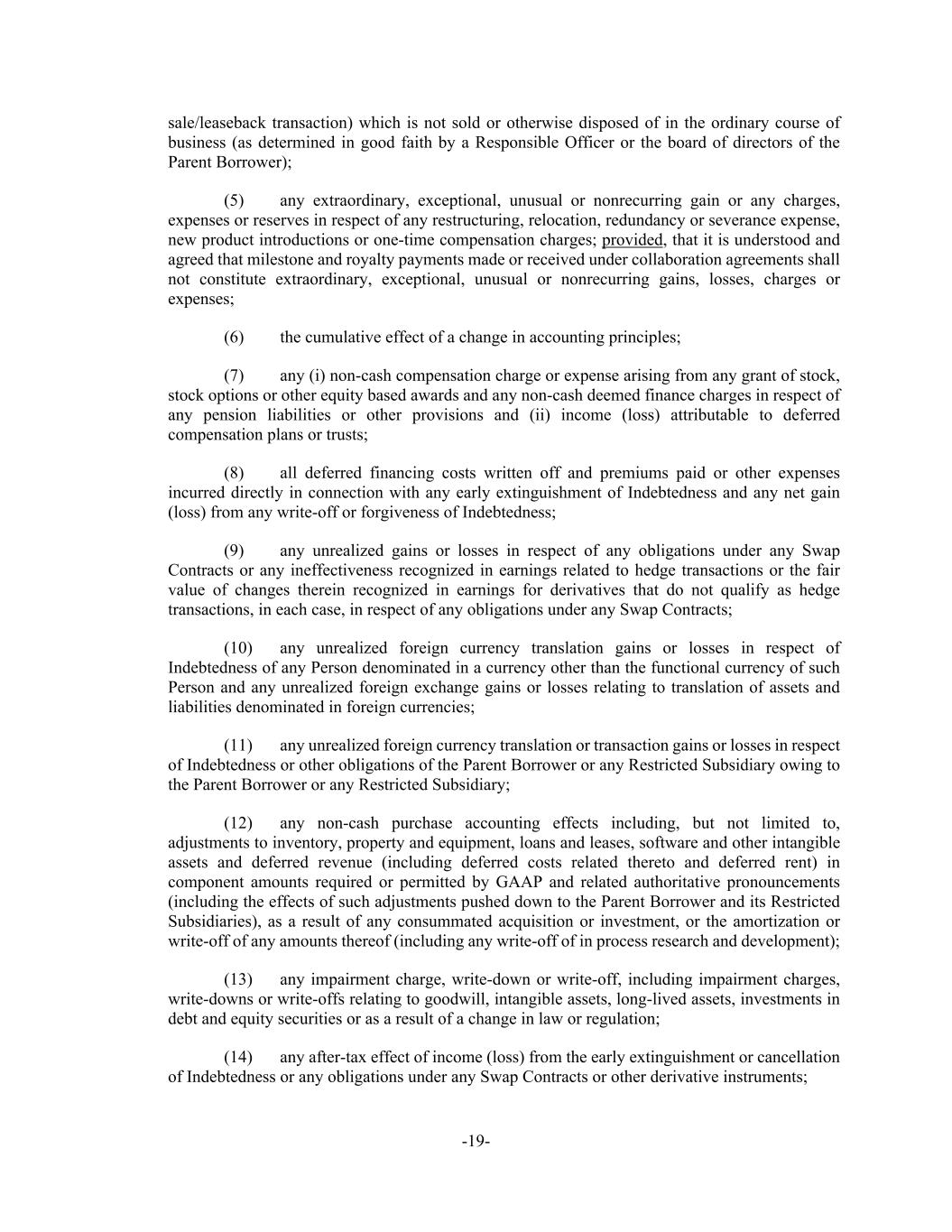 -19- sale/leaseback transaction) which is not sold or otherwise disposed of in the ordinary course of business (as determined in good faith by a Responsible Officer or the board of directors of the Parent Borrower); (5) any extraordinary, exceptional, unusual or nonrecurring gain or any charges, expenses or reserves in respect of any restructuring, relocation, redundancy or severance expense, new product introductions or one-time compensation charges; provided, that it is understood and agreed that milestone and royalty payments made or received under collaboration agreements shall not constitute extraordinary, exceptional, unusual or nonrecurring gains, losses, charges or expenses; (6) the cumulative effect of a change in accounting principles; (7) any (i) non-cash compensation charge or expense arising from any grant of stock, stock options or other equity based awards and any non-cash deemed finance charges in respect of any pension liabilities or other provisions and (ii) income (loss) attributable to deferred compensation plans or trusts; (8) all deferred financing costs written off and premiums paid or other expenses incurred directly in connection with any early extinguishment of Indebtedness and any net gain (loss) from any write-off or forgiveness of Indebtedness; (9) any unrealized gains or losses in respect of any obligations under any Swap Contracts or any ineffectiveness recognized in earnings related to hedge transactions or the fair value of changes therein recognized in earnings for derivatives that do not qualify as hedge transactions, in each case, in respect of any obligations under any Swap Contracts; (10) any unrealized foreign currency translation gains or losses in respect of Indebtedness of any Person denominated in a currency other than the functional currency of such Person and any unrealized foreign exchange gains or losses relating to translation of assets and liabilities denominated in foreign currencies; (11) any unrealized foreign currency translation or transaction gains or losses in respect of Indebtedness or other obligations of the Parent Borrower or any Restricted Subsidiary owing to the Parent Borrower or any Restricted Subsidiary; (12) any non-cash purchase accounting effects including, but not limited to, adjustments to inventory, property and equipment, loans and leases, software and other intangible assets and deferred revenue (including deferred costs related thereto and deferred rent) in component amounts required or permitted by GAAP and related authoritative pronouncements (including the effects of such adjustments pushed down to the Parent Borrower and its Restricted Subsidiaries), as a result of any consummated acquisition or investment, or the amortization or write-off of any amounts thereof (including any write-off of in process research and development); (13) any impairment charge, write-down or write-off, including impairment charges, write-downs or write-offs relating to goodwill, intangible assets, long-lived assets, investments in debt and equity securities or as a result of a change in law or regulation; (14) any after-tax effect of income (loss) from the early extinguishment or cancellation of Indebtedness or any obligations under any Swap Contracts or other derivative instruments;