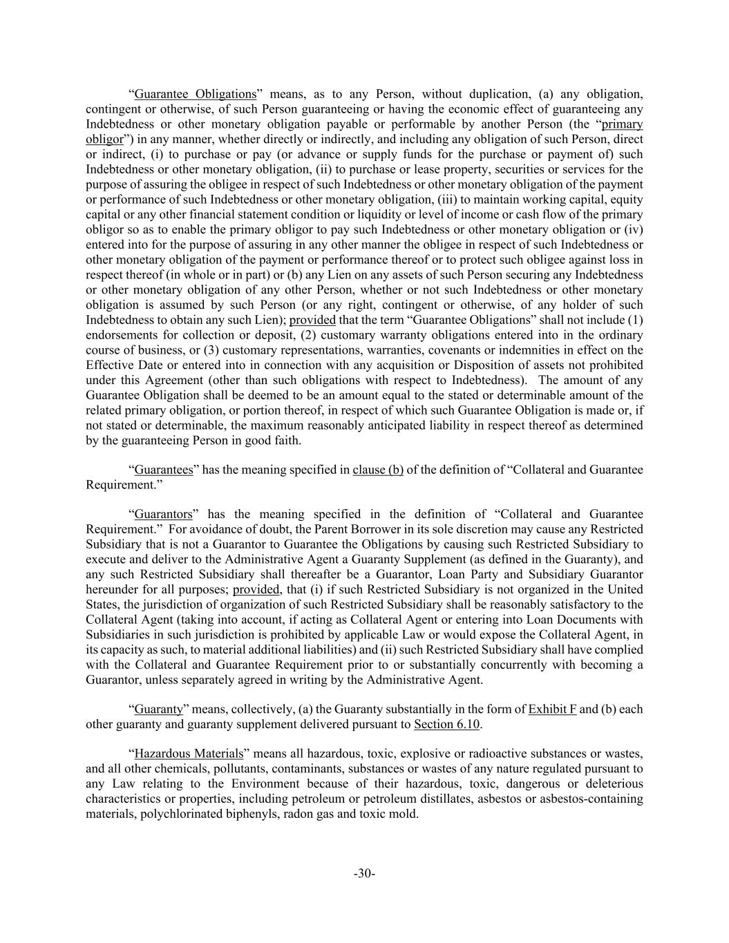 -30- “Guarantee Obligations” means, as to any Person, without duplication, (a) any obligation, contingent or otherwise, of such Person guaranteeing or having the economic effect of guaranteeing any Indebtedness or other monetary obligation payable or performable by another Person (the “primary obligor”) in any manner, whether directly or indirectly, and including any obligation of such Person, direct or indirect, (i) to purchase or pay (or advance or supply funds for the purchase or payment of) such Indebtedness or other monetary obligation, (ii) to purchase or lease property, securities or services for the purpose of assuring the obligee in respect of such Indebtedness or other monetary obligation of the payment or performance of such Indebtedness or other monetary obligation, (iii) to maintain working capital, equity capital or any other financial statement condition or liquidity or level of income or cash flow of the primary obligor so as to enable the primary obligor to pay such Indebtedness or other monetary obligation or (iv) entered into for the purpose of assuring in any other manner the obligee in respect of such Indebtedness or other monetary obligation of the payment or performance thereof or to protect such obligee against loss in respect thereof (in whole or in part) or (b) any Lien on any assets of such Person securing any Indebtedness or other monetary obligation of any other Person, whether or not such Indebtedness or other monetary obligation is assumed by such Person (or any right, contingent or otherwise, of any holder of such Indebtedness to obtain any such Lien); provided that the term “Guarantee Obligations” shall not include (1) endorsements for collection or deposit, (2) customary warranty obligations entered into in the ordinary course of business, or (3) customary representations, warranties, covenants or indemnities in effect on the Effective Date or entered into in connection with any acquisition or Disposition of assets not prohibited under this Agreement (other than such obligations with respect to Indebtedness). The amount of any Guarantee Obligation shall be deemed to be an amount equal to the stated or determinable amount of the related primary obligation, or portion thereof, in respect of which such Guarantee Obligation is made or, if not stated or determinable, the maximum reasonably anticipated liability in respect thereof as determined by the guaranteeing Person in good faith. “Guarantees” has the meaning specified in clause (b) of the definition of “Collateral and Guarantee Requirement.” “Guarantors” has the meaning specified in the definition of “Collateral and Guarantee Requirement.” For avoidance of doubt, the Parent Borrower in its sole discretion may cause any Restricted Subsidiary that is not a Guarantor to Guarantee the Obligations by causing such Restricted Subsidiary to execute and deliver to the Administrative Agent a Guaranty Supplement (as defined in the Guaranty), and any such Restricted Subsidiary shall thereafter be a Guarantor, Loan Party and Subsidiary Guarantor hereunder for all purposes; provided, that (i) if such Restricted Subsidiary is not organized in the United States, the jurisdiction of organization of such Restricted Subsidiary shall be reasonably satisfactory to the Collateral Agent (taking into account, if acting as Collateral Agent or entering into Loan Documents with Subsidiaries in such jurisdiction is prohibited by applicable Law or would expose the Collateral Agent, in its capacity as such, to material additional liabilities) and (ii) such Restricted Subsidiary shall have complied with the Collateral and Guarantee Requirement prior to or substantially concurrently with becoming a Guarantor, unless separately agreed in writing by the Administrative Agent. “Guaranty” means, collectively, (a) the Guaranty substantially in the form of Exhibit F and (b) each other guaranty and guaranty supplement delivered pursuant to Section 6.10. “Hazardous Materials” means all hazardous, toxic, explosive or radioactive substances or wastes, and all other chemicals, pollutants, contaminants, substances or wastes of any nature regulated pursuant to any Law relating to the Environment because of their hazardous, toxic, dangerous or deleterious characteristics or properties, including petroleum or petroleum distillates, asbestos or asbestos-containing materials, polychlorinated biphenyls, radon gas and toxic mold.