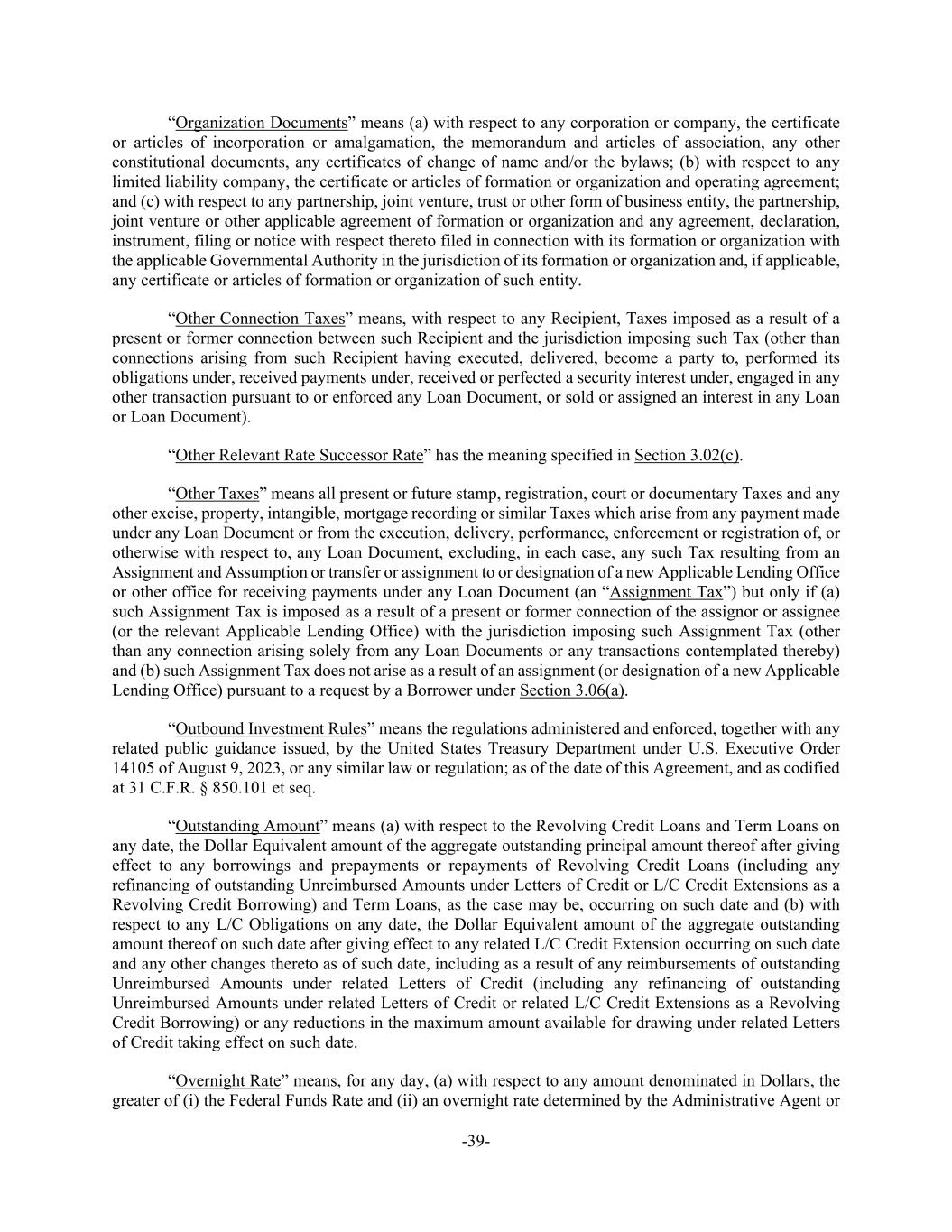 -39- “Organization Documents” means (a) with respect to any corporation or company, the certificate or articles of incorporation or amalgamation, the memorandum and articles of association, any other constitutional documents, any certificates of change of name and/or the bylaws; (b) with respect to any limited liability company, the certificate or articles of formation or organization and operating agreement; and (c) with respect to any partnership, joint venture, trust or other form of business entity, the partnership, joint venture or other applicable agreement of formation or organization and any agreement, declaration, instrument, filing or notice with respect thereto filed in connection with its formation or organization with the applicable Governmental Authority in the jurisdiction of its formation or organization and, if applicable, any certificate or articles of formation or organization of such entity. “Other Connection Taxes” means, with respect to any Recipient, Taxes imposed as a result of a present or former connection between such Recipient and the jurisdiction imposing such Tax (other than connections arising from such Recipient having executed, delivered, become a party to, performed its obligations under, received payments under, received or perfected a security interest under, engaged in any other transaction pursuant to or enforced any Loan Document, or sold or assigned an interest in any Loan or Loan Document). “Other Relevant Rate Successor Rate” has the meaning specified in Section 3.02(c). “Other Taxes” means all present or future stamp, registration, court or documentary Taxes and any other excise, property, intangible, mortgage recording or similar Taxes which arise from any payment made under any Loan Document or from the execution, delivery, performance, enforcement or registration of, or otherwise with respect to, any Loan Document, excluding, in each case, any such Tax resulting from an Assignment and Assumption or transfer or assignment to or designation of a new Applicable Lending Office or other office for receiving payments under any Loan Document (an “Assignment Tax”) but only if (a) such Assignment Tax is imposed as a result of a present or former connection of the assignor or assignee (or the relevant Applicable Lending Office) with the jurisdiction imposing such Assignment Tax (other than any connection arising solely from any Loan Documents or any transactions contemplated thereby) and (b) such Assignment Tax does not arise as a result of an assignment (or designation of a new Applicable Lending Office) pursuant to a request by a Borrower under Section 3.06(a). “Outbound Investment Rules” means the regulations administered and enforced, together with any related public guidance issued, by the United States Treasury Department under U.S. Executive Order 14105 of August 9, 2023, or any similar law or regulation; as of the date of this Agreement, and as codified at 31 C.F.R. § 850.101 et seq. “Outstanding Amount” means (a) with respect to the Revolving Credit Loans and Term Loans on any date, the Dollar Equivalent amount of the aggregate outstanding principal amount thereof after giving effect to any borrowings and prepayments or repayments of Revolving Credit Loans (including any refinancing of outstanding Unreimbursed Amounts under Letters of Credit or L/C Credit Extensions as a Revolving Credit Borrowing) and Term Loans, as the case may be, occurring on such date and (b) with respect to any L/C Obligations on any date, the Dollar Equivalent amount of the aggregate outstanding amount thereof on such date after giving effect to any related L/C Credit Extension occurring on such date and any other changes thereto as of such date, including as a result of any reimbursements of outstanding Unreimbursed Amounts under related Letters of Credit (including any refinancing of outstanding Unreimbursed Amounts under related Letters of Credit or related L/C Credit Extensions as a Revolving Credit Borrowing) or any reductions in the maximum amount available for drawing under related Letters of Credit taking effect on such date. “Overnight Rate” means, for any day, (a) with respect to any amount denominated in Dollars, the greater of (i) the Federal Funds Rate and (ii) an overnight rate determined by the Administrative Agent or