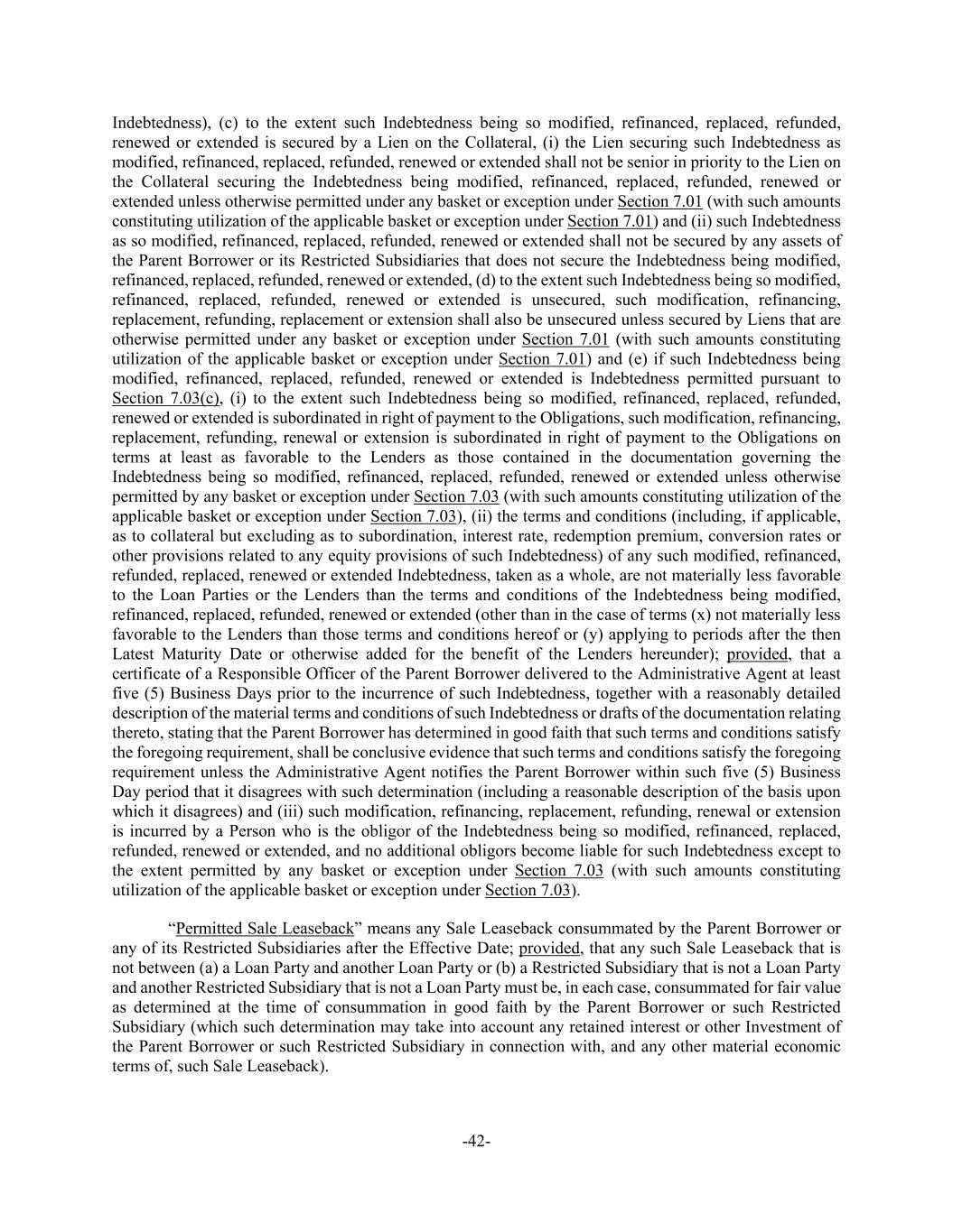 -42- Indebtedness), (c) to the extent such Indebtedness being so modified, refinanced, replaced, refunded, renewed or extended is secured by a Lien on the Collateral, (i) the Lien securing such Indebtedness as modified, refinanced, replaced, refunded, renewed or extended shall not be senior in priority to the Lien on the Collateral securing the Indebtedness being modified, refinanced, replaced, refunded, renewed or extended unless otherwise permitted under any basket or exception under Section 7.01 (with such amounts constituting utilization of the applicable basket or exception under Section 7.01) and (ii) such Indebtedness as so modified, refinanced, replaced, refunded, renewed or extended shall not be secured by any assets of the Parent Borrower or its Restricted Subsidiaries that does not secure the Indebtedness being modified, refinanced, replaced, refunded, renewed or extended, (d) to the extent such Indebtedness being so modified, refinanced, replaced, refunded, renewed or extended is unsecured, such modification, refinancing, replacement, refunding, replacement or extension shall also be unsecured unless secured by Liens that are otherwise permitted under any basket or exception under Section 7.01 (with such amounts constituting utilization of the applicable basket or exception under Section 7.01) and (e) if such Indebtedness being modified, refinanced, replaced, refunded, renewed or extended is Indebtedness permitted pursuant to Section 7.03(c), (i) to the extent such Indebtedness being so modified, refinanced, replaced, refunded, renewed or extended is subordinated in right of payment to the Obligations, such modification, refinancing, replacement, refunding, renewal or extension is subordinated in right of payment to the Obligations on terms at least as favorable to the Lenders as those contained in the documentation governing the Indebtedness being so modified, refinanced, replaced, refunded, renewed or extended unless otherwise permitted by any basket or exception under Section 7.03 (with such amounts constituting utilization of the applicable basket or exception under Section 7.03), (ii) the terms and conditions (including, if applicable, as to collateral but excluding as to subordination, interest rate, redemption premium, conversion rates or other provisions related to any equity provisions of such Indebtedness) of any such modified, refinanced, refunded, replaced, renewed or extended Indebtedness, taken as a whole, are not materially less favorable to the Loan Parties or the Lenders than the terms and conditions of the Indebtedness being modified, refinanced, replaced, refunded, renewed or extended (other than in the case of terms (x) not materially less favorable to the Lenders than those terms and conditions hereof or (y) applying to periods after the then Latest Maturity Date or otherwise added for the benefit of the Lenders hereunder); provided, that a certificate of a Responsible Officer of the Parent Borrower delivered to the Administrative Agent at least five (5) Business Days prior to the incurrence of such Indebtedness, together with a reasonably detailed description of the material terms and conditions of such Indebtedness or drafts of the documentation relating thereto, stating that the Parent Borrower has determined in good faith that such terms and conditions satisfy the foregoing requirement, shall be conclusive evidence that such terms and conditions satisfy the foregoing requirement unless the Administrative Agent notifies the Parent Borrower within such five (5) Business Day period that it disagrees with such determination (including a reasonable description of the basis upon which it disagrees) and (iii) such modification, refinancing, replacement, refunding, renewal or extension is incurred by a Person who is the obligor of the Indebtedness being so modified, refinanced, replaced, refunded, renewed or extended, and no additional obligors become liable for such Indebtedness except to the extent permitted by any basket or exception under Section 7.03 (with such amounts constituting utilization of the applicable basket or exception under Section 7.03). “Permitted Sale Leaseback” means any Sale Leaseback consummated by the Parent Borrower or any of its Restricted Subsidiaries after the Effective Date; provided, that any such Sale Leaseback that is not between (a) a Loan Party and another Loan Party or (b) a Restricted Subsidiary that is not a Loan Party and another Restricted Subsidiary that is not a Loan Party must be, in each case, consummated for fair value as determined at the time of consummation in good faith by the Parent Borrower or such Restricted Subsidiary (which such determination may take into account any retained interest or other Investment of the Parent Borrower or such Restricted Subsidiary in connection with, and any other material economic terms of, such Sale Leaseback).