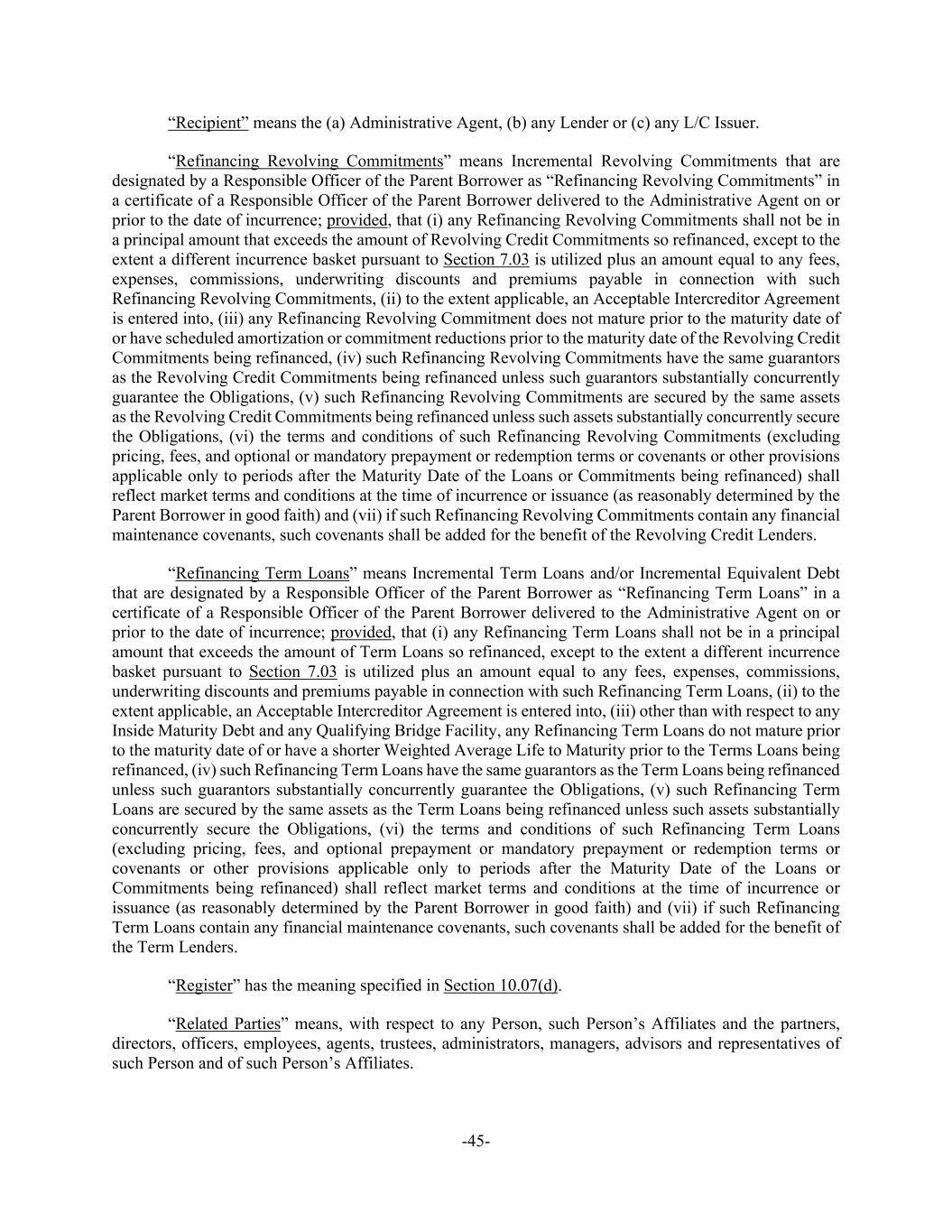 -45- “Recipient” means the (a) Administrative Agent, (b) any Lender or (c) any L/C Issuer. “Refinancing Revolving Commitments” means Incremental Revolving Commitments that are designated by a Responsible Officer of the Parent Borrower as “Refinancing Revolving Commitments” in a certificate of a Responsible Officer of the Parent Borrower delivered to the Administrative Agent on or prior to the date of incurrence; provided, that (i) any Refinancing Revolving Commitments shall not be in a principal amount that exceeds the amount of Revolving Credit Commitments so refinanced, except to the extent a different incurrence basket pursuant to Section 7.03 is utilized plus an amount equal to any fees, expenses, commissions, underwriting discounts and premiums payable in connection with such Refinancing Revolving Commitments, (ii) to the extent applicable, an Acceptable Intercreditor Agreement is entered into, (iii) any Refinancing Revolving Commitment does not mature prior to the maturity date of or have scheduled amortization or commitment reductions prior to the maturity date of the Revolving Credit Commitments being refinanced, (iv) such Refinancing Revolving Commitments have the same guarantors as the Revolving Credit Commitments being refinanced unless such guarantors substantially concurrently guarantee the Obligations, (v) such Refinancing Revolving Commitments are secured by the same assets as the Revolving Credit Commitments being refinanced unless such assets substantially concurrently secure the Obligations, (vi) the terms and conditions of such Refinancing Revolving Commitments (excluding pricing, fees, and optional or mandatory prepayment or redemption terms or covenants or other provisions applicable only to periods after the Maturity Date of the Loans or Commitments being refinanced) shall reflect market terms and conditions at the time of incurrence or issuance (as reasonably determined by the Parent Borrower in good faith) and (vii) if such Refinancing Revolving Commitments contain any financial maintenance covenants, such covenants shall be added for the benefit of the Revolving Credit Lenders. “Refinancing Term Loans” means Incremental Term Loans and/or Incremental Equivalent Debt that are designated by a Responsible Officer of the Parent Borrower as “Refinancing Term Loans” in a certificate of a Responsible Officer of the Parent Borrower delivered to the Administrative Agent on or prior to the date of incurrence; provided, that (i) any Refinancing Term Loans shall not be in a principal amount that exceeds the amount of Term Loans so refinanced, except to the extent a different incurrence basket pursuant to Section 7.03 is utilized plus an amount equal to any fees, expenses, commissions, underwriting discounts and premiums payable in connection with such Refinancing Term Loans, (ii) to the extent applicable, an Acceptable Intercreditor Agreement is entered into, (iii) other than with respect to any Inside Maturity Debt and any Qualifying Bridge Facility, any Refinancing Term Loans do not mature prior to the maturity date of or have a shorter Weighted Average Life to Maturity prior to the Terms Loans being refinanced, (iv) such Refinancing Term Loans have the same guarantors as the Term Loans being refinanced unless such guarantors substantially concurrently guarantee the Obligations, (v) such Refinancing Term Loans are secured by the same assets as the Term Loans being refinanced unless such assets substantially concurrently secure the Obligations, (vi) the terms and conditions of such Refinancing Term Loans (excluding pricing, fees, and optional prepayment or mandatory prepayment or redemption terms or covenants or other provisions applicable only to periods after the Maturity Date of the Loans or Commitments being refinanced) shall reflect market terms and conditions at the time of incurrence or issuance (as reasonably determined by the Parent Borrower in good faith) and (vii) if such Refinancing Term Loans contain any financial maintenance covenants, such covenants shall be added for the benefit of the Term Lenders. “Register” has the meaning specified in Section 10.07(d). “Related Parties” means, with respect to any Person, such Person’s Affiliates and the partners, directors, officers, employees, agents, trustees, administrators, managers, advisors and representatives of such Person and of such Person’s Affiliates.