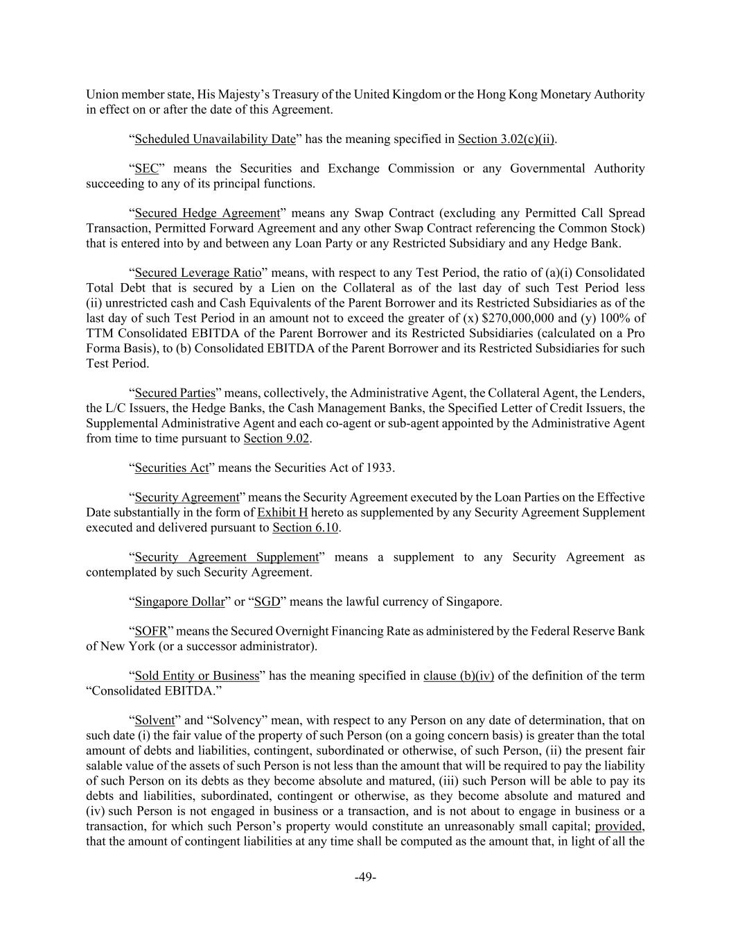 -49- Union member state, His Majesty’s Treasury of the United Kingdom or the Hong Kong Monetary Authority in effect on or after the date of this Agreement. “Scheduled Unavailability Date” has the meaning specified in Section 3.02(c)(ii). “SEC” means the Securities and Exchange Commission or any Governmental Authority succeeding to any of its principal functions. “Secured Hedge Agreement” means any Swap Contract (excluding any Permitted Call Spread Transaction, Permitted Forward Agreement and any other Swap Contract referencing the Common Stock) that is entered into by and between any Loan Party or any Restricted Subsidiary and any Hedge Bank. “Secured Leverage Ratio” means, with respect to any Test Period, the ratio of (a)(i) Consolidated Total Debt that is secured by a Lien on the Collateral as of the last day of such Test Period less (ii) unrestricted cash and Cash Equivalents of the Parent Borrower and its Restricted Subsidiaries as of the last day of such Test Period in an amount not to exceed the greater of (x) $270,000,000 and (y) 100% of TTM Consolidated EBITDA of the Parent Borrower and its Restricted Subsidiaries (calculated on a Pro Forma Basis), to (b) Consolidated EBITDA of the Parent Borrower and its Restricted Subsidiaries for such Test Period. “Secured Parties” means, collectively, the Administrative Agent, the Collateral Agent, the Lenders, the L/C Issuers, the Hedge Banks, the Cash Management Banks, the Specified Letter of Credit Issuers, the Supplemental Administrative Agent and each co-agent or sub-agent appointed by the Administrative Agent from time to time pursuant to Section 9.02. “Securities Act” means the Securities Act of 1933. “Security Agreement” means the Security Agreement executed by the Loan Parties on the Effective Date substantially in the form of Exhibit H hereto as supplemented by any Security Agreement Supplement executed and delivered pursuant to Section 6.10. “Security Agreement Supplement” means a supplement to any Security Agreement as contemplated by such Security Agreement. “Singapore Dollar” or “SGD” means the lawful currency of Singapore. “SOFR” means the Secured Overnight Financing Rate as administered by the Federal Reserve Bank of New York (or a successor administrator). “Sold Entity or Business” has the meaning specified in clause (b)(iv) of the definition of the term “Consolidated EBITDA.” “Solvent” and “Solvency” mean, with respect to any Person on any date of determination, that on such date (i) the fair value of the property of such Person (on a going concern basis) is greater than the total amount of debts and liabilities, contingent, subordinated or otherwise, of such Person, (ii) the present fair salable value of the assets of such Person is not less than the amount that will be required to pay the liability of such Person on its debts as they become absolute and matured, (iii) such Person will be able to pay its debts and liabilities, subordinated, contingent or otherwise, as they become absolute and matured and (iv) such Person is not engaged in business or a transaction, and is not about to engage in business or a transaction, for which such Person’s property would constitute an unreasonably small capital; provided, that the amount of contingent liabilities at any time shall be computed as the amount that, in light of all the