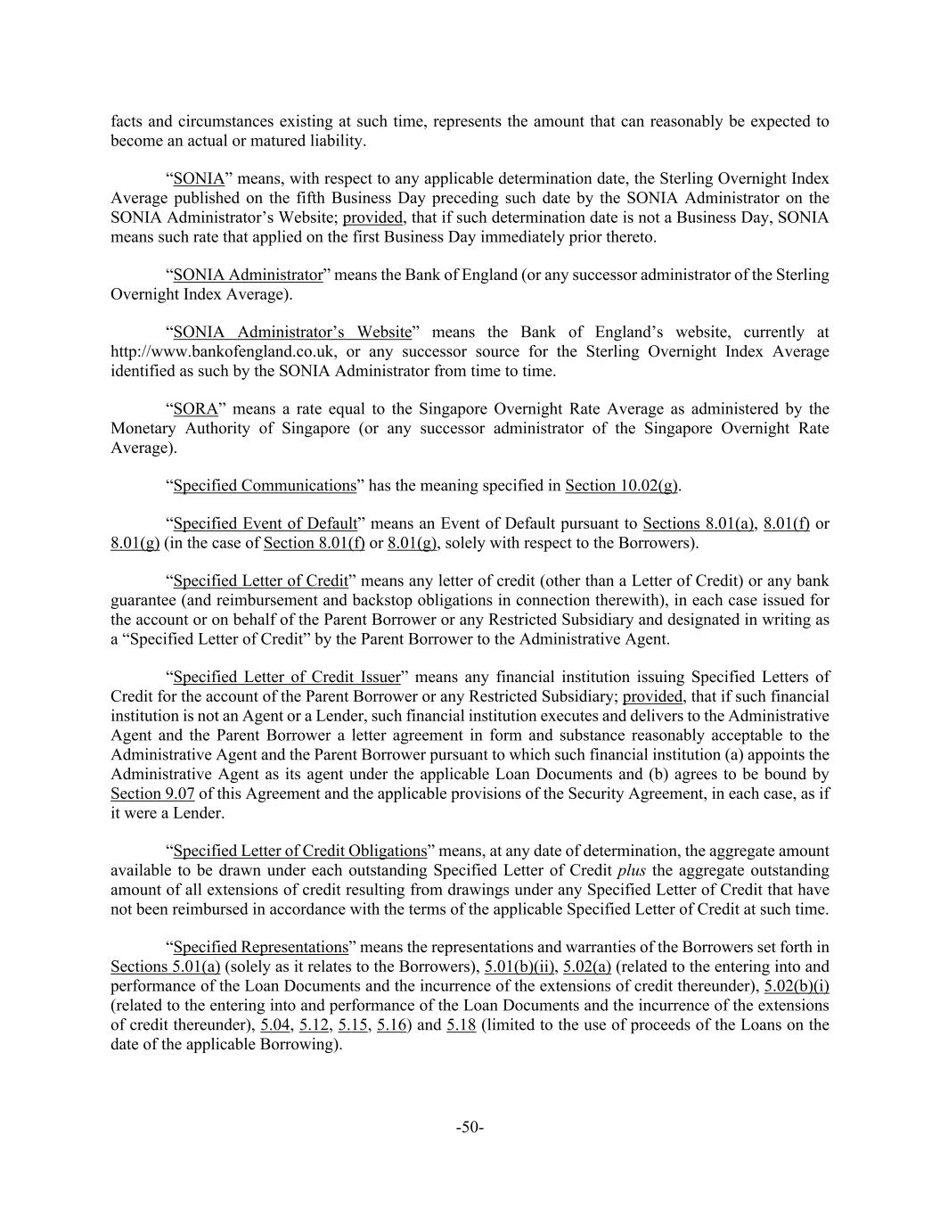 -50- facts and circumstances existing at such time, represents the amount that can reasonably be expected to become an actual or matured liability. “SONIA” means, with respect to any applicable determination date, the Sterling Overnight Index Average published on the fifth Business Day preceding such date by the SONIA Administrator on the SONIA Administrator’s Website; provided, that if such determination date is not a Business Day, SONIA means such rate that applied on the first Business Day immediately prior thereto. “SONIA Administrator” means the Bank of England (or any successor administrator of the Sterling Overnight Index Average). “SONIA Administrator’s Website” means the Bank of England’s website, currently at http://www.bankofengland.co.uk, or any successor source for the Sterling Overnight Index Average identified as such by the SONIA Administrator from time to time. “SORA” means a rate equal to the Singapore Overnight Rate Average as administered by the Monetary Authority of Singapore (or any successor administrator of the Singapore Overnight Rate Average). “Specified Communications” has the meaning specified in Section 10.02(g). “Specified Event of Default” means an Event of Default pursuant to Sections 8.01(a), 8.01(f) or 8.01(g) (in the case of Section 8.01(f) or 8.01(g), solely with respect to the Borrowers). “Specified Letter of Credit” means any letter of credit (other than a Letter of Credit) or any bank guarantee (and reimbursement and backstop obligations in connection therewith), in each case issued for the account or on behalf of the Parent Borrower or any Restricted Subsidiary and designated in writing as a “Specified Letter of Credit” by the Parent Borrower to the Administrative Agent. “Specified Letter of Credit Issuer” means any financial institution issuing Specified Letters of Credit for the account of the Parent Borrower or any Restricted Subsidiary; provided, that if such financial institution is not an Agent or a Lender, such financial institution executes and delivers to the Administrative Agent and the Parent Borrower a letter agreement in form and substance reasonably acceptable to the Administrative Agent and the Parent Borrower pursuant to which such financial institution (a) appoints the Administrative Agent as its agent under the applicable Loan Documents and (b) agrees to be bound by Section 9.07 of this Agreement and the applicable provisions of the Security Agreement, in each case, as if it were a Lender. “Specified Letter of Credit Obligations” means, at any date of determination, the aggregate amount available to be drawn under each outstanding Specified Letter of Credit plus the aggregate outstanding amount of all extensions of credit resulting from drawings under any Specified Letter of Credit that have not been reimbursed in accordance with the terms of the applicable Specified Letter of Credit at such time. “Specified Representations” means the representations and warranties of the Borrowers set forth in Sections 5.01(a) (solely as it relates to the Borrowers), 5.01(b)(ii), 5.02(a) (related to the entering into and performance of the Loan Documents and the incurrence of the extensions of credit thereunder), 5.02(b)(i) (related to the entering into and performance of the Loan Documents and the incurrence of the extensions of credit thereunder), 5.04, 5.12, 5.15, 5.16) and 5.18 (limited to the use of proceeds of the Loans on the date of the applicable Borrowing).