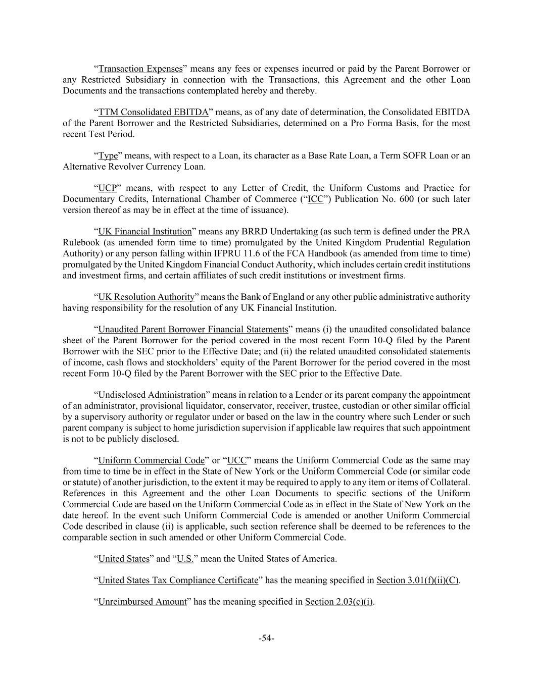 -54- “Transaction Expenses” means any fees or expenses incurred or paid by the Parent Borrower or any Restricted Subsidiary in connection with the Transactions, this Agreement and the other Loan Documents and the transactions contemplated hereby and thereby. “TTM Consolidated EBITDA” means, as of any date of determination, the Consolidated EBITDA of the Parent Borrower and the Restricted Subsidiaries, determined on a Pro Forma Basis, for the most recent Test Period. “Type” means, with respect to a Loan, its character as a Base Rate Loan, a Term SOFR Loan or an Alternative Revolver Currency Loan. “UCP” means, with respect to any Letter of Credit, the Uniform Customs and Practice for Documentary Credits, International Chamber of Commerce (“ICC”) Publication No. 600 (or such later version thereof as may be in effect at the time of issuance). “UK Financial Institution” means any BRRD Undertaking (as such term is defined under the PRA Rulebook (as amended form time to time) promulgated by the United Kingdom Prudential Regulation Authority) or any person falling within IFPRU 11.6 of the FCA Handbook (as amended from time to time) promulgated by the United Kingdom Financial Conduct Authority, which includes certain credit institutions and investment firms, and certain affiliates of such credit institutions or investment firms. “UK Resolution Authority” means the Bank of England or any other public administrative authority having responsibility for the resolution of any UK Financial Institution. “Unaudited Parent Borrower Financial Statements” means (i) the unaudited consolidated balance sheet of the Parent Borrower for the period covered in the most recent Form 10-Q filed by the Parent Borrower with the SEC prior to the Effective Date; and (ii) the related unaudited consolidated statements of income, cash flows and stockholders’ equity of the Parent Borrower for the period covered in the most recent Form 10-Q filed by the Parent Borrower with the SEC prior to the Effective Date. “Undisclosed Administration” means in relation to a Lender or its parent company the appointment of an administrator, provisional liquidator, conservator, receiver, trustee, custodian or other similar official by a supervisory authority or regulator under or based on the law in the country where such Lender or such parent company is subject to home jurisdiction supervision if applicable law requires that such appointment is not to be publicly disclosed. “Uniform Commercial Code” or “UCC” means the Uniform Commercial Code as the same may from time to time be in effect in the State of New York or the Uniform Commercial Code (or similar code or statute) of another jurisdiction, to the extent it may be required to apply to any item or items of Collateral. References in this Agreement and the other Loan Documents to specific sections of the Uniform Commercial Code are based on the Uniform Commercial Code as in effect in the State of New York on the date hereof. In the event such Uniform Commercial Code is amended or another Uniform Commercial Code described in clause (ii) is applicable, such section reference shall be deemed to be references to the comparable section in such amended or other Uniform Commercial Code. “United States” and “U.S.” mean the United States of America. “United States Tax Compliance Certificate” has the meaning specified in Section 3.01(f)(ii)(C). “Unreimbursed Amount” has the meaning specified in Section 2.03(c)(i).