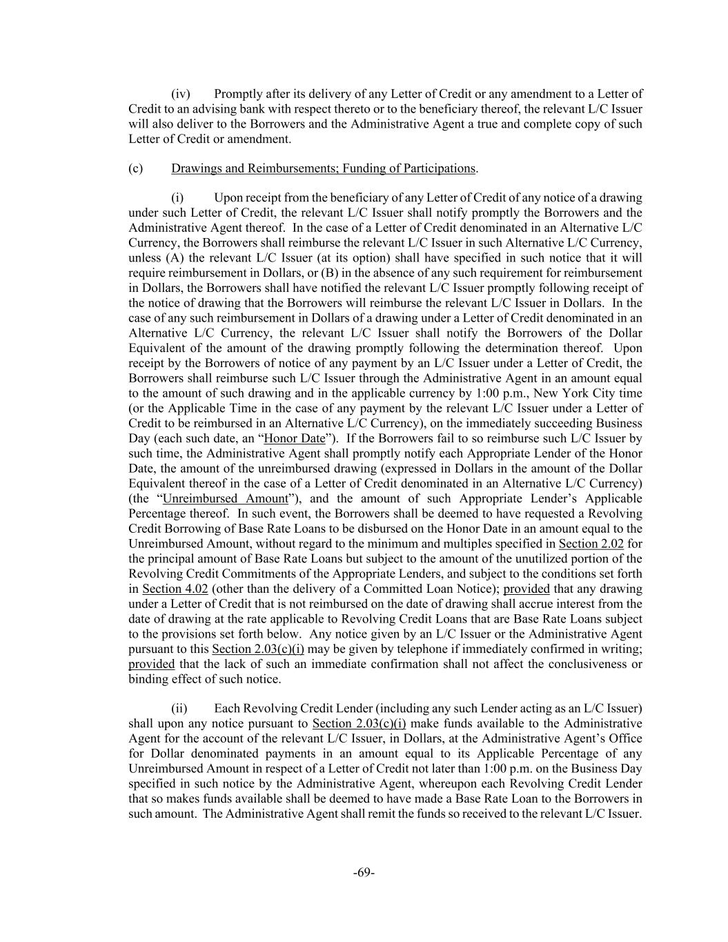 -69- (iv) Promptly after its delivery of any Letter of Credit or any amendment to a Letter of Credit to an advising bank with respect thereto or to the beneficiary thereof, the relevant L/C Issuer will also deliver to the Borrowers and the Administrative Agent a true and complete copy of such Letter of Credit or amendment. (c) Drawings and Reimbursements; Funding of Participations. (i) Upon receipt from the beneficiary of any Letter of Credit of any notice of a drawing under such Letter of Credit, the relevant L/C Issuer shall notify promptly the Borrowers and the Administrative Agent thereof. In the case of a Letter of Credit denominated in an Alternative L/C Currency, the Borrowers shall reimburse the relevant L/C Issuer in such Alternative L/C Currency, unless (A) the relevant L/C Issuer (at its option) shall have specified in such notice that it will require reimbursement in Dollars, or (B) in the absence of any such requirement for reimbursement in Dollars, the Borrowers shall have notified the relevant L/C Issuer promptly following receipt of the notice of drawing that the Borrowers will reimburse the relevant L/C Issuer in Dollars. In the case of any such reimbursement in Dollars of a drawing under a Letter of Credit denominated in an Alternative L/C Currency, the relevant L/C Issuer shall notify the Borrowers of the Dollar Equivalent of the amount of the drawing promptly following the determination thereof. Upon receipt by the Borrowers of notice of any payment by an L/C Issuer under a Letter of Credit, the Borrowers shall reimburse such L/C Issuer through the Administrative Agent in an amount equal to the amount of such drawing and in the applicable currency by 1:00 p.m., New York City time (or the Applicable Time in the case of any payment by the relevant L/C Issuer under a Letter of Credit to be reimbursed in an Alternative L/C Currency), on the immediately succeeding Business Day (each such date, an “Honor Date”). If the Borrowers fail to so reimburse such L/C Issuer by such time, the Administrative Agent shall promptly notify each Appropriate Lender of the Honor Date, the amount of the unreimbursed drawing (expressed in Dollars in the amount of the Dollar Equivalent thereof in the case of a Letter of Credit denominated in an Alternative L/C Currency) (the “Unreimbursed Amount”), and the amount of such Appropriate Lender’s Applicable Percentage thereof. In such event, the Borrowers shall be deemed to have requested a Revolving Credit Borrowing of Base Rate Loans to be disbursed on the Honor Date in an amount equal to the Unreimbursed Amount, without regard to the minimum and multiples specified in Section 2.02 for the principal amount of Base Rate Loans but subject to the amount of the unutilized portion of the Revolving Credit Commitments of the Appropriate Lenders, and subject to the conditions set forth in Section 4.02 (other than the delivery of a Committed Loan Notice); provided that any drawing under a Letter of Credit that is not reimbursed on the date of drawing shall accrue interest from the date of drawing at the rate applicable to Revolving Credit Loans that are Base Rate Loans subject to the provisions set forth below. Any notice given by an L/C Issuer or the Administrative Agent pursuant to this Section 2.03(c)(i) may be given by telephone if immediately confirmed in writing; provided that the lack of such an immediate confirmation shall not affect the conclusiveness or binding effect of such notice. (ii) Each Revolving Credit Lender (including any such Lender acting as an L/C Issuer) shall upon any notice pursuant to Section 2.03(c)(i) make funds available to the Administrative Agent for the account of the relevant L/C Issuer, in Dollars, at the Administrative Agent’s Office for Dollar denominated payments in an amount equal to its Applicable Percentage of any Unreimbursed Amount in respect of a Letter of Credit not later than 1:00 p.m. on the Business Day specified in such notice by the Administrative Agent, whereupon each Revolving Credit Lender that so makes funds available shall be deemed to have made a Base Rate Loan to the Borrowers in such amount. The Administrative Agent shall remit the funds so received to the relevant L/C Issuer.