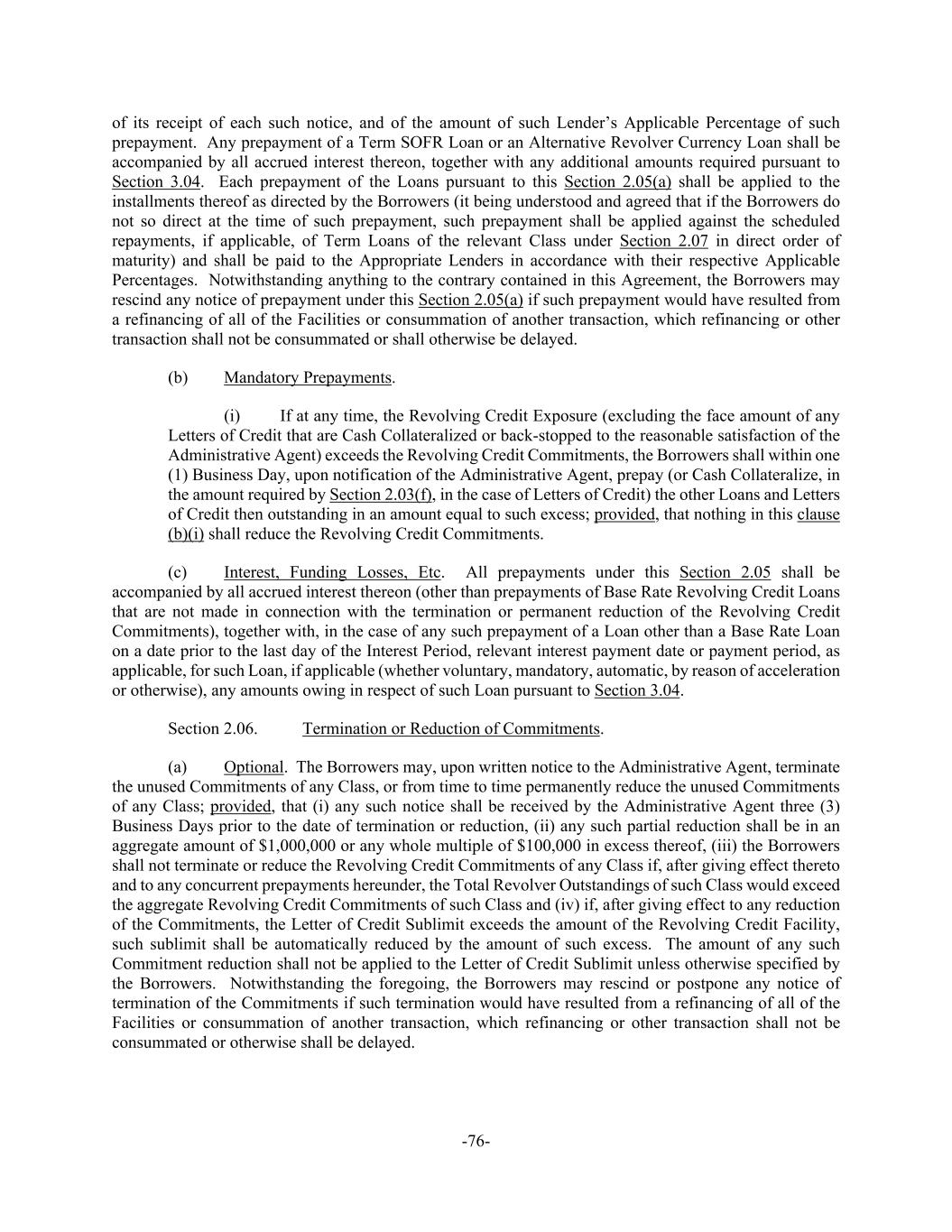 -76- of its receipt of each such notice, and of the amount of such Lender’s Applicable Percentage of such prepayment. Any prepayment of a Term SOFR Loan or an Alternative Revolver Currency Loan shall be accompanied by all accrued interest thereon, together with any additional amounts required pursuant to Section 3.04. Each prepayment of the Loans pursuant to this Section 2.05(a) shall be applied to the installments thereof as directed by the Borrowers (it being understood and agreed that if the Borrowers do not so direct at the time of such prepayment, such prepayment shall be applied against the scheduled repayments, if applicable, of Term Loans of the relevant Class under Section 2.07 in direct order of maturity) and shall be paid to the Appropriate Lenders in accordance with their respective Applicable Percentages. Notwithstanding anything to the contrary contained in this Agreement, the Borrowers may rescind any notice of prepayment under this Section 2.05(a) if such prepayment would have resulted from a refinancing of all of the Facilities or consummation of another transaction, which refinancing or other transaction shall not be consummated or shall otherwise be delayed. (b) Mandatory Prepayments. (i) If at any time, the Revolving Credit Exposure (excluding the face amount of any Letters of Credit that are Cash Collateralized or back-stopped to the reasonable satisfaction of the Administrative Agent) exceeds the Revolving Credit Commitments, the Borrowers shall within one (1) Business Day, upon notification of the Administrative Agent, prepay (or Cash Collateralize, in the amount required by Section 2.03(f), in the case of Letters of Credit) the other Loans and Letters of Credit then outstanding in an amount equal to such excess; provided, that nothing in this clause (b)(i) shall reduce the Revolving Credit Commitments. (c) Interest, Funding Losses, Etc. All prepayments under this Section 2.05 shall be accompanied by all accrued interest thereon (other than prepayments of Base Rate Revolving Credit Loans that are not made in connection with the termination or permanent reduction of the Revolving Credit Commitments), together with, in the case of any such prepayment of a Loan other than a Base Rate Loan on a date prior to the last day of the Interest Period, relevant interest payment date or payment period, as applicable, for such Loan, if applicable (whether voluntary, mandatory, automatic, by reason of acceleration or otherwise), any amounts owing in respect of such Loan pursuant to Section 3.04. Section 2.06. Termination or Reduction of Commitments. (a) Optional. The Borrowers may, upon written notice to the Administrative Agent, terminate the unused Commitments of any Class, or from time to time permanently reduce the unused Commitments of any Class; provided, that (i) any such notice shall be received by the Administrative Agent three (3) Business Days prior to the date of termination or reduction, (ii) any such partial reduction shall be in an aggregate amount of $1,000,000 or any whole multiple of $100,000 in excess thereof, (iii) the Borrowers shall not terminate or reduce the Revolving Credit Commitments of any Class if, after giving effect thereto and to any concurrent prepayments hereunder, the Total Revolver Outstandings of such Class would exceed the aggregate Revolving Credit Commitments of such Class and (iv) if, after giving effect to any reduction of the Commitments, the Letter of Credit Sublimit exceeds the amount of the Revolving Credit Facility, such sublimit shall be automatically reduced by the amount of such excess. The amount of any such Commitment reduction shall not be applied to the Letter of Credit Sublimit unless otherwise specified by the Borrowers. Notwithstanding the foregoing, the Borrowers may rescind or postpone any notice of termination of the Commitments if such termination would have resulted from a refinancing of all of the Facilities or consummation of another transaction, which refinancing or other transaction shall not be consummated or otherwise shall be delayed.