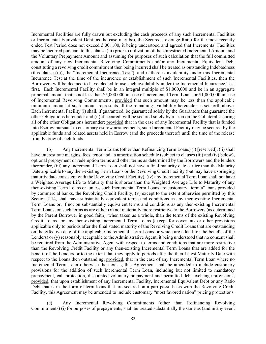 -82- Incremental Facilities are fully drawn but excluding the cash proceeds of any such Incremental Facilities or Incremental Equivalent Debt, as the case may be), the Secured Leverage Ratio for the most recently ended Test Period does not exceed 3.00:1.00, it being understood and agreed that Incremental Facilities may be incurred pursuant to this clause (iii) prior to utilization of the Unrestricted Incremental Amount and the Voluntary Prepayment Amount and assuming for purposes of such calculation that the full committed amount of any new Incremental Revolving Commitments and/or any Incremental Equivalent Debt constituting a revolving credit commitment then being incurred shall be treated as outstanding Indebtedness (this clause (iii), the “Incremental Incurrence Test”), and if there is availability under this Incremental Incurrence Test at the time of the incurrence or establishment of such Incremental Facilities, then the Borrowers will be deemed to have elected to use such availability under the Incremental Incurrence Test first. Each Incremental Facility shall be in an integral multiple of $1,000,000 and be in an aggregate principal amount that is not less than $5,000,000 in case of Incremental Term Loans or $1,000,000 in case of Incremental Revolving Commitments, provided that such amount may be less than the applicable minimum amount if such amount represents all the remaining availability hereunder as set forth above. Each Incremental Facility (i) shall, if guaranteed, be guaranteed solely by the Guarantors that guarantee the other Obligations hereunder and (ii) if secured, will be secured solely by a Lien on the Collateral securing all of the other Obligations hereunder; provided that in the case of any Incremental Facility that is funded into Escrow pursuant to customary escrow arrangements, such Incremental Facility may be secured by the applicable funds and related assets held in Escrow (and the proceeds thereof) until the time of the release from Escrow of such funds. (b) Any Incremental Term Loans (other than Refinancing Term Loans) (i) [reserved], (ii) shall have interest rate margins, fees, tenor and an amortization schedule (subject to clauses (iii) and (iv) below), optional prepayment or redemption terms and other terms as determined by the Borrowers and the lenders thereunder, (iii) any Incremental Term Loan shall not have a final maturity date earlier than the Maturity Date applicable to any then-existing Term Loans or the Revolving Credit Facility (but may have a springing maturity date consistent with the Revolving Credit Facility), (iv) any Incremental Term Loan shall not have a Weighted Average Life to Maturity that is shorter than the Weighted Average Life to Maturity of any then-existing Term Loans or, unless such Incremental Term Loans are customary “term a” loans provided by commercial banks, the Revolving Credit Facility, (v) except to the extent otherwise permitted by this Section 2.14, shall have substantially equivalent terms and conditions as any then-existing Incremental Term Loans or, if not on substantially equivalent terms and conditions as any then-existing Incremental Term Loans, on such terms as are either (x) not materially more restrictive to the Borrowers (as determined by the Parent Borrower in good faith), when taken as a whole, than the terms of the existing Revolving Credit Loans or any then-existing Incremental Term Loans (except for covenants or other provisions applicable only to periods after the final stated maturity of the Revolving Credit Loans that are outstanding on the effective date of the applicable Incremental Term Loans or which are added for the benefit of the Lenders) or (y) reasonably acceptable to the Administrative Agent, it being understood that no consent shall be required from the Administrative Agent with respect to terms and conditions that are more restrictive than the Revolving Credit Facility or any then-existing Incremental Term Loans that are added for the benefit of the Lenders or to the extent that they apply to periods after the then Latest Maturity Date with respect to the Loans then outstanding; provided, that in the case of any Incremental Term Loan where no Incremental Term Loan otherwise then exists, this Agreement shall be amended to include customary provisions for the addition of such Incremental Term Loan, including but not limited to mandatory prepayment, call protection, discounted voluntary prepayment and permitted debt exchange provisions; provided, that upon establishment of any Incremental Facility, Incremental Equivalent Debt or any Ratio Debt that is in the form of term loans that are secured on a pari passu basis with the Revolving Credit Facility, this Agreement may be amended to include customary “most favored nation” pricing protections. (c) Any Incremental Revolving Commitments (other than Refinancing Revolving Commitments) (i) for purposes of prepayments, shall be treated substantially the same as (and in any event