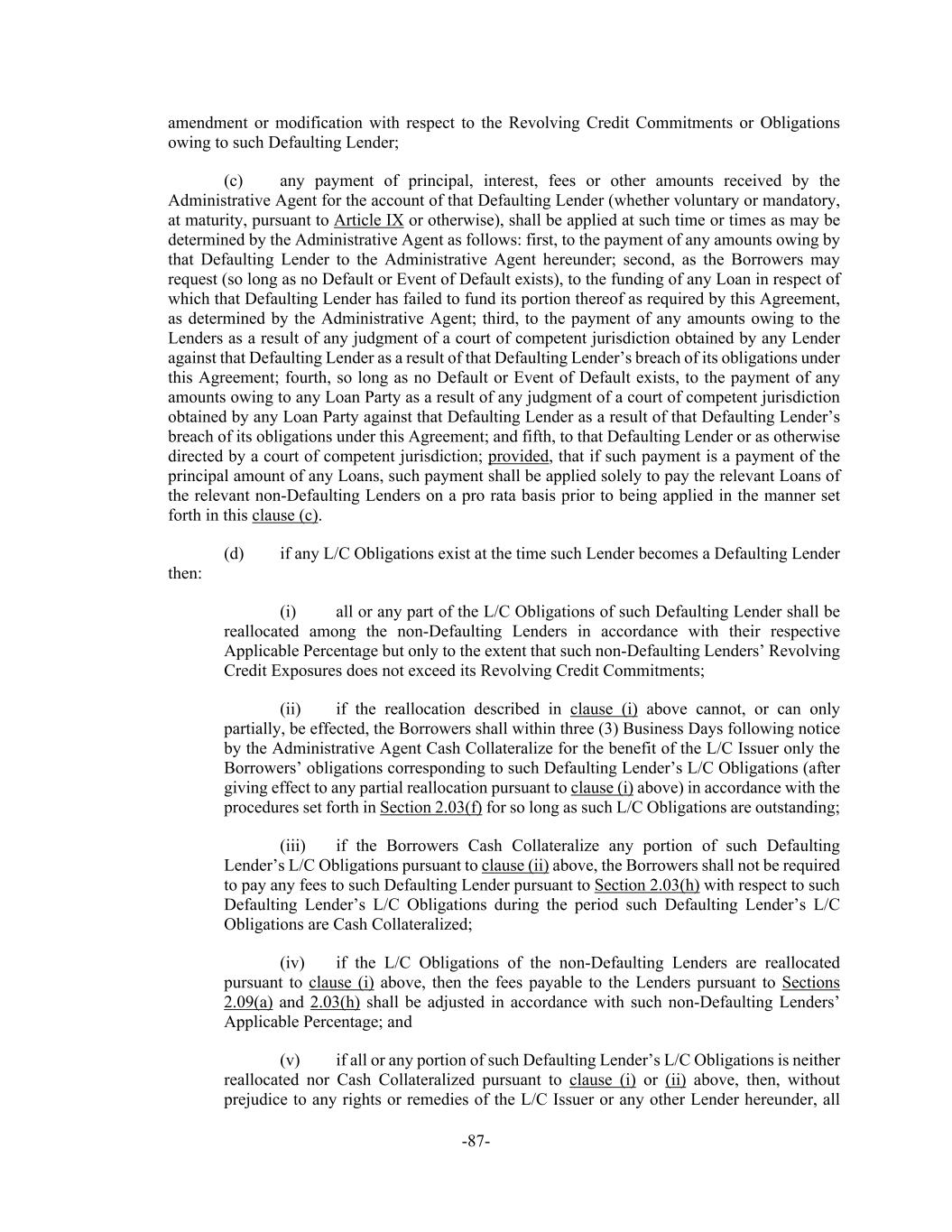 -87- amendment or modification with respect to the Revolving Credit Commitments or Obligations owing to such Defaulting Lender; (c) any payment of principal, interest, fees or other amounts received by the Administrative Agent for the account of that Defaulting Lender (whether voluntary or mandatory, at maturity, pursuant to Article IX or otherwise), shall be applied at such time or times as may be determined by the Administrative Agent as follows: first, to the payment of any amounts owing by that Defaulting Lender to the Administrative Agent hereunder; second, as the Borrowers may request (so long as no Default or Event of Default exists), to the funding of any Loan in respect of which that Defaulting Lender has failed to fund its portion thereof as required by this Agreement, as determined by the Administrative Agent; third, to the payment of any amounts owing to the Lenders as a result of any judgment of a court of competent jurisdiction obtained by any Lender against that Defaulting Lender as a result of that Defaulting Lender’s breach of its obligations under this Agreement; fourth, so long as no Default or Event of Default exists, to the payment of any amounts owing to any Loan Party as a result of any judgment of a court of competent jurisdiction obtained by any Loan Party against that Defaulting Lender as a result of that Defaulting Lender’s breach of its obligations under this Agreement; and fifth, to that Defaulting Lender or as otherwise directed by a court of competent jurisdiction; provided, that if such payment is a payment of the principal amount of any Loans, such payment shall be applied solely to pay the relevant Loans of the relevant non-Defaulting Lenders on a pro rata basis prior to being applied in the manner set forth in this clause (c). (d) if any L/C Obligations exist at the time such Lender becomes a Defaulting Lender then: (i) all or any part of the L/C Obligations of such Defaulting Lender shall be reallocated among the non-Defaulting Lenders in accordance with their respective Applicable Percentage but only to the extent that such non-Defaulting Lenders’ Revolving Credit Exposures does not exceed its Revolving Credit Commitments; (ii) if the reallocation described in clause (i) above cannot, or can only partially, be effected, the Borrowers shall within three (3) Business Days following notice by the Administrative Agent Cash Collateralize for the benefit of the L/C Issuer only the Borrowers’ obligations corresponding to such Defaulting Lender’s L/C Obligations (after giving effect to any partial reallocation pursuant to clause (i) above) in accordance with the procedures set forth in Section 2.03(f) for so long as such L/C Obligations are outstanding; (iii) if the Borrowers Cash Collateralize any portion of such Defaulting Lender’s L/C Obligations pursuant to clause (ii) above, the Borrowers shall not be required to pay any fees to such Defaulting Lender pursuant to Section 2.03(h) with respect to such Defaulting Lender’s L/C Obligations during the period such Defaulting Lender’s L/C Obligations are Cash Collateralized; (iv) if the L/C Obligations of the non-Defaulting Lenders are reallocated pursuant to clause (i) above, then the fees payable to the Lenders pursuant to Sections 2.09(a) and 2.03(h) shall be adjusted in accordance with such non-Defaulting Lenders’ Applicable Percentage; and (v) if all or any portion of such Defaulting Lender’s L/C Obligations is neither reallocated nor Cash Collateralized pursuant to clause (i) or (ii) above, then, without prejudice to any rights or remedies of the L/C Issuer or any other Lender hereunder, all