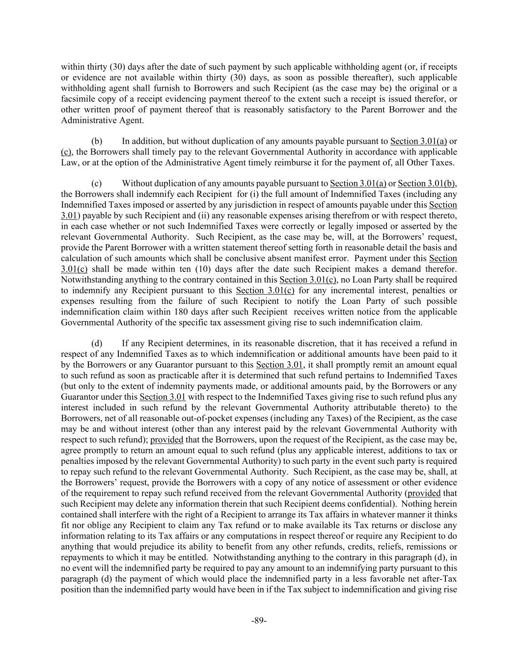 -89- within thirty (30) days after the date of such payment by such applicable withholding agent (or, if receipts or evidence are not available within thirty (30) days, as soon as possible thereafter), such applicable withholding agent shall furnish to Borrowers and such Recipient (as the case may be) the original or a facsimile copy of a receipt evidencing payment thereof to the extent such a receipt is issued therefor, or other written proof of payment thereof that is reasonably satisfactory to the Parent Borrower and the Administrative Agent. (b) In addition, but without duplication of any amounts payable pursuant to Section 3.01(a) or (c), the Borrowers shall timely pay to the relevant Governmental Authority in accordance with applicable Law, or at the option of the Administrative Agent timely reimburse it for the payment of, all Other Taxes. (c) Without duplication of any amounts payable pursuant to Section 3.01(a) or Section 3.01(b), the Borrowers shall indemnify each Recipient for (i) the full amount of Indemnified Taxes (including any Indemnified Taxes imposed or asserted by any jurisdiction in respect of amounts payable under this Section 3.01) payable by such Recipient and (ii) any reasonable expenses arising therefrom or with respect thereto, in each case whether or not such Indemnified Taxes were correctly or legally imposed or asserted by the relevant Governmental Authority. Such Recipient, as the case may be, will, at the Borrowers’ request, provide the Parent Borrower with a written statement thereof setting forth in reasonable detail the basis and calculation of such amounts which shall be conclusive absent manifest error. Payment under this Section 3.01(c) shall be made within ten (10) days after the date such Recipient makes a demand therefor. Notwithstanding anything to the contrary contained in this Section 3.01(c), no Loan Party shall be required to indemnify any Recipient pursuant to this Section 3.01(c) for any incremental interest, penalties or expenses resulting from the failure of such Recipient to notify the Loan Party of such possible indemnification claim within 180 days after such Recipient receives written notice from the applicable Governmental Authority of the specific tax assessment giving rise to such indemnification claim. (d) If any Recipient determines, in its reasonable discretion, that it has received a refund in respect of any Indemnified Taxes as to which indemnification or additional amounts have been paid to it by the Borrowers or any Guarantor pursuant to this Section 3.01, it shall promptly remit an amount equal to such refund as soon as practicable after it is determined that such refund pertains to Indemnified Taxes (but only to the extent of indemnity payments made, or additional amounts paid, by the Borrowers or any Guarantor under this Section 3.01 with respect to the Indemnified Taxes giving rise to such refund plus any interest included in such refund by the relevant Governmental Authority attributable thereto) to the Borrowers, net of all reasonable out-of-pocket expenses (including any Taxes) of the Recipient, as the case may be and without interest (other than any interest paid by the relevant Governmental Authority with respect to such refund); provided that the Borrowers, upon the request of the Recipient, as the case may be, agree promptly to return an amount equal to such refund (plus any applicable interest, additions to tax or penalties imposed by the relevant Governmental Authority) to such party in the event such party is required to repay such refund to the relevant Governmental Authority. Such Recipient, as the case may be, shall, at the Borrowers’ request, provide the Borrowers with a copy of any notice of assessment or other evidence of the requirement to repay such refund received from the relevant Governmental Authority (provided that such Recipient may delete any information therein that such Recipient deems confidential). Nothing herein contained shall interfere with the right of a Recipient to arrange its Tax affairs in whatever manner it thinks fit nor oblige any Recipient to claim any Tax refund or to make available its Tax returns or disclose any information relating to its Tax affairs or any computations in respect thereof or require any Recipient to do anything that would prejudice its ability to benefit from any other refunds, credits, reliefs, remissions or repayments to which it may be entitled. Notwithstanding anything to the contrary in this paragraph (d), in no event will the indemnified party be required to pay any amount to an indemnifying party pursuant to this paragraph (d) the payment of which would place the indemnified party in a less favorable net after-Tax position than the indemnified party would have been in if the Tax subject to indemnification and giving rise