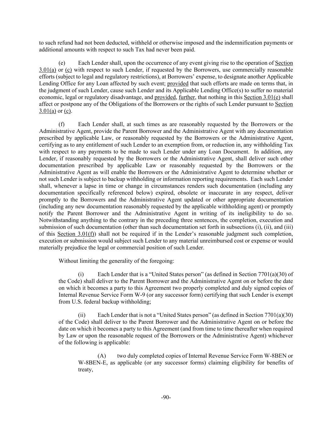 -90- to such refund had not been deducted, withheld or otherwise imposed and the indemnification payments or additional amounts with respect to such Tax had never been paid. (e) Each Lender shall, upon the occurrence of any event giving rise to the operation of Section 3.01(a) or (c) with respect to such Lender, if requested by the Borrowers, use commercially reasonable efforts (subject to legal and regulatory restrictions), at Borrowers’ expense, to designate another Applicable Lending Office for any Loan affected by such event; provided that such efforts are made on terms that, in the judgment of such Lender, cause such Lender and its Applicable Lending Office(s) to suffer no material economic, legal or regulatory disadvantage, and provided, further, that nothing in this Section 3.01(e) shall affect or postpone any of the Obligations of the Borrowers or the rights of such Lender pursuant to Section 3.01(a) or (c). (f) Each Lender shall, at such times as are reasonably requested by the Borrowers or the Administrative Agent, provide the Parent Borrower and the Administrative Agent with any documentation prescribed by applicable Law, or reasonably requested by the Borrowers or the Administrative Agent, certifying as to any entitlement of such Lender to an exemption from, or reduction in, any withholding Tax with respect to any payments to be made to such Lender under any Loan Document. In addition, any Lender, if reasonably requested by the Borrowers or the Administrative Agent, shall deliver such other documentation prescribed by applicable Law or reasonably requested by the Borrowers or the Administrative Agent as will enable the Borrowers or the Administrative Agent to determine whether or not such Lender is subject to backup withholding or information reporting requirements. Each such Lender shall, whenever a lapse in time or change in circumstances renders such documentation (including any documentation specifically referenced below) expired, obsolete or inaccurate in any respect, deliver promptly to the Borrowers and the Administrative Agent updated or other appropriate documentation (including any new documentation reasonably requested by the applicable withholding agent) or promptly notify the Parent Borrower and the Administrative Agent in writing of its ineligibility to do so. Notwithstanding anything to the contrary in the preceding three sentences, the completion, execution and submission of such documentation (other than such documentation set forth in subsections (i), (ii), and (iii) of this Section 3.01(f)) shall not be required if in the Lender’s reasonable judgment such completion, execution or submission would subject such Lender to any material unreimbursed cost or expense or would materially prejudice the legal or commercial position of such Lender. Without limiting the generality of the foregoing: (i) Each Lender that is a “United States person” (as defined in Section 7701(a)(30) of the Code) shall deliver to the Parent Borrower and the Administrative Agent on or before the date on which it becomes a party to this Agreement two properly completed and duly signed copies of Internal Revenue Service Form W-9 (or any successor form) certifying that such Lender is exempt from U.S. federal backup withholding; (ii) Each Lender that is not a “United States person” (as defined in Section 7701(a)(30) of the Code) shall deliver to the Parent Borrower and the Administrative Agent on or before the date on which it becomes a party to this Agreement (and from time to time thereafter when required by Law or upon the reasonable request of the Borrowers or the Administrative Agent) whichever of the following is applicable: (A) two duly completed copies of Internal Revenue Service Form W-8BEN or W-8BEN-E, as applicable (or any successor forms) claiming eligibility for benefits of treaty,