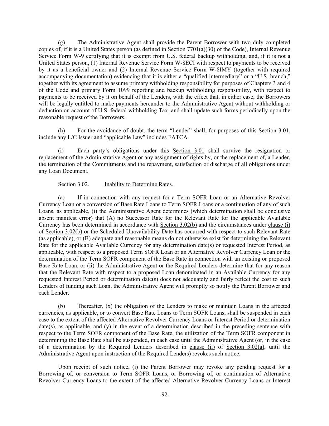 -92- (g) The Administrative Agent shall provide the Parent Borrower with two duly completed copies of, if it is a United States person (as defined in Section 7701(a)(30) of the Code), Internal Revenue Service Form W-9 certifying that it is exempt from U.S. federal backup withholding, and, if it is not a United States person, (1) Internal Revenue Service Form W-8ECI with respect to payments to be received by it as a beneficial owner and (2) Internal Revenue Service Form W-8IMY (together with required accompanying documentation) evidencing that it is either a “qualified intermediary” or a “U.S. branch,” together with its agreement to assume primary withholding responsibility for purposes of Chapters 3 and 4 of the Code and primary Form 1099 reporting and backup withholding responsibility, with respect to payments to be received by it on behalf of the Lenders, with the effect that, in either case, the Borrowers will be legally entitled to make payments hereunder to the Administrative Agent without withholding or deduction on account of U.S. federal withholding Tax, and shall update such forms periodically upon the reasonable request of the Borrowers. (h) For the avoidance of doubt, the term “Lender” shall, for purposes of this Section 3.01, include any L/C Issuer and “applicable Law” includes FATCA. (i) Each party’s obligations under this Section 3.01 shall survive the resignation or replacement of the Administrative Agent or any assignment of rights by, or the replacement of, a Lender, the termination of the Commitments and the repayment, satisfaction or discharge of all obligations under any Loan Document. Section 3.02. Inability to Determine Rates. (a) If in connection with any request for a Term SOFR Loan or an Alternative Revolver Currency Loan or a conversion of Base Rate Loans to Term SOFR Loans or a continuation of any of such Loans, as applicable, (i) the Administrative Agent determines (which determination shall be conclusive absent manifest error) that (A) no Successor Rate for the Relevant Rate for the applicable Available Currency has been determined in accordance with Section 3.02(b) and the circumstances under clause (i) of Section 3.02(b) or the Scheduled Unavailability Date has occurred with respect to such Relevant Rate (as applicable), or (B) adequate and reasonable means do not otherwise exist for determining the Relevant Rate for the applicable Available Currency for any determination date(s) or requested Interest Period, as applicable, with respect to a proposed Term SOFR Loan or an Alternative Revolver Currency Loan or the determination of the Term SOFR component of the Base Rate in connection with an existing or proposed Base Rate Loan, or (ii) the Administrative Agent or the Required Lenders determine that for any reason that the Relevant Rate with respect to a proposed Loan denominated in an Available Currency for any requested Interest Period or determination date(s) does not adequately and fairly reflect the cost to such Lenders of funding such Loan, the Administrative Agent will promptly so notify the Parent Borrower and each Lender. (b) Thereafter, (x) the obligation of the Lenders to make or maintain Loans in the affected currencies, as applicable, or to convert Base Rate Loans to Term SOFR Loans, shall be suspended in each case to the extent of the affected Alternative Revolver Currency Loans or Interest Period or determination date(s), as applicable, and (y) in the event of a determination described in the preceding sentence with respect to the Term SOFR component of the Base Rate, the utilization of the Term SOFR component in determining the Base Rate shall be suspended, in each case until the Administrative Agent (or, in the case of a determination by the Required Lenders described in clause (ii) of Section 3.02(a), until the Administrative Agent upon instruction of the Required Lenders) revokes such notice. Upon receipt of such notice, (i) the Parent Borrower may revoke any pending request for a Borrowing of, or conversion to Term SOFR Loans, or Borrowing of, or continuation of Alternative Revolver Currency Loans to the extent of the affected Alternative Revolver Currency Loans or Interest