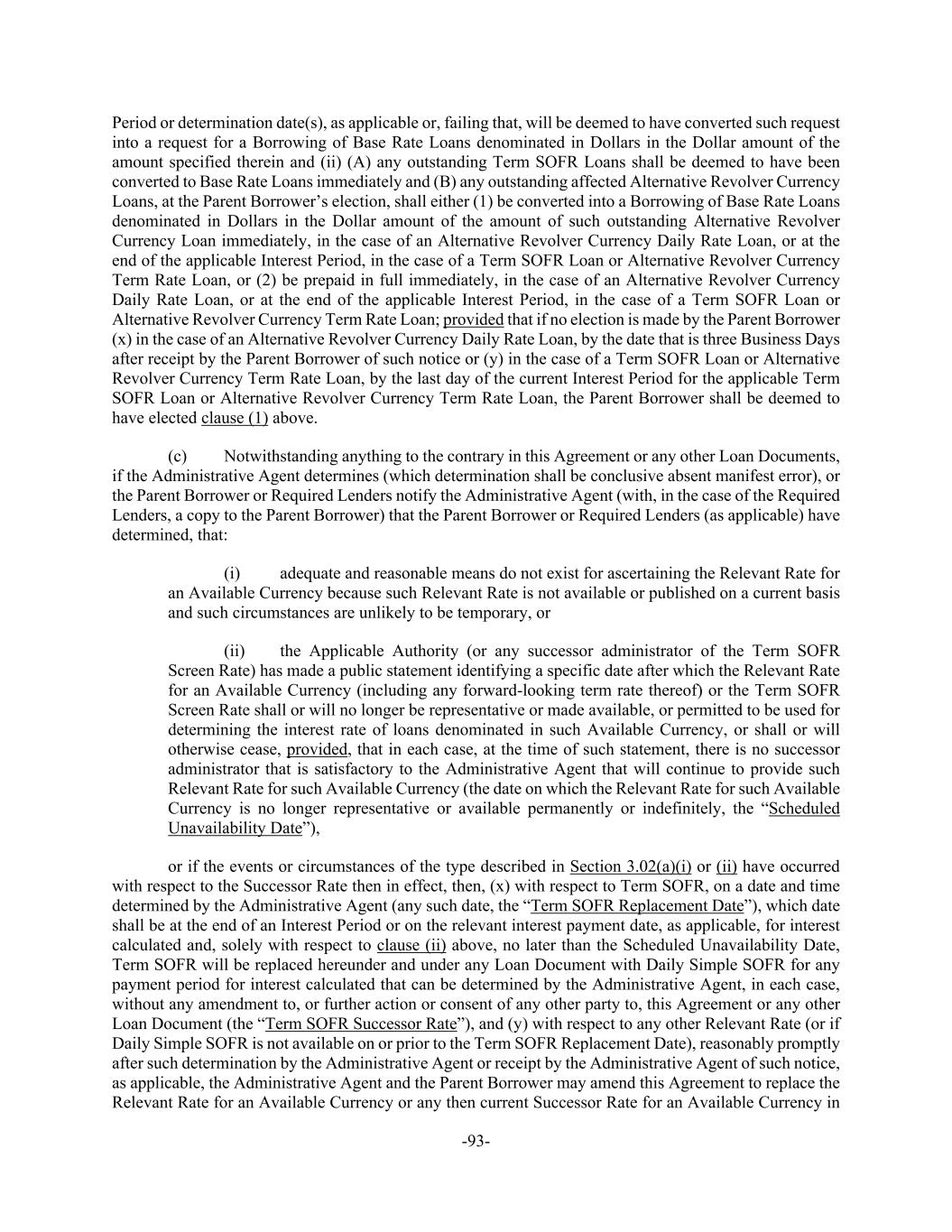 -93- Period or determination date(s), as applicable or, failing that, will be deemed to have converted such request into a request for a Borrowing of Base Rate Loans denominated in Dollars in the Dollar amount of the amount specified therein and (ii) (A) any outstanding Term SOFR Loans shall be deemed to have been converted to Base Rate Loans immediately and (B) any outstanding affected Alternative Revolver Currency Loans, at the Parent Borrower’s election, shall either (1) be converted into a Borrowing of Base Rate Loans denominated in Dollars in the Dollar amount of the amount of such outstanding Alternative Revolver Currency Loan immediately, in the case of an Alternative Revolver Currency Daily Rate Loan, or at the end of the applicable Interest Period, in the case of a Term SOFR Loan or Alternative Revolver Currency Term Rate Loan, or (2) be prepaid in full immediately, in the case of an Alternative Revolver Currency Daily Rate Loan, or at the end of the applicable Interest Period, in the case of a Term SOFR Loan or Alternative Revolver Currency Term Rate Loan; provided that if no election is made by the Parent Borrower (x) in the case of an Alternative Revolver Currency Daily Rate Loan, by the date that is three Business Days after receipt by the Parent Borrower of such notice or (y) in the case of a Term SOFR Loan or Alternative Revolver Currency Term Rate Loan, by the last day of the current Interest Period for the applicable Term SOFR Loan or Alternative Revolver Currency Term Rate Loan, the Parent Borrower shall be deemed to have elected clause (1) above. (c) Notwithstanding anything to the contrary in this Agreement or any other Loan Documents, if the Administrative Agent determines (which determination shall be conclusive absent manifest error), or the Parent Borrower or Required Lenders notify the Administrative Agent (with, in the case of the Required Lenders, a copy to the Parent Borrower) that the Parent Borrower or Required Lenders (as applicable) have determined, that: (i) adequate and reasonable means do not exist for ascertaining the Relevant Rate for an Available Currency because such Relevant Rate is not available or published on a current basis and such circumstances are unlikely to be temporary, or (ii) the Applicable Authority (or any successor administrator of the Term SOFR Screen Rate) has made a public statement identifying a specific date after which the Relevant Rate for an Available Currency (including any forward-looking term rate thereof) or the Term SOFR Screen Rate shall or will no longer be representative or made available, or permitted to be used for determining the interest rate of loans denominated in such Available Currency, or shall or will otherwise cease, provided, that in each case, at the time of such statement, there is no successor administrator that is satisfactory to the Administrative Agent that will continue to provide such Relevant Rate for such Available Currency (the date on which the Relevant Rate for such Available Currency is no longer representative or available permanently or indefinitely, the “Scheduled Unavailability Date”), or if the events or circumstances of the type described in Section 3.02(a)(i) or (ii) have occurred with respect to the Successor Rate then in effect, then, (x) with respect to Term SOFR, on a date and time determined by the Administrative Agent (any such date, the “Term SOFR Replacement Date”), which date shall be at the end of an Interest Period or on the relevant interest payment date, as applicable, for interest calculated and, solely with respect to clause (ii) above, no later than the Scheduled Unavailability Date, Term SOFR will be replaced hereunder and under any Loan Document with Daily Simple SOFR for any payment period for interest calculated that can be determined by the Administrative Agent, in each case, without any amendment to, or further action or consent of any other party to, this Agreement or any other Loan Document (the “Term SOFR Successor Rate”), and (y) with respect to any other Relevant Rate (or if Daily Simple SOFR is not available on or prior to the Term SOFR Replacement Date), reasonably promptly after such determination by the Administrative Agent or receipt by the Administrative Agent of such notice, as applicable, the Administrative Agent and the Parent Borrower may amend this Agreement to replace the Relevant Rate for an Available Currency or any then current Successor Rate for an Available Currency in