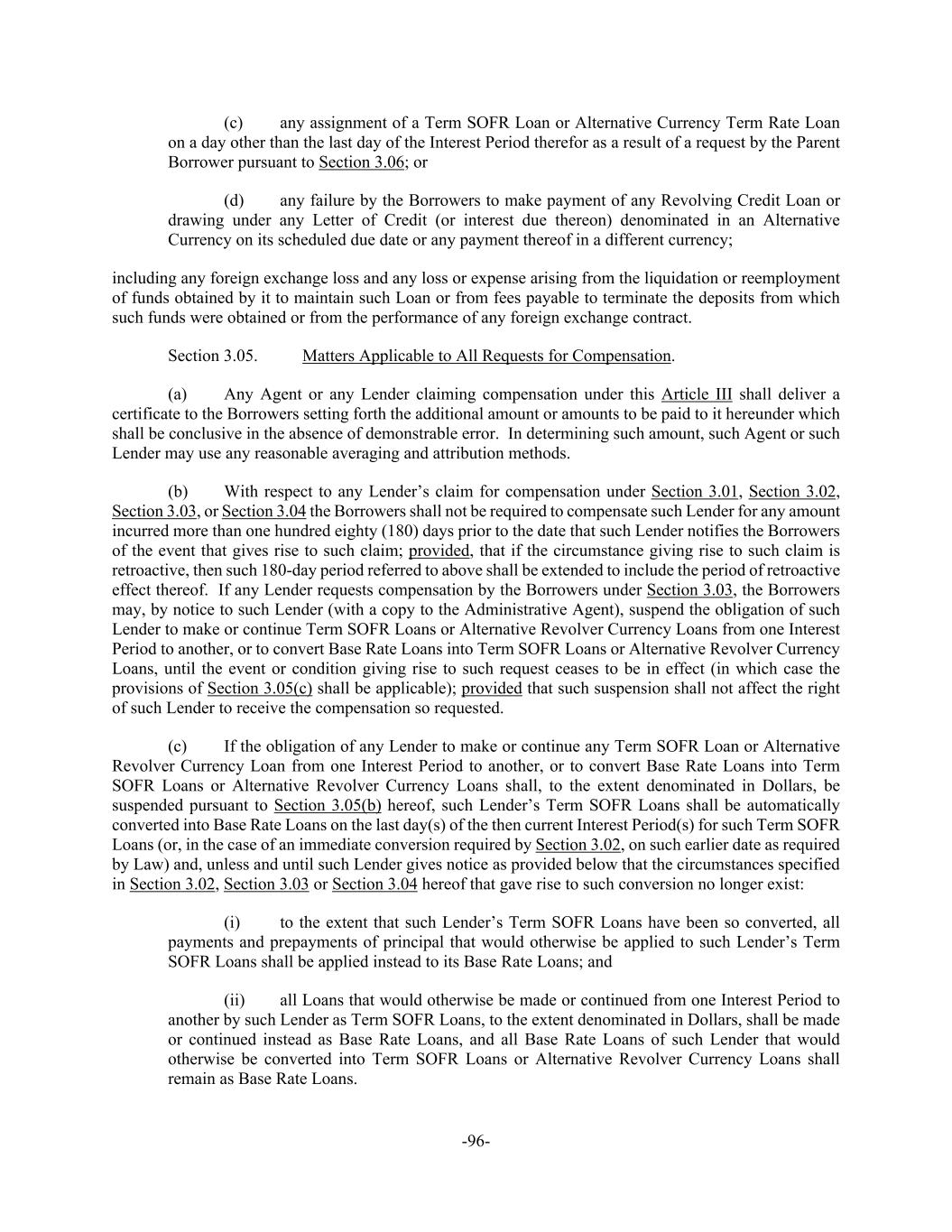 -96- (c) any assignment of a Term SOFR Loan or Alternative Currency Term Rate Loan on a day other than the last day of the Interest Period therefor as a result of a request by the Parent Borrower pursuant to Section 3.06; or (d) any failure by the Borrowers to make payment of any Revolving Credit Loan or drawing under any Letter of Credit (or interest due thereon) denominated in an Alternative Currency on its scheduled due date or any payment thereof in a different currency; including any foreign exchange loss and any loss or expense arising from the liquidation or reemployment of funds obtained by it to maintain such Loan or from fees payable to terminate the deposits from which such funds were obtained or from the performance of any foreign exchange contract. Section 3.05. Matters Applicable to All Requests for Compensation. (a) Any Agent or any Lender claiming compensation under this Article III shall deliver a certificate to the Borrowers setting forth the additional amount or amounts to be paid to it hereunder which shall be conclusive in the absence of demonstrable error. In determining such amount, such Agent or such Lender may use any reasonable averaging and attribution methods. (b) With respect to any Lender’s claim for compensation under Section 3.01, Section 3.02, Section 3.03, or Section 3.04 the Borrowers shall not be required to compensate such Lender for any amount incurred more than one hundred eighty (180) days prior to the date that such Lender notifies the Borrowers of the event that gives rise to such claim; provided, that if the circumstance giving rise to such claim is retroactive, then such 180-day period referred to above shall be extended to include the period of retroactive effect thereof. If any Lender requests compensation by the Borrowers under Section 3.03, the Borrowers may, by notice to such Lender (with a copy to the Administrative Agent), suspend the obligation of such Lender to make or continue Term SOFR Loans or Alternative Revolver Currency Loans from one Interest Period to another, or to convert Base Rate Loans into Term SOFR Loans or Alternative Revolver Currency Loans, until the event or condition giving rise to such request ceases to be in effect (in which case the provisions of Section 3.05(c) shall be applicable); provided that such suspension shall not affect the right of such Lender to receive the compensation so requested. (c) If the obligation of any Lender to make or continue any Term SOFR Loan or Alternative Revolver Currency Loan from one Interest Period to another, or to convert Base Rate Loans into Term SOFR Loans or Alternative Revolver Currency Loans shall, to the extent denominated in Dollars, be suspended pursuant to Section 3.05(b) hereof, such Lender’s Term SOFR Loans shall be automatically converted into Base Rate Loans on the last day(s) of the then current Interest Period(s) for such Term SOFR Loans (or, in the case of an immediate conversion required by Section 3.02, on such earlier date as required by Law) and, unless and until such Lender gives notice as provided below that the circumstances specified in Section 3.02, Section 3.03 or Section 3.04 hereof that gave rise to such conversion no longer exist: (i) to the extent that such Lender’s Term SOFR Loans have been so converted, all payments and prepayments of principal that would otherwise be applied to such Lender’s Term SOFR Loans shall be applied instead to its Base Rate Loans; and (ii) all Loans that would otherwise be made or continued from one Interest Period to another by such Lender as Term SOFR Loans, to the extent denominated in Dollars, shall be made or continued instead as Base Rate Loans, and all Base Rate Loans of such Lender that would otherwise be converted into Term SOFR Loans or Alternative Revolver Currency Loans shall remain as Base Rate Loans.