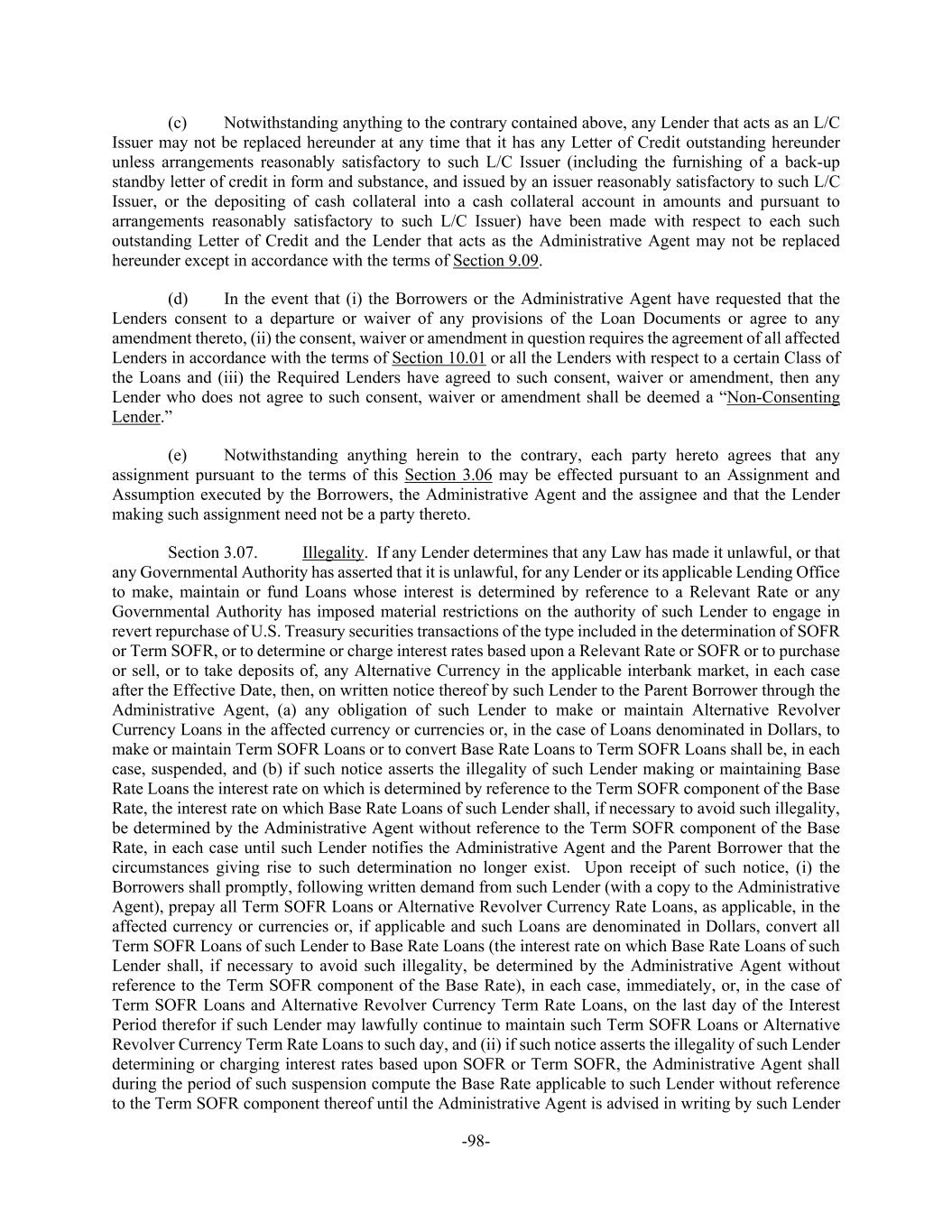 -98- (c) Notwithstanding anything to the contrary contained above, any Lender that acts as an L/C Issuer may not be replaced hereunder at any time that it has any Letter of Credit outstanding hereunder unless arrangements reasonably satisfactory to such L/C Issuer (including the furnishing of a back-up standby letter of credit in form and substance, and issued by an issuer reasonably satisfactory to such L/C Issuer, or the depositing of cash collateral into a cash collateral account in amounts and pursuant to arrangements reasonably satisfactory to such L/C Issuer) have been made with respect to each such outstanding Letter of Credit and the Lender that acts as the Administrative Agent may not be replaced hereunder except in accordance with the terms of Section 9.09. (d) In the event that (i) the Borrowers or the Administrative Agent have requested that the Lenders consent to a departure or waiver of any provisions of the Loan Documents or agree to any amendment thereto, (ii) the consent, waiver or amendment in question requires the agreement of all affected Lenders in accordance with the terms of Section 10.01 or all the Lenders with respect to a certain Class of the Loans and (iii) the Required Lenders have agreed to such consent, waiver or amendment, then any Lender who does not agree to such consent, waiver or amendment shall be deemed a “Non-Consenting Lender.” (e) Notwithstanding anything herein to the contrary, each party hereto agrees that any assignment pursuant to the terms of this Section 3.06 may be effected pursuant to an Assignment and Assumption executed by the Borrowers, the Administrative Agent and the assignee and that the Lender making such assignment need not be a party thereto. Section 3.07. Illegality. If any Lender determines that any Law has made it unlawful, or that any Governmental Authority has asserted that it is unlawful, for any Lender or its applicable Lending Office to make, maintain or fund Loans whose interest is determined by reference to a Relevant Rate or any Governmental Authority has imposed material restrictions on the authority of such Lender to engage in revert repurchase of U.S. Treasury securities transactions of the type included in the determination of SOFR or Term SOFR, or to determine or charge interest rates based upon a Relevant Rate or SOFR or to purchase or sell, or to take deposits of, any Alternative Currency in the applicable interbank market, in each case after the Effective Date, then, on written notice thereof by such Lender to the Parent Borrower through the Administrative Agent, (a) any obligation of such Lender to make or maintain Alternative Revolver Currency Loans in the affected currency or currencies or, in the case of Loans denominated in Dollars, to make or maintain Term SOFR Loans or to convert Base Rate Loans to Term SOFR Loans shall be, in each case, suspended, and (b) if such notice asserts the illegality of such Lender making or maintaining Base Rate Loans the interest rate on which is determined by reference to the Term SOFR component of the Base Rate, the interest rate on which Base Rate Loans of such Lender shall, if necessary to avoid such illegality, be determined by the Administrative Agent without reference to the Term SOFR component of the Base Rate, in each case until such Lender notifies the Administrative Agent and the Parent Borrower that the circumstances giving rise to such determination no longer exist. Upon receipt of such notice, (i) the Borrowers shall promptly, following written demand from such Lender (with a copy to the Administrative Agent), prepay all Term SOFR Loans or Alternative Revolver Currency Rate Loans, as applicable, in the affected currency or currencies or, if applicable and such Loans are denominated in Dollars, convert all Term SOFR Loans of such Lender to Base Rate Loans (the interest rate on which Base Rate Loans of such Lender shall, if necessary to avoid such illegality, be determined by the Administrative Agent without reference to the Term SOFR component of the Base Rate), in each case, immediately, or, in the case of Term SOFR Loans and Alternative Revolver Currency Term Rate Loans, on the last day of the Interest Period therefor if such Lender may lawfully continue to maintain such Term SOFR Loans or Alternative Revolver Currency Term Rate Loans to such day, and (ii) if such notice asserts the illegality of such Lender determining or charging interest rates based upon SOFR or Term SOFR, the Administrative Agent shall during the period of such suspension compute the Base Rate applicable to such Lender without reference to the Term SOFR component thereof until the Administrative Agent is advised in writing by such Lender