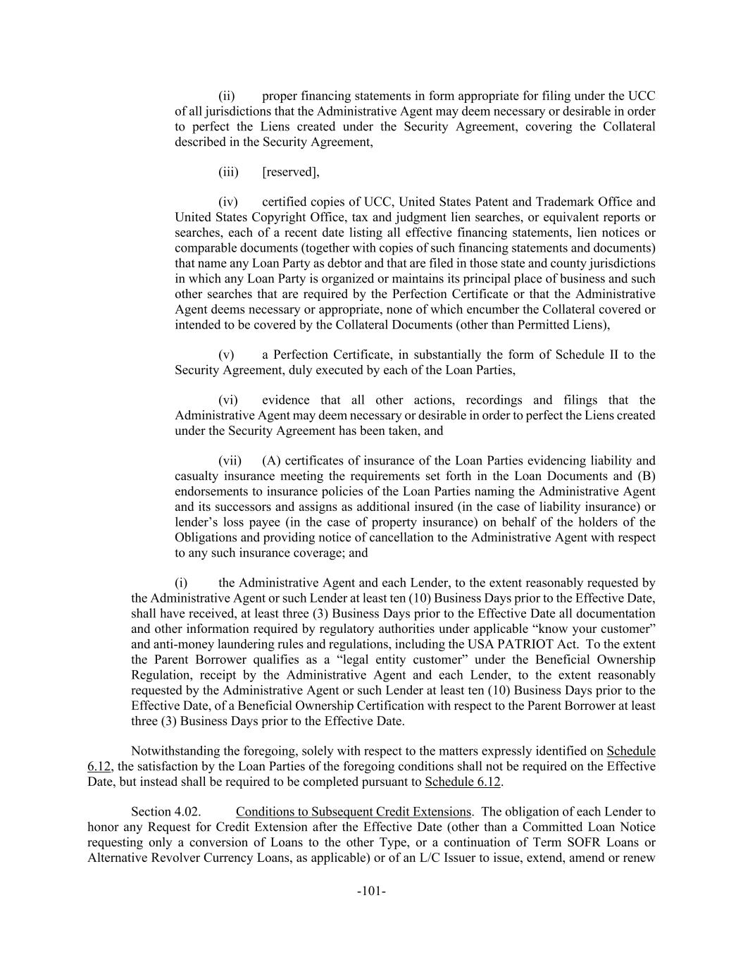 -101- (ii) proper financing statements in form appropriate for filing under the UCC of all jurisdictions that the Administrative Agent may deem necessary or desirable in order to perfect the Liens created under the Security Agreement, covering the Collateral described in the Security Agreement, (iii) [reserved], (iv) certified copies of UCC, United States Patent and Trademark Office and United States Copyright Office, tax and judgment lien searches, or equivalent reports or searches, each of a recent date listing all effective financing statements, lien notices or comparable documents (together with copies of such financing statements and documents) that name any Loan Party as debtor and that are filed in those state and county jurisdictions in which any Loan Party is organized or maintains its principal place of business and such other searches that are required by the Perfection Certificate or that the Administrative Agent deems necessary or appropriate, none of which encumber the Collateral covered or intended to be covered by the Collateral Documents (other than Permitted Liens), (v) a Perfection Certificate, in substantially the form of Schedule II to the Security Agreement, duly executed by each of the Loan Parties, (vi) evidence that all other actions, recordings and filings that the Administrative Agent may deem necessary or desirable in order to perfect the Liens created under the Security Agreement has been taken, and (vii) (A) certificates of insurance of the Loan Parties evidencing liability and casualty insurance meeting the requirements set forth in the Loan Documents and (B) endorsements to insurance policies of the Loan Parties naming the Administrative Agent and its successors and assigns as additional insured (in the case of liability insurance) or lender’s loss payee (in the case of property insurance) on behalf of the holders of the Obligations and providing notice of cancellation to the Administrative Agent with respect to any such insurance coverage; and (i) the Administrative Agent and each Lender, to the extent reasonably requested by the Administrative Agent or such Lender at least ten (10) Business Days prior to the Effective Date, shall have received, at least three (3) Business Days prior to the Effective Date all documentation and other information required by regulatory authorities under applicable “know your customer” and anti-money laundering rules and regulations, including the USA PATRIOT Act. To the extent the Parent Borrower qualifies as a “legal entity customer” under the Beneficial Ownership Regulation, receipt by the Administrative Agent and each Lender, to the extent reasonably requested by the Administrative Agent or such Lender at least ten (10) Business Days prior to the Effective Date, of a Beneficial Ownership Certification with respect to the Parent Borrower at least three (3) Business Days prior to the Effective Date. Notwithstanding the foregoing, solely with respect to the matters expressly identified on Schedule 6.12, the satisfaction by the Loan Parties of the foregoing conditions shall not be required on the Effective Date, but instead shall be required to be completed pursuant to Schedule 6.12. Section 4.02. Conditions to Subsequent Credit Extensions. The obligation of each Lender to honor any Request for Credit Extension after the Effective Date (other than a Committed Loan Notice requesting only a conversion of Loans to the other Type, or a continuation of Term SOFR Loans or Alternative Revolver Currency Loans, as applicable) or of an L/C Issuer to issue, extend, amend or renew