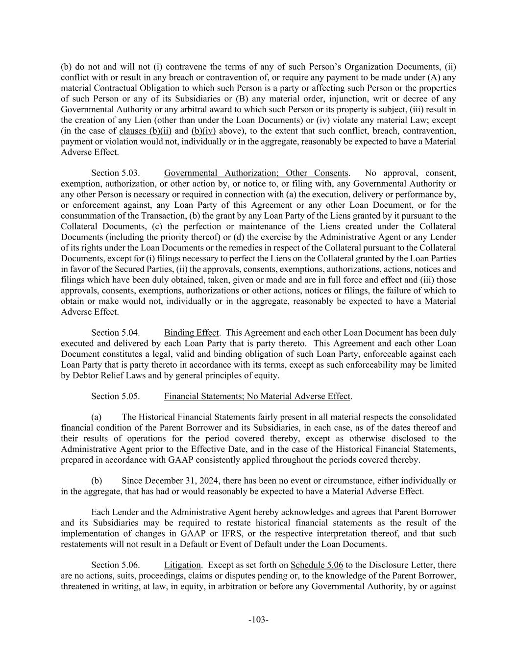 -103- (b) do not and will not (i) contravene the terms of any of such Person’s Organization Documents, (ii) conflict with or result in any breach or contravention of, or require any payment to be made under (A) any material Contractual Obligation to which such Person is a party or affecting such Person or the properties of such Person or any of its Subsidiaries or (B) any material order, injunction, writ or decree of any Governmental Authority or any arbitral award to which such Person or its property is subject, (iii) result in the creation of any Lien (other than under the Loan Documents) or (iv) violate any material Law; except (in the case of clauses (b)(ii) and (b)(iv) above), to the extent that such conflict, breach, contravention, payment or violation would not, individually or in the aggregate, reasonably be expected to have a Material Adverse Effect. Section 5.03. Governmental Authorization; Other Consents. No approval, consent, exemption, authorization, or other action by, or notice to, or filing with, any Governmental Authority or any other Person is necessary or required in connection with (a) the execution, delivery or performance by, or enforcement against, any Loan Party of this Agreement or any other Loan Document, or for the consummation of the Transaction, (b) the grant by any Loan Party of the Liens granted by it pursuant to the Collateral Documents, (c) the perfection or maintenance of the Liens created under the Collateral Documents (including the priority thereof) or (d) the exercise by the Administrative Agent or any Lender of its rights under the Loan Documents or the remedies in respect of the Collateral pursuant to the Collateral Documents, except for (i) filings necessary to perfect the Liens on the Collateral granted by the Loan Parties in favor of the Secured Parties, (ii) the approvals, consents, exemptions, authorizations, actions, notices and filings which have been duly obtained, taken, given or made and are in full force and effect and (iii) those approvals, consents, exemptions, authorizations or other actions, notices or filings, the failure of which to obtain or make would not, individually or in the aggregate, reasonably be expected to have a Material Adverse Effect. Section 5.04. Binding Effect. This Agreement and each other Loan Document has been duly executed and delivered by each Loan Party that is party thereto. This Agreement and each other Loan Document constitutes a legal, valid and binding obligation of such Loan Party, enforceable against each Loan Party that is party thereto in accordance with its terms, except as such enforceability may be limited by Debtor Relief Laws and by general principles of equity. Section 5.05. Financial Statements; No Material Adverse Effect. (a) The Historical Financial Statements fairly present in all material respects the consolidated financial condition of the Parent Borrower and its Subsidiaries, in each case, as of the dates thereof and their results of operations for the period covered thereby, except as otherwise disclosed to the Administrative Agent prior to the Effective Date, and in the case of the Historical Financial Statements, prepared in accordance with GAAP consistently applied throughout the periods covered thereby. (b) Since December 31, 2024, there has been no event or circumstance, either individually or in the aggregate, that has had or would reasonably be expected to have a Material Adverse Effect. Each Lender and the Administrative Agent hereby acknowledges and agrees that Parent Borrower and its Subsidiaries may be required to restate historical financial statements as the result of the implementation of changes in GAAP or IFRS, or the respective interpretation thereof, and that such restatements will not result in a Default or Event of Default under the Loan Documents. Section 5.06. Litigation. Except as set forth on Schedule 5.06 to the Disclosure Letter, there are no actions, suits, proceedings, claims or disputes pending or, to the knowledge of the Parent Borrower, threatened in writing, at law, in equity, in arbitration or before any Governmental Authority, by or against