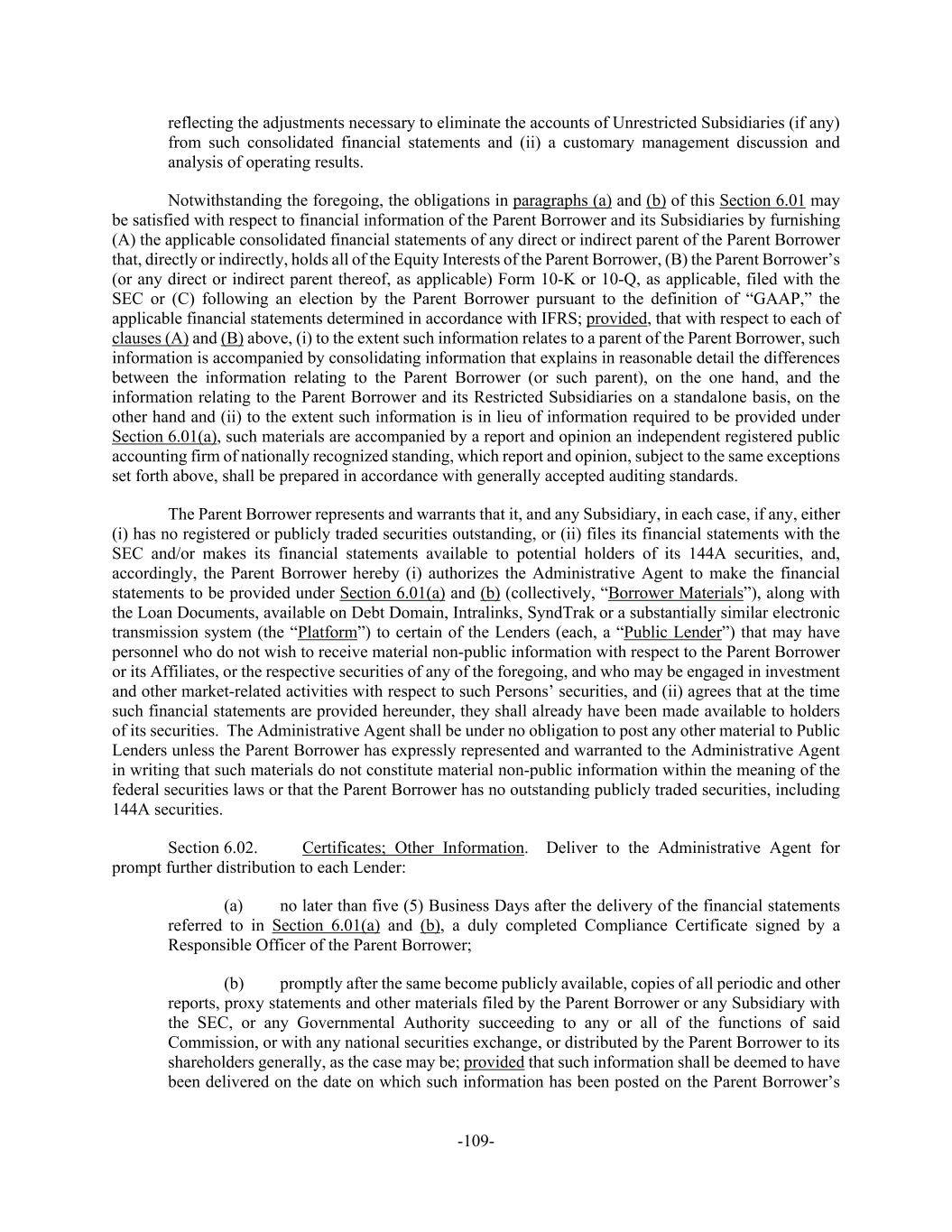 -109- reflecting the adjustments necessary to eliminate the accounts of Unrestricted Subsidiaries (if any) from such consolidated financial statements and (ii) a customary management discussion and analysis of operating results. Notwithstanding the foregoing, the obligations in paragraphs (a) and (b) of this Section 6.01 may be satisfied with respect to financial information of the Parent Borrower and its Subsidiaries by furnishing (A) the applicable consolidated financial statements of any direct or indirect parent of the Parent Borrower that, directly or indirectly, holds all of the Equity Interests of the Parent Borrower, (B) the Parent Borrower’s (or any direct or indirect parent thereof, as applicable) Form 10-K or 10-Q, as applicable, filed with the SEC or (C) following an election by the Parent Borrower pursuant to the definition of “GAAP,” the applicable financial statements determined in accordance with IFRS; provided, that with respect to each of clauses (A) and (B) above, (i) to the extent such information relates to a parent of the Parent Borrower, such information is accompanied by consolidating information that explains in reasonable detail the differences between the information relating to the Parent Borrower (or such parent), on the one hand, and the information relating to the Parent Borrower and its Restricted Subsidiaries on a standalone basis, on the other hand and (ii) to the extent such information is in lieu of information required to be provided under Section 6.01(a), such materials are accompanied by a report and opinion an independent registered public accounting firm of nationally recognized standing, which report and opinion, subject to the same exceptions set forth above, shall be prepared in accordance with generally accepted auditing standards. The Parent Borrower represents and warrants that it, and any Subsidiary, in each case, if any, either (i) has no registered or publicly traded securities outstanding, or (ii) files its financial statements with the SEC and/or makes its financial statements available to potential holders of its 144A securities, and, accordingly, the Parent Borrower hereby (i) authorizes the Administrative Agent to make the financial statements to be provided under Section 6.01(a) and (b) (collectively, “Borrower Materials”), along with the Loan Documents, available on Debt Domain, Intralinks, SyndTrak or a substantially similar electronic transmission system (the “Platform”) to certain of the Lenders (each, a “Public Lender”) that may have personnel who do not wish to receive material non-public information with respect to the Parent Borrower or its Affiliates, or the respective securities of any of the foregoing, and who may be engaged in investment and other market-related activities with respect to such Persons’ securities, and (ii) agrees that at the time such financial statements are provided hereunder, they shall already have been made available to holders of its securities. The Administrative Agent shall be under no obligation to post any other material to Public Lenders unless the Parent Borrower has expressly represented and warranted to the Administrative Agent in writing that such materials do not constitute material non-public information within the meaning of the federal securities laws or that the Parent Borrower has no outstanding publicly traded securities, including 144A securities. Section 6.02. Certificates; Other Information. Deliver to the Administrative Agent for prompt further distribution to each Lender: (a) no later than five (5) Business Days after the delivery of the financial statements referred to in Section 6.01(a) and (b), a duly completed Compliance Certificate signed by a Responsible Officer of the Parent Borrower; (b) promptly after the same become publicly available, copies of all periodic and other reports, proxy statements and other materials filed by the Parent Borrower or any Subsidiary with the SEC, or any Governmental Authority succeeding to any or all of the functions of said Commission, or with any national securities exchange, or distributed by the Parent Borrower to its shareholders generally, as the case may be; provided that such information shall be deemed to have been delivered on the date on which such information has been posted on the Parent Borrower’s