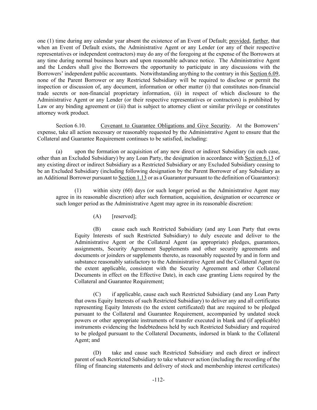 -112- one (1) time during any calendar year absent the existence of an Event of Default; provided, further, that when an Event of Default exists, the Administrative Agent or any Lender (or any of their respective representatives or independent contractors) may do any of the foregoing at the expense of the Borrowers at any time during normal business hours and upon reasonable advance notice. The Administrative Agent and the Lenders shall give the Borrowers the opportunity to participate in any discussions with the Borrowers’ independent public accountants. Notwithstanding anything to the contrary in this Section 6.09, none of the Parent Borrower or any Restricted Subsidiary will be required to disclose or permit the inspection or discussion of, any document, information or other matter (i) that constitutes non-financial trade secrets or non-financial proprietary information, (ii) in respect of which disclosure to the Administrative Agent or any Lender (or their respective representatives or contractors) is prohibited by Law or any binding agreement or (iii) that is subject to attorney client or similar privilege or constitutes attorney work product. Section 6.10. Covenant to Guarantee Obligations and Give Security. At the Borrowers’ expense, take all action necessary or reasonably requested by the Administrative Agent to ensure that the Collateral and Guarantee Requirement continues to be satisfied, including: (a) upon the formation or acquisition of any new direct or indirect Subsidiary (in each case, other than an Excluded Subsidiary) by any Loan Party, the designation in accordance with Section 6.13 of any existing direct or indirect Subsidiary as a Restricted Subsidiary or any Excluded Subsidiary ceasing to be an Excluded Subsidiary (including following designation by the Parent Borrower of any Subsidiary as an Additional Borrower pursuant to Section 1.13 or as a Guarantor pursuant to the definition of Guarantors): (1) within sixty (60) days (or such longer period as the Administrative Agent may agree in its reasonable discretion) after such formation, acquisition, designation or occurrence or such longer period as the Administrative Agent may agree in its reasonable discretion: (A) [reserved]; (B) cause each such Restricted Subsidiary (and any Loan Party that owns Equity Interests of such Restricted Subsidiary) to duly execute and deliver to the Administrative Agent or the Collateral Agent (as appropriate) pledges, guarantees, assignments, Security Agreement Supplements and other security agreements and documents or joinders or supplements thereto, as reasonably requested by and in form and substance reasonably satisfactory to the Administrative Agent and the Collateral Agent (to the extent applicable, consistent with the Security Agreement and other Collateral Documents in effect on the Effective Date), in each case granting Liens required by the Collateral and Guarantee Requirement; (C) if applicable, cause each such Restricted Subsidiary (and any Loan Party that owns Equity Interests of such Restricted Subsidiary) to deliver any and all certificates representing Equity Interests (to the extent certificated) that are required to be pledged pursuant to the Collateral and Guarantee Requirement, accompanied by undated stock powers or other appropriate instruments of transfer executed in blank and (if applicable) instruments evidencing the Indebtedness held by such Restricted Subsidiary and required to be pledged pursuant to the Collateral Documents, indorsed in blank to the Collateral Agent; and (D) take and cause such Restricted Subsidiary and each direct or indirect parent of such Restricted Subsidiary to take whatever action (including the recording of the filing of financing statements and delivery of stock and membership interest certificates)