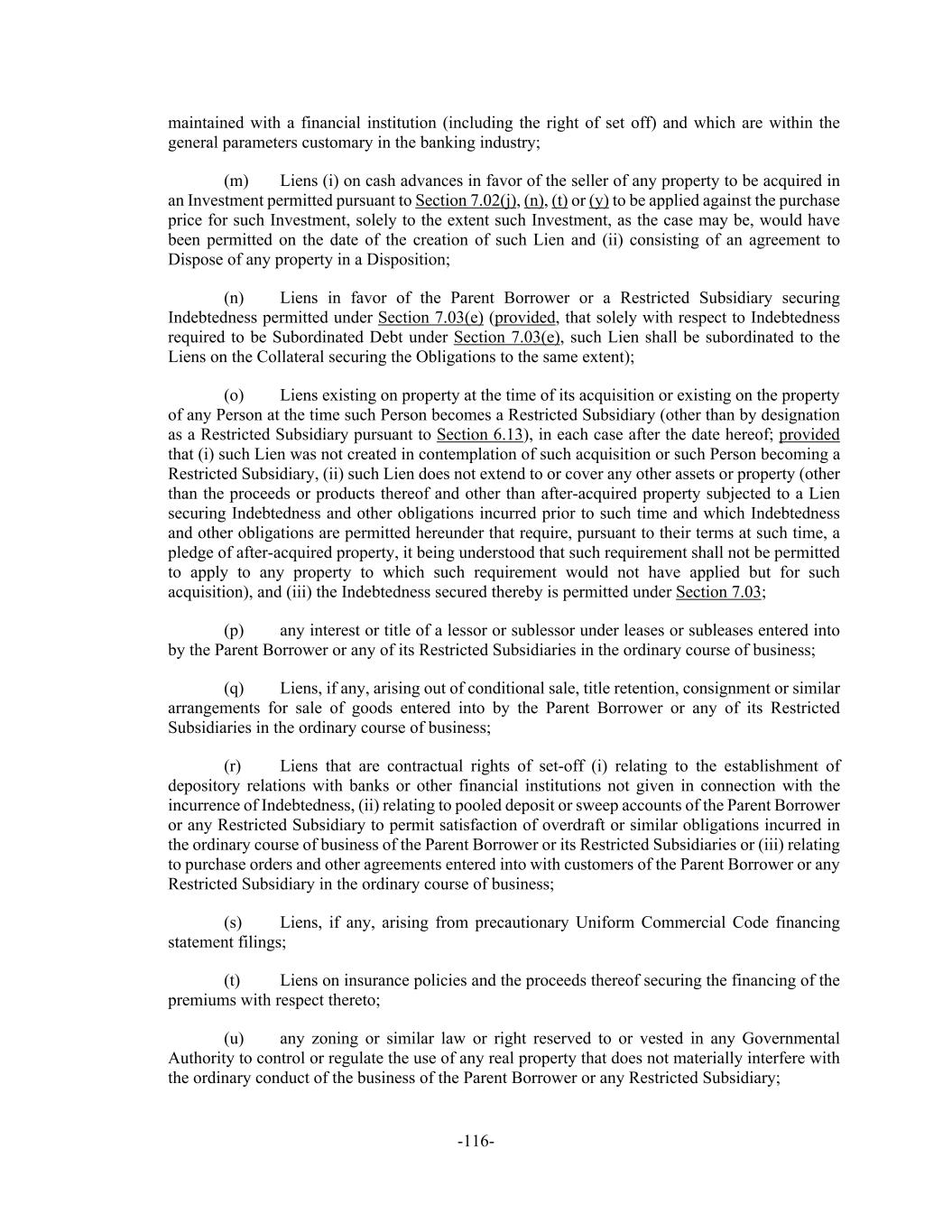 -116- maintained with a financial institution (including the right of set off) and which are within the general parameters customary in the banking industry; (m) Liens (i) on cash advances in favor of the seller of any property to be acquired in an Investment permitted pursuant to Section 7.02(j), (n), (t) or (y) to be applied against the purchase price for such Investment, solely to the extent such Investment, as the case may be, would have been permitted on the date of the creation of such Lien and (ii) consisting of an agreement to Dispose of any property in a Disposition; (n) Liens in favor of the Parent Borrower or a Restricted Subsidiary securing Indebtedness permitted under Section 7.03(e) (provided, that solely with respect to Indebtedness required to be Subordinated Debt under Section 7.03(e), such Lien shall be subordinated to the Liens on the Collateral securing the Obligations to the same extent); (o) Liens existing on property at the time of its acquisition or existing on the property of any Person at the time such Person becomes a Restricted Subsidiary (other than by designation as a Restricted Subsidiary pursuant to Section 6.13), in each case after the date hereof; provided that (i) such Lien was not created in contemplation of such acquisition or such Person becoming a Restricted Subsidiary, (ii) such Lien does not extend to or cover any other assets or property (other than the proceeds or products thereof and other than after-acquired property subjected to a Lien securing Indebtedness and other obligations incurred prior to such time and which Indebtedness and other obligations are permitted hereunder that require, pursuant to their terms at such time, a pledge of after-acquired property, it being understood that such requirement shall not be permitted to apply to any property to which such requirement would not have applied but for such acquisition), and (iii) the Indebtedness secured thereby is permitted under Section 7.03; (p) any interest or title of a lessor or sublessor under leases or subleases entered into by the Parent Borrower or any of its Restricted Subsidiaries in the ordinary course of business; (q) Liens, if any, arising out of conditional sale, title retention, consignment or similar arrangements for sale of goods entered into by the Parent Borrower or any of its Restricted Subsidiaries in the ordinary course of business; (r) Liens that are contractual rights of set-off (i) relating to the establishment of depository relations with banks or other financial institutions not given in connection with the incurrence of Indebtedness, (ii) relating to pooled deposit or sweep accounts of the Parent Borrower or any Restricted Subsidiary to permit satisfaction of overdraft or similar obligations incurred in the ordinary course of business of the Parent Borrower or its Restricted Subsidiaries or (iii) relating to purchase orders and other agreements entered into with customers of the Parent Borrower or any Restricted Subsidiary in the ordinary course of business; (s) Liens, if any, arising from precautionary Uniform Commercial Code financing statement filings; (t) Liens on insurance policies and the proceeds thereof securing the financing of the premiums with respect thereto; (u) any zoning or similar law or right reserved to or vested in any Governmental Authority to control or regulate the use of any real property that does not materially interfere with the ordinary conduct of the business of the Parent Borrower or any Restricted Subsidiary;