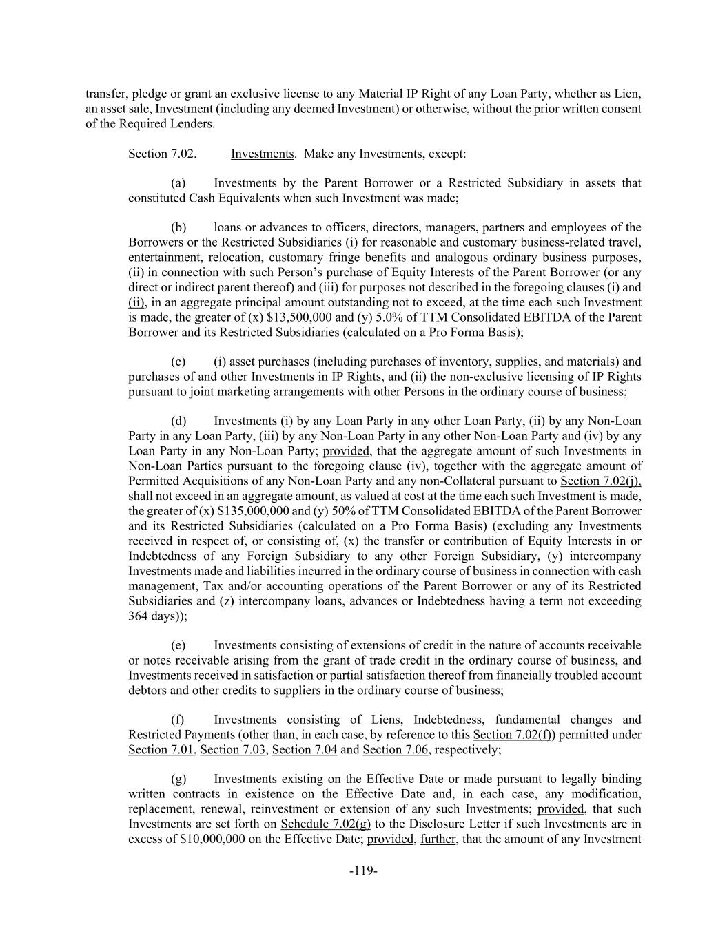 -119- transfer, pledge or grant an exclusive license to any Material IP Right of any Loan Party, whether as Lien, an asset sale, Investment (including any deemed Investment) or otherwise, without the prior written consent of the Required Lenders. Section 7.02. Investments. Make any Investments, except: (a) Investments by the Parent Borrower or a Restricted Subsidiary in assets that constituted Cash Equivalents when such Investment was made; (b) loans or advances to officers, directors, managers, partners and employees of the Borrowers or the Restricted Subsidiaries (i) for reasonable and customary business-related travel, entertainment, relocation, customary fringe benefits and analogous ordinary business purposes, (ii) in connection with such Person’s purchase of Equity Interests of the Parent Borrower (or any direct or indirect parent thereof) and (iii) for purposes not described in the foregoing clauses (i) and (ii), in an aggregate principal amount outstanding not to exceed, at the time each such Investment is made, the greater of (x) $13,500,000 and (y) 5.0% of TTM Consolidated EBITDA of the Parent Borrower and its Restricted Subsidiaries (calculated on a Pro Forma Basis); (c) (i) asset purchases (including purchases of inventory, supplies, and materials) and purchases of and other Investments in IP Rights, and (ii) the non-exclusive licensing of IP Rights pursuant to joint marketing arrangements with other Persons in the ordinary course of business; (d) Investments (i) by any Loan Party in any other Loan Party, (ii) by any Non-Loan Party in any Loan Party, (iii) by any Non-Loan Party in any other Non-Loan Party and (iv) by any Loan Party in any Non-Loan Party; provided, that the aggregate amount of such Investments in Non-Loan Parties pursuant to the foregoing clause (iv), together with the aggregate amount of Permitted Acquisitions of any Non-Loan Party and any non-Collateral pursuant to Section 7.02(j), shall not exceed in an aggregate amount, as valued at cost at the time each such Investment is made, the greater of (x) $135,000,000 and (y) 50% of TTM Consolidated EBITDA of the Parent Borrower and its Restricted Subsidiaries (calculated on a Pro Forma Basis) (excluding any Investments received in respect of, or consisting of, (x) the transfer or contribution of Equity Interests in or Indebtedness of any Foreign Subsidiary to any other Foreign Subsidiary, (y) intercompany Investments made and liabilities incurred in the ordinary course of business in connection with cash management, Tax and/or accounting operations of the Parent Borrower or any of its Restricted Subsidiaries and (z) intercompany loans, advances or Indebtedness having a term not exceeding 364 days)); (e) Investments consisting of extensions of credit in the nature of accounts receivable or notes receivable arising from the grant of trade credit in the ordinary course of business, and Investments received in satisfaction or partial satisfaction thereof from financially troubled account debtors and other credits to suppliers in the ordinary course of business; (f) Investments consisting of Liens, Indebtedness, fundamental changes and Restricted Payments (other than, in each case, by reference to this Section 7.02(f)) permitted under Section 7.01, Section 7.03, Section 7.04 and Section 7.06, respectively; (g) Investments existing on the Effective Date or made pursuant to legally binding written contracts in existence on the Effective Date and, in each case, any modification, replacement, renewal, reinvestment or extension of any such Investments; provided, that such Investments are set forth on Schedule 7.02(g) to the Disclosure Letter if such Investments are in excess of $10,000,000 on the Effective Date; provided, further, that the amount of any Investment