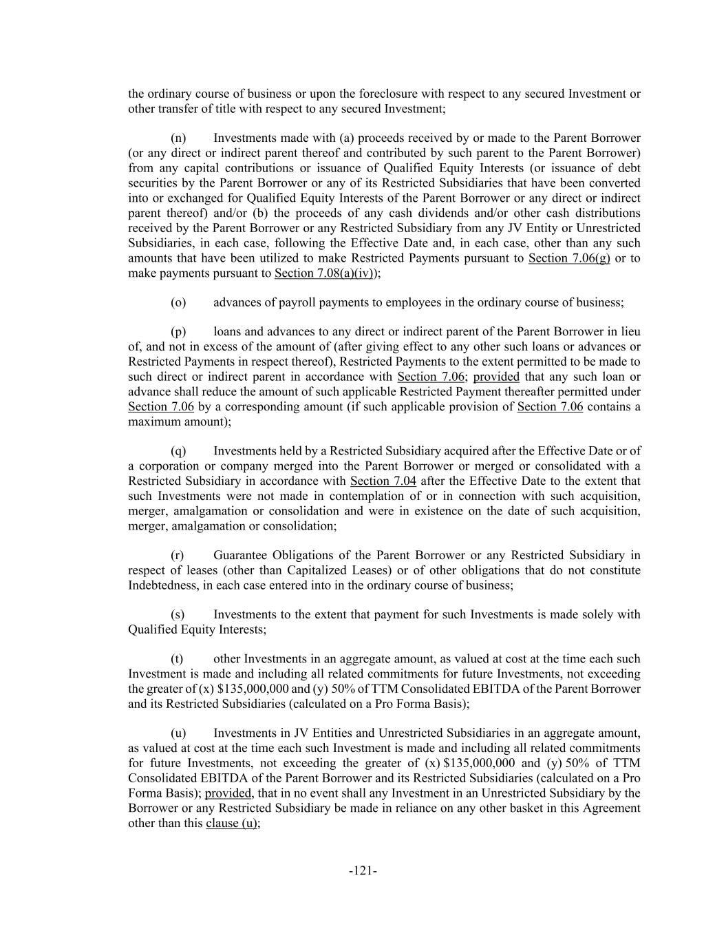 -121- the ordinary course of business or upon the foreclosure with respect to any secured Investment or other transfer of title with respect to any secured Investment; (n) Investments made with (a) proceeds received by or made to the Parent Borrower (or any direct or indirect parent thereof and contributed by such parent to the Parent Borrower) from any capital contributions or issuance of Qualified Equity Interests (or issuance of debt securities by the Parent Borrower or any of its Restricted Subsidiaries that have been converted into or exchanged for Qualified Equity Interests of the Parent Borrower or any direct or indirect parent thereof) and/or (b) the proceeds of any cash dividends and/or other cash distributions received by the Parent Borrower or any Restricted Subsidiary from any JV Entity or Unrestricted Subsidiaries, in each case, following the Effective Date and, in each case, other than any such amounts that have been utilized to make Restricted Payments pursuant to Section 7.06(g) or to make payments pursuant to Section 7.08(a)(iv)); (o) advances of payroll payments to employees in the ordinary course of business; (p) loans and advances to any direct or indirect parent of the Parent Borrower in lieu of, and not in excess of the amount of (after giving effect to any other such loans or advances or Restricted Payments in respect thereof), Restricted Payments to the extent permitted to be made to such direct or indirect parent in accordance with Section 7.06; provided that any such loan or advance shall reduce the amount of such applicable Restricted Payment thereafter permitted under Section 7.06 by a corresponding amount (if such applicable provision of Section 7.06 contains a maximum amount); (q) Investments held by a Restricted Subsidiary acquired after the Effective Date or of a corporation or company merged into the Parent Borrower or merged or consolidated with a Restricted Subsidiary in accordance with Section 7.04 after the Effective Date to the extent that such Investments were not made in contemplation of or in connection with such acquisition, merger, amalgamation or consolidation and were in existence on the date of such acquisition, merger, amalgamation or consolidation; (r) Guarantee Obligations of the Parent Borrower or any Restricted Subsidiary in respect of leases (other than Capitalized Leases) or of other obligations that do not constitute Indebtedness, in each case entered into in the ordinary course of business; (s) Investments to the extent that payment for such Investments is made solely with Qualified Equity Interests; (t) other Investments in an aggregate amount, as valued at cost at the time each such Investment is made and including all related commitments for future Investments, not exceeding the greater of (x) $135,000,000 and (y) 50% of TTM Consolidated EBITDA of the Parent Borrower and its Restricted Subsidiaries (calculated on a Pro Forma Basis); (u) Investments in JV Entities and Unrestricted Subsidiaries in an aggregate amount, as valued at cost at the time each such Investment is made and including all related commitments for future Investments, not exceeding the greater of (x) $135,000,000 and (y) 50% of TTM Consolidated EBITDA of the Parent Borrower and its Restricted Subsidiaries (calculated on a Pro Forma Basis); provided, that in no event shall any Investment in an Unrestricted Subsidiary by the Borrower or any Restricted Subsidiary be made in reliance on any other basket in this Agreement other than this clause (u);