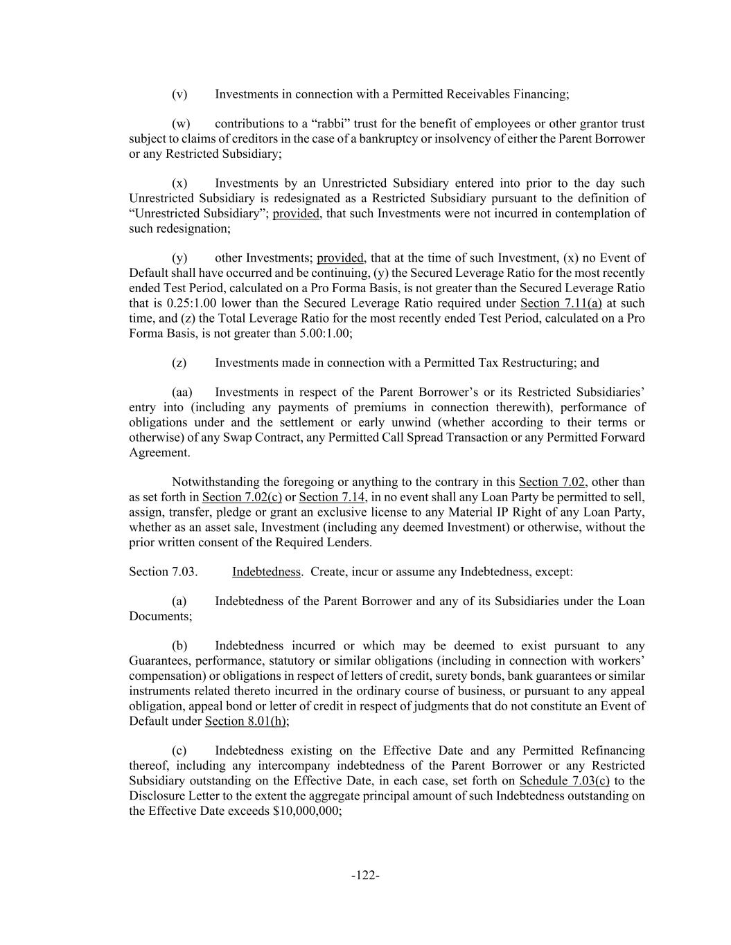 -122- (v) Investments in connection with a Permitted Receivables Financing; (w) contributions to a “rabbi” trust for the benefit of employees or other grantor trust subject to claims of creditors in the case of a bankruptcy or insolvency of either the Parent Borrower or any Restricted Subsidiary; (x) Investments by an Unrestricted Subsidiary entered into prior to the day such Unrestricted Subsidiary is redesignated as a Restricted Subsidiary pursuant to the definition of “Unrestricted Subsidiary”; provided, that such Investments were not incurred in contemplation of such redesignation; (y) other Investments; provided, that at the time of such Investment, (x) no Event of Default shall have occurred and be continuing, (y) the Secured Leverage Ratio for the most recently ended Test Period, calculated on a Pro Forma Basis, is not greater than the Secured Leverage Ratio that is 0.25:1.00 lower than the Secured Leverage Ratio required under Section 7.11(a) at such time, and (z) the Total Leverage Ratio for the most recently ended Test Period, calculated on a Pro Forma Basis, is not greater than 5.00:1.00; (z) Investments made in connection with a Permitted Tax Restructuring; and (aa) Investments in respect of the Parent Borrower’s or its Restricted Subsidiaries’ entry into (including any payments of premiums in connection therewith), performance of obligations under and the settlement or early unwind (whether according to their terms or otherwise) of any Swap Contract, any Permitted Call Spread Transaction or any Permitted Forward Agreement. Notwithstanding the foregoing or anything to the contrary in this Section 7.02, other than as set forth in Section 7.02(c) or Section 7.14, in no event shall any Loan Party be permitted to sell, assign, transfer, pledge or grant an exclusive license to any Material IP Right of any Loan Party, whether as an asset sale, Investment (including any deemed Investment) or otherwise, without the prior written consent of the Required Lenders. Section 7.03. Indebtedness. Create, incur or assume any Indebtedness, except: (a) Indebtedness of the Parent Borrower and any of its Subsidiaries under the Loan Documents; (b) Indebtedness incurred or which may be deemed to exist pursuant to any Guarantees, performance, statutory or similar obligations (including in connection with workers’ compensation) or obligations in respect of letters of credit, surety bonds, bank guarantees or similar instruments related thereto incurred in the ordinary course of business, or pursuant to any appeal obligation, appeal bond or letter of credit in respect of judgments that do not constitute an Event of Default under Section 8.01(h); (c) Indebtedness existing on the Effective Date and any Permitted Refinancing thereof, including any intercompany indebtedness of the Parent Borrower or any Restricted Subsidiary outstanding on the Effective Date, in each case, set forth on Schedule 7.03(c) to the Disclosure Letter to the extent the aggregate principal amount of such Indebtedness outstanding on the Effective Date exceeds $10,000,000;