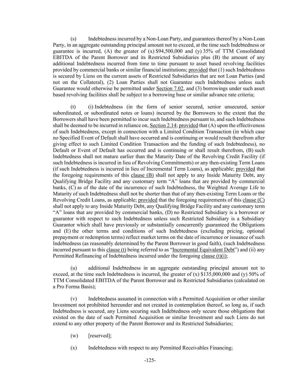 -125- (s) Indebtedness incurred by a Non-Loan Party, and guarantees thereof by a Non-Loan Party, in an aggregate outstanding principal amount not to exceed, at the time such Indebtedness or guarantee is incurred, (A) the greater of (x) $94,500,000 and (y) 35% of TTM Consolidated EBITDA of the Parent Borrower and its Restricted Subsidiaries plus (B) the amount of any additional Indebtedness incurred from time to time pursuant to asset based revolving facilities provided by commercial banks or similar financial institutions; provided that (1) such Indebtedness is secured by Liens on the current assets of Restricted Subsidiaries that are not Loan Parties (and not on the Collateral), (2) Loan Parties shall not Guarantee such Indebtedness unless such Guarantee would otherwise be permitted under Section 7.02, and (3) borrowings under such asset based revolving facilities shall be subject to a borrowing base or similar advance rate criteria; (t) (i) Indebtedness (in the form of senior secured, senior unsecured, senior subordinated, or subordinated notes or loans) incurred by the Borrowers to the extent that the Borrowers shall have been permitted to incur such Indebtedness pursuant to, and such Indebtedness shall be deemed to be incurred in reliance on, Section 2.14; provided that (A) upon the effectiveness of such Indebtedness, except in connection with a Limited Condition Transaction (in which case no Specified Event of Default shall have occurred and is continuing or would result therefrom after giving effect to such Limited Condition Transaction and the funding of such Indebtedness), no Default or Event of Default has occurred and is continuing or shall result therefrom, (B) such Indebtedness shall not mature earlier than the Maturity Date of the Revolving Credit Facility (if such Indebtedness is incurred in lieu of Revolving Commitments) or any then-existing Term Loans (if such Indebtedness is incurred in lieu of Incremental Term Loans), as applicable; provided that the foregoing requirements of this clause (B) shall not apply to any Inside Maturity Debt, any Qualifying Bridge Facility and any customary term “A” loans that are provided by commercial banks, (C) as of the date of the incurrence of such Indebtedness, the Weighted Average Life to Maturity of such Indebtedness shall not be shorter than that of any then-existing Term Loans or the Revolving Credit Loans, as applicable; provided that the foregoing requirements of this clause (C) shall not apply to any Inside Maturity Debt, any Qualifying Bridge Facility and any customary term “A” loans that are provided by commercial banks, (D) no Restricted Subsidiary is a borrower or guarantor with respect to such Indebtedness unless such Restricted Subsidiary is a Subsidiary Guarantor which shall have previously or substantially concurrently guaranteed the Obligations and (E) the other terms and conditions of such Indebtedness (excluding pricing, optional prepayment or redemption terms) reflect market terms on the date of incurrence or issuance of such Indebtedness (as reasonably determined by the Parent Borrower in good faith), (such Indebtedness incurred pursuant to this clause (t) being referred to as “Incremental Equivalent Debt”) and (ii) any Permitted Refinancing of Indebtedness incurred under the foregoing clause (t)(i); (u) additional Indebtedness in an aggregate outstanding principal amount not to exceed, at the time such Indebtedness is incurred, the greater of (x) $135,000,000 and (y) 50% of TTM Consolidated EBITDA of the Parent Borrower and its Restricted Subsidiaries (calculated on a Pro Forma Basis); (v) Indebtedness assumed in connection with a Permitted Acquisition or other similar Investment not prohibited hereunder and not created in contemplation thereof, so long as, if such Indebtedness is secured, any Liens securing such Indebtedness only secure those obligations that existed on the date of such Permitted Acquisition or similar Investment and such Liens do not extend to any other property of the Parent Borrower and its Restricted Subsidiaries; (w) [reserved]; (x) Indebtedness with respect to any Permitted Receivables Financing;