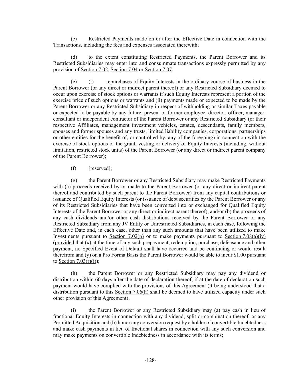-128- (c) Restricted Payments made on or after the Effective Date in connection with the Transactions, including the fees and expenses associated therewith; (d) to the extent constituting Restricted Payments, the Parent Borrower and its Restricted Subsidiaries may enter into and consummate transactions expressly permitted by any provision of Section 7.02, Section 7.04 or Section 7.07; (e) (i) repurchases of Equity Interests in the ordinary course of business in the Parent Borrower (or any direct or indirect parent thereof) or any Restricted Subsidiary deemed to occur upon exercise of stock options or warrants if such Equity Interests represent a portion of the exercise price of such options or warrants and (ii) payments made or expected to be made by the Parent Borrower or any Restricted Subsidiary in respect of withholding or similar Taxes payable or expected to be payable by any future, present or former employee, director, officer, manager, consultant or independent contractor of the Parent Borrower or any Restricted Subsidiary (or their respective Affiliates, management investment vehicles, estates, descendants, family members, spouses and former spouses and any trusts, limited liability companies, corporations, partnerships or other entities for the benefit of, or controlled by, any of the foregoing) in connection with the exercise of stock options or the grant, vesting or delivery of Equity Interests (including, without limitation, restricted stock units) of the Parent Borrower (or any direct or indirect parent company of the Parent Borrower); (f) [reserved]; (g) the Parent Borrower or any Restricted Subsidiary may make Restricted Payments with (a) proceeds received by or made to the Parent Borrower (or any direct or indirect parent thereof and contributed by such parent to the Parent Borrower) from any capital contributions or issuance of Qualified Equity Interests (or issuance of debt securities by the Parent Borrower or any of its Restricted Subsidiaries that have been converted into or exchanged for Qualified Equity Interests of the Parent Borrower or any direct or indirect parent thereof), and/or (b) the proceeds of any cash dividends and/or other cash distributions received by the Parent Borrower or any Restricted Subsidiary from any JV Entity or Unrestricted Subsidiaries, in each case, following the Effective Date and, in each case, other than any such amounts that have been utilized to make Investments pursuant to Section 7.02(n) or to make payments pursuant to Section 7.08(a)(iv) (provided that (x) at the time of any such prepayment, redemption, purchase, defeasance and other payment, no Specified Event of Default shall have occurred and be continuing or would result therefrom and (y) on a Pro Forma Basis the Parent Borrower would be able to incur $1.00 pursuant to Section 7.03(r)(i)); (h) the Parent Borrower or any Restricted Subsidiary may pay any dividend or distribution within 60 days after the date of declaration thereof, if at the date of declaration such payment would have complied with the provisions of this Agreement (it being understood that a distribution pursuant to this Section 7.06(h) shall be deemed to have utilized capacity under such other provision of this Agreement); (i) the Parent Borrower or any Restricted Subsidiary may (a) pay cash in lieu of fractional Equity Interests in connection with any dividend, split or combination thereof, or any Permitted Acquisition and (b) honor any conversion request by a holder of convertible Indebtedness and make cash payments in lieu of fractional shares in connection with any such conversion and may make payments on convertible Indebtedness in accordance with its terms;