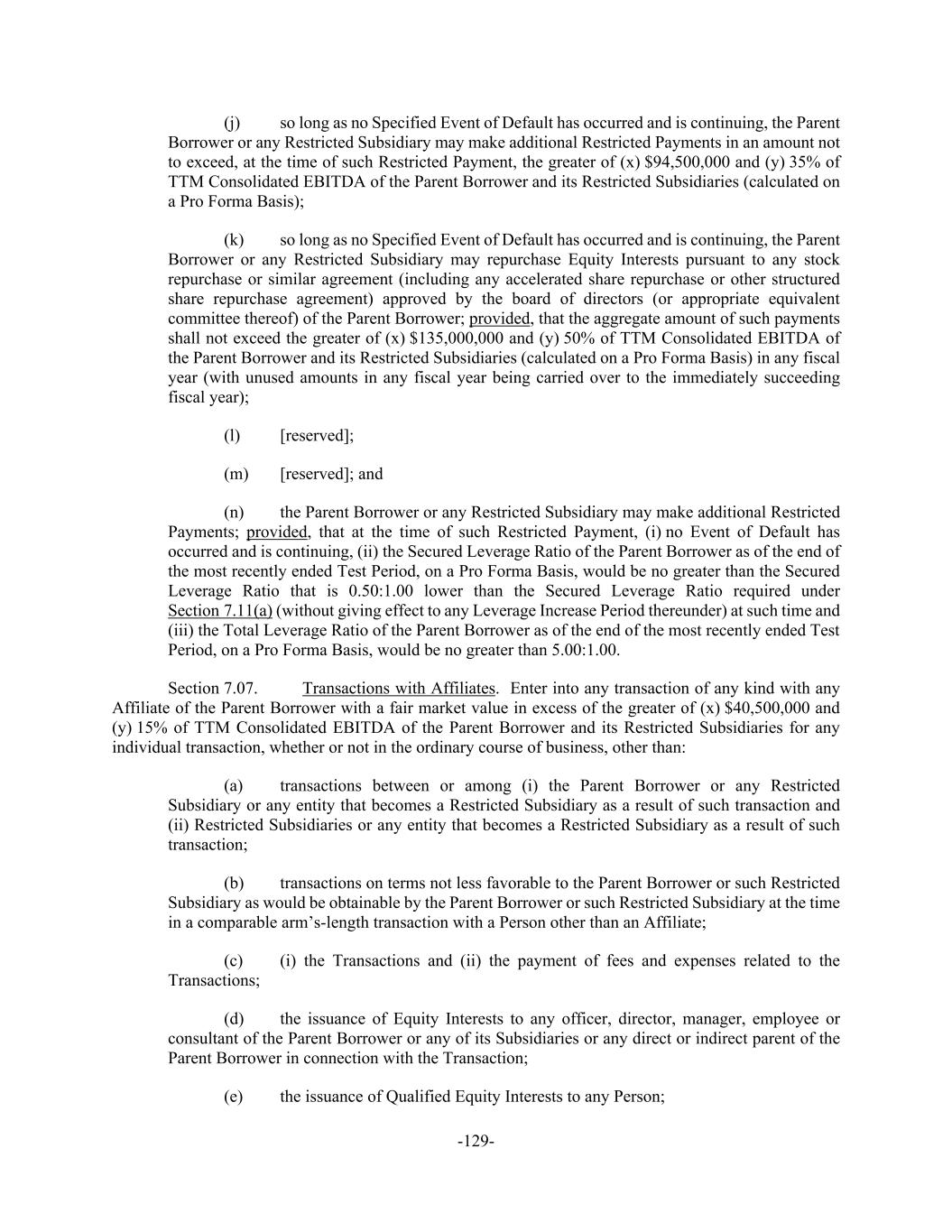 -129- (j) so long as no Specified Event of Default has occurred and is continuing, the Parent Borrower or any Restricted Subsidiary may make additional Restricted Payments in an amount not to exceed, at the time of such Restricted Payment, the greater of (x) $94,500,000 and (y) 35% of TTM Consolidated EBITDA of the Parent Borrower and its Restricted Subsidiaries (calculated on a Pro Forma Basis); (k) so long as no Specified Event of Default has occurred and is continuing, the Parent Borrower or any Restricted Subsidiary may repurchase Equity Interests pursuant to any stock repurchase or similar agreement (including any accelerated share repurchase or other structured share repurchase agreement) approved by the board of directors (or appropriate equivalent committee thereof) of the Parent Borrower; provided, that the aggregate amount of such payments shall not exceed the greater of (x) $135,000,000 and (y) 50% of TTM Consolidated EBITDA of the Parent Borrower and its Restricted Subsidiaries (calculated on a Pro Forma Basis) in any fiscal year (with unused amounts in any fiscal year being carried over to the immediately succeeding fiscal year); (l) [reserved]; (m) [reserved]; and (n) the Parent Borrower or any Restricted Subsidiary may make additional Restricted Payments; provided, that at the time of such Restricted Payment, (i) no Event of Default has occurred and is continuing, (ii) the Secured Leverage Ratio of the Parent Borrower as of the end of the most recently ended Test Period, on a Pro Forma Basis, would be no greater than the Secured Leverage Ratio that is 0.50:1.00 lower than the Secured Leverage Ratio required under Section 7.11(a) (without giving effect to any Leverage Increase Period thereunder) at such time and (iii) the Total Leverage Ratio of the Parent Borrower as of the end of the most recently ended Test Period, on a Pro Forma Basis, would be no greater than 5.00:1.00. Section 7.07. Transactions with Affiliates. Enter into any transaction of any kind with any Affiliate of the Parent Borrower with a fair market value in excess of the greater of (x) $40,500,000 and (y) 15% of TTM Consolidated EBITDA of the Parent Borrower and its Restricted Subsidiaries for any individual transaction, whether or not in the ordinary course of business, other than: (a) transactions between or among (i) the Parent Borrower or any Restricted Subsidiary or any entity that becomes a Restricted Subsidiary as a result of such transaction and (ii) Restricted Subsidiaries or any entity that becomes a Restricted Subsidiary as a result of such transaction; (b) transactions on terms not less favorable to the Parent Borrower or such Restricted Subsidiary as would be obtainable by the Parent Borrower or such Restricted Subsidiary at the time in a comparable arm’s-length transaction with a Person other than an Affiliate; (c) (i) the Transactions and (ii) the payment of fees and expenses related to the Transactions; (d) the issuance of Equity Interests to any officer, director, manager, employee or consultant of the Parent Borrower or any of its Subsidiaries or any direct or indirect parent of the Parent Borrower in connection with the Transaction; (e) the issuance of Qualified Equity Interests to any Person;