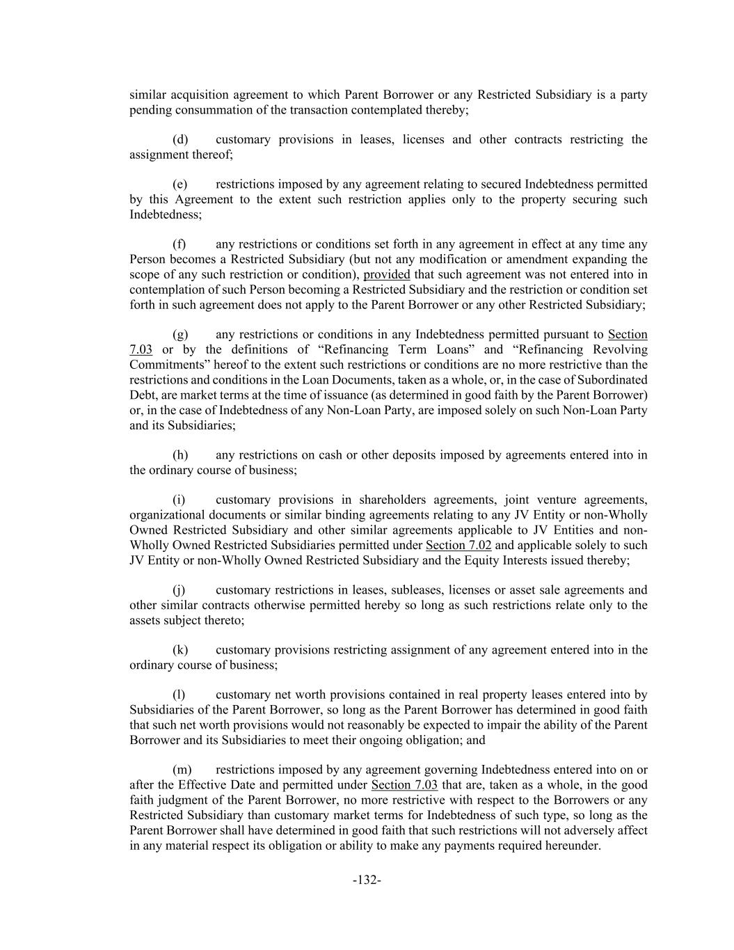 -132- similar acquisition agreement to which Parent Borrower or any Restricted Subsidiary is a party pending consummation of the transaction contemplated thereby; (d) customary provisions in leases, licenses and other contracts restricting the assignment thereof; (e) restrictions imposed by any agreement relating to secured Indebtedness permitted by this Agreement to the extent such restriction applies only to the property securing such Indebtedness; (f) any restrictions or conditions set forth in any agreement in effect at any time any Person becomes a Restricted Subsidiary (but not any modification or amendment expanding the scope of any such restriction or condition), provided that such agreement was not entered into in contemplation of such Person becoming a Restricted Subsidiary and the restriction or condition set forth in such agreement does not apply to the Parent Borrower or any other Restricted Subsidiary; (g) any restrictions or conditions in any Indebtedness permitted pursuant to Section 7.03 or by the definitions of “Refinancing Term Loans” and “Refinancing Revolving Commitments” hereof to the extent such restrictions or conditions are no more restrictive than the restrictions and conditions in the Loan Documents, taken as a whole, or, in the case of Subordinated Debt, are market terms at the time of issuance (as determined in good faith by the Parent Borrower) or, in the case of Indebtedness of any Non-Loan Party, are imposed solely on such Non-Loan Party and its Subsidiaries; (h) any restrictions on cash or other deposits imposed by agreements entered into in the ordinary course of business; (i) customary provisions in shareholders agreements, joint venture agreements, organizational documents or similar binding agreements relating to any JV Entity or non-Wholly Owned Restricted Subsidiary and other similar agreements applicable to JV Entities and non- Wholly Owned Restricted Subsidiaries permitted under Section 7.02 and applicable solely to such JV Entity or non-Wholly Owned Restricted Subsidiary and the Equity Interests issued thereby; (j) customary restrictions in leases, subleases, licenses or asset sale agreements and other similar contracts otherwise permitted hereby so long as such restrictions relate only to the assets subject thereto; (k) customary provisions restricting assignment of any agreement entered into in the ordinary course of business; (l) customary net worth provisions contained in real property leases entered into by Subsidiaries of the Parent Borrower, so long as the Parent Borrower has determined in good faith that such net worth provisions would not reasonably be expected to impair the ability of the Parent Borrower and its Subsidiaries to meet their ongoing obligation; and (m) restrictions imposed by any agreement governing Indebtedness entered into on or after the Effective Date and permitted under Section 7.03 that are, taken as a whole, in the good faith judgment of the Parent Borrower, no more restrictive with respect to the Borrowers or any Restricted Subsidiary than customary market terms for Indebtedness of such type, so long as the Parent Borrower shall have determined in good faith that such restrictions will not adversely affect in any material respect its obligation or ability to make any payments required hereunder.