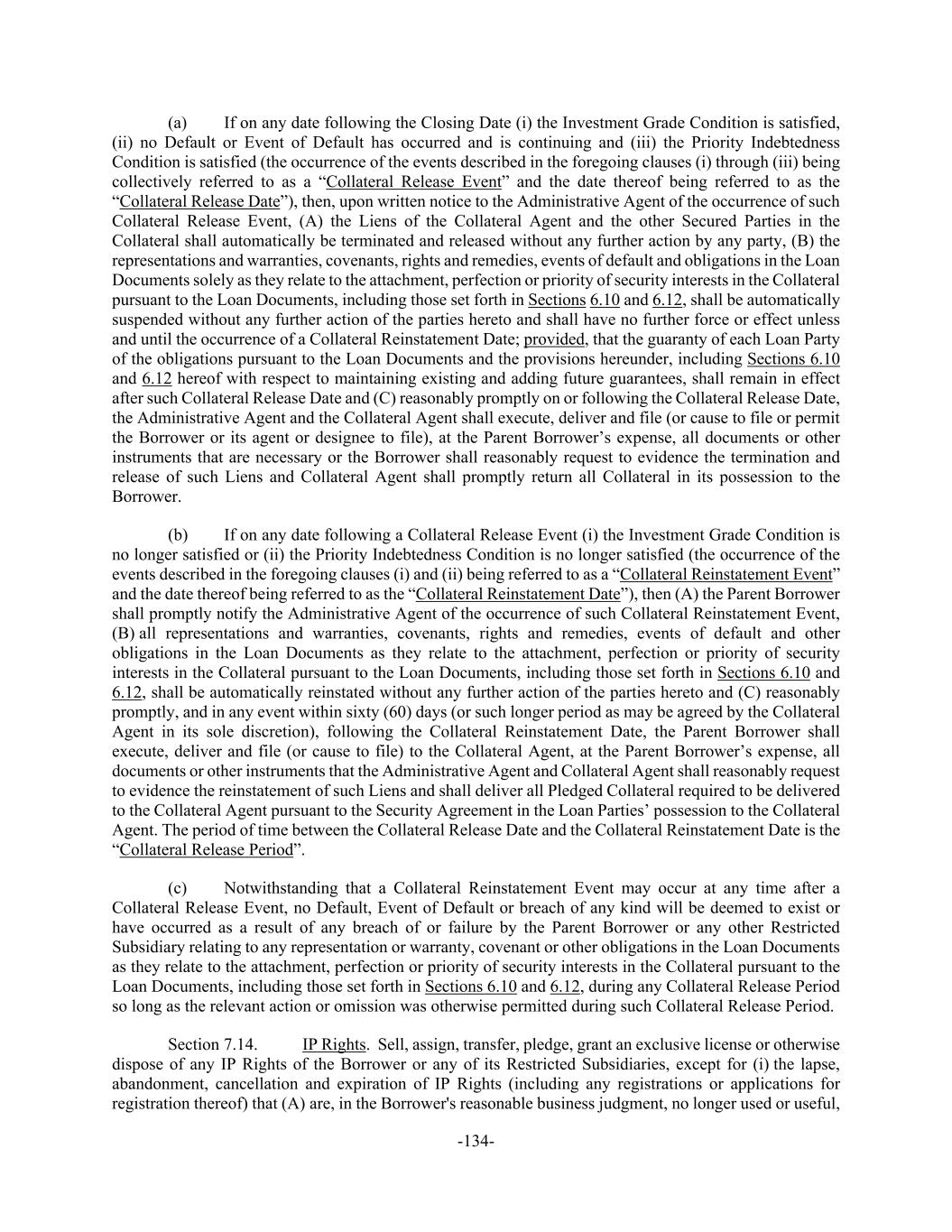 -134- (a) If on any date following the Closing Date (i) the Investment Grade Condition is satisfied, (ii) no Default or Event of Default has occurred and is continuing and (iii) the Priority Indebtedness Condition is satisfied (the occurrence of the events described in the foregoing clauses (i) through (iii) being collectively referred to as a “Collateral Release Event” and the date thereof being referred to as the “Collateral Release Date”), then, upon written notice to the Administrative Agent of the occurrence of such Collateral Release Event, (A) the Liens of the Collateral Agent and the other Secured Parties in the Collateral shall automatically be terminated and released without any further action by any party, (B) the representations and warranties, covenants, rights and remedies, events of default and obligations in the Loan Documents solely as they relate to the attachment, perfection or priority of security interests in the Collateral pursuant to the Loan Documents, including those set forth in Sections 6.10 and 6.12, shall be automatically suspended without any further action of the parties hereto and shall have no further force or effect unless and until the occurrence of a Collateral Reinstatement Date; provided, that the guaranty of each Loan Party of the obligations pursuant to the Loan Documents and the provisions hereunder, including Sections 6.10 and 6.12 hereof with respect to maintaining existing and adding future guarantees, shall remain in effect after such Collateral Release Date and (C) reasonably promptly on or following the Collateral Release Date, the Administrative Agent and the Collateral Agent shall execute, deliver and file (or cause to file or permit the Borrower or its agent or designee to file), at the Parent Borrower’s expense, all documents or other instruments that are necessary or the Borrower shall reasonably request to evidence the termination and release of such Liens and Collateral Agent shall promptly return all Collateral in its possession to the Borrower. (b) If on any date following a Collateral Release Event (i) the Investment Grade Condition is no longer satisfied or (ii) the Priority Indebtedness Condition is no longer satisfied (the occurrence of the events described in the foregoing clauses (i) and (ii) being referred to as a “Collateral Reinstatement Event” and the date thereof being referred to as the “Collateral Reinstatement Date”), then (A) the Parent Borrower shall promptly notify the Administrative Agent of the occurrence of such Collateral Reinstatement Event, (B) all representations and warranties, covenants, rights and remedies, events of default and other obligations in the Loan Documents as they relate to the attachment, perfection or priority of security interests in the Collateral pursuant to the Loan Documents, including those set forth in Sections 6.10 and 6.12, shall be automatically reinstated without any further action of the parties hereto and (C) reasonably promptly, and in any event within sixty (60) days (or such longer period as may be agreed by the Collateral Agent in its sole discretion), following the Collateral Reinstatement Date, the Parent Borrower shall execute, deliver and file (or cause to file) to the Collateral Agent, at the Parent Borrower’s expense, all documents or other instruments that the Administrative Agent and Collateral Agent shall reasonably request to evidence the reinstatement of such Liens and shall deliver all Pledged Collateral required to be delivered to the Collateral Agent pursuant to the Security Agreement in the Loan Parties’ possession to the Collateral Agent. The period of time between the Collateral Release Date and the Collateral Reinstatement Date is the “Collateral Release Period”. (c) Notwithstanding that a Collateral Reinstatement Event may occur at any time after a Collateral Release Event, no Default, Event of Default or breach of any kind will be deemed to exist or have occurred as a result of any breach of or failure by the Parent Borrower or any other Restricted Subsidiary relating to any representation or warranty, covenant or other obligations in the Loan Documents as they relate to the attachment, perfection or priority of security interests in the Collateral pursuant to the Loan Documents, including those set forth in Sections 6.10 and 6.12, during any Collateral Release Period so long as the relevant action or omission was otherwise permitted during such Collateral Release Period. Section 7.14. IP Rights. Sell, assign, transfer, pledge, grant an exclusive license or otherwise dispose of any IP Rights of the Borrower or any of its Restricted Subsidiaries, except for (i) the lapse, abandonment, cancellation and expiration of IP Rights (including any registrations or applications for registration thereof) that (A) are, in the Borrower's reasonable business judgment, no longer used or useful,